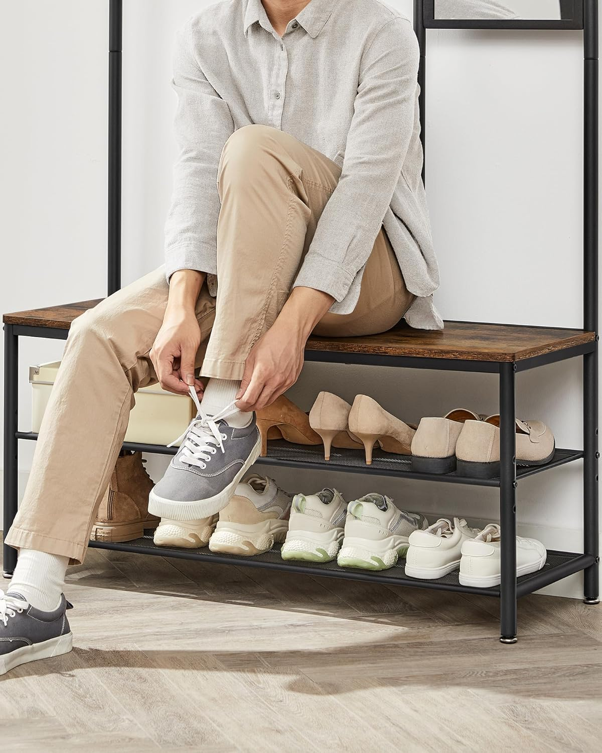 Culoare: Maro rustic+negru Marca: VASAGLE Dimensiune: 35 x 98 x 180 cm Adancimea articolului: 35.0 cm Dimensiunile articolului: L x l x i 35 x 98 x 180 cm Despre acest articol Ranger 4 in 1: Acest cuier de intrare multifunctional are 7 carlige, o banca lunga de 98 cm, 2 rafturi si 1 oglinda. Puneti tot ce aveti nevoie inainte de a iesi pe usa - haine, genti, palarii si pantofi - pe acest cuier 4 in 1.Oglinda de 80 x 30 cm poate fi montata la stanga sau la dreapta, in functie de nevoile dvs. astfel incat sa va puteti verifica inainte de a iesi din casa pentru a va incepe ziua minunata. Raftul central poate fi reglat cu 4 cm in sus sau in jos pentru a acomoda balerini, flip-flops, adidasi sau cizme; rafturile cu plasa densa sunt perfecte pentru pantofii cu toc inalt si ii impiedica sa ramana blocati.Cu un cadru din otel si panouri din placi aglomerate, aceasta piesa de mobilier pentru intrare este solida si poate sustine pana la 100 kg pe banca; cele 4 picioare reglabile o mentin in echilibru. Va puteti aseza, relaxa si schimba pantofii cu incredere!