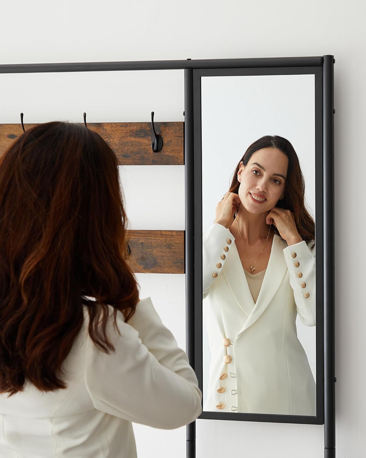 VASAGLE Cuier cu rafturi depozitare pantofi si ​​oglinda, industrial, 35x98x180 cm, maro rustic si negru