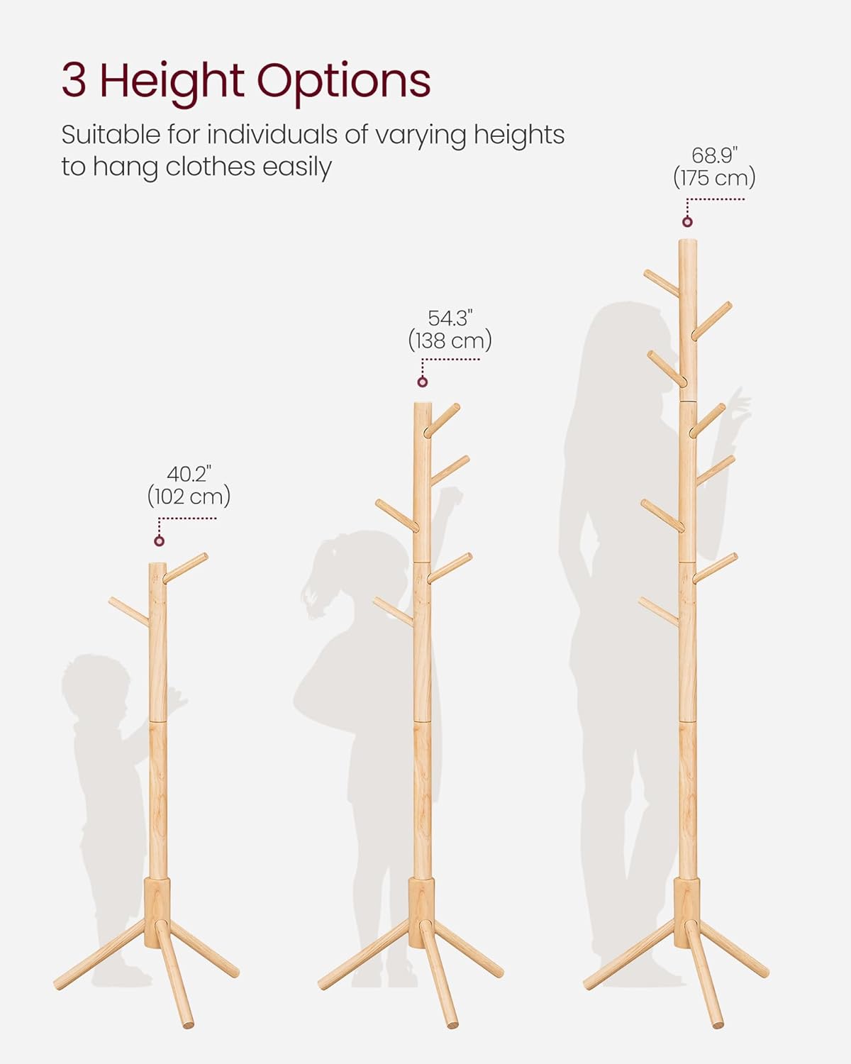 VASAGLE Cuier lemn masiv 47x47x175 cm, 8 carlige si inaltime reglabila, baza triunghiulara, natur