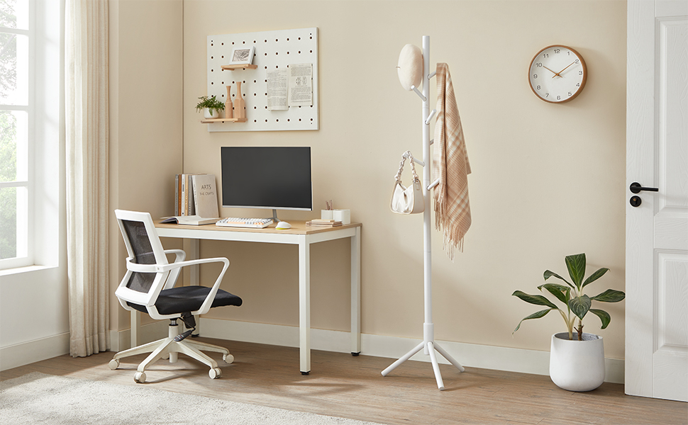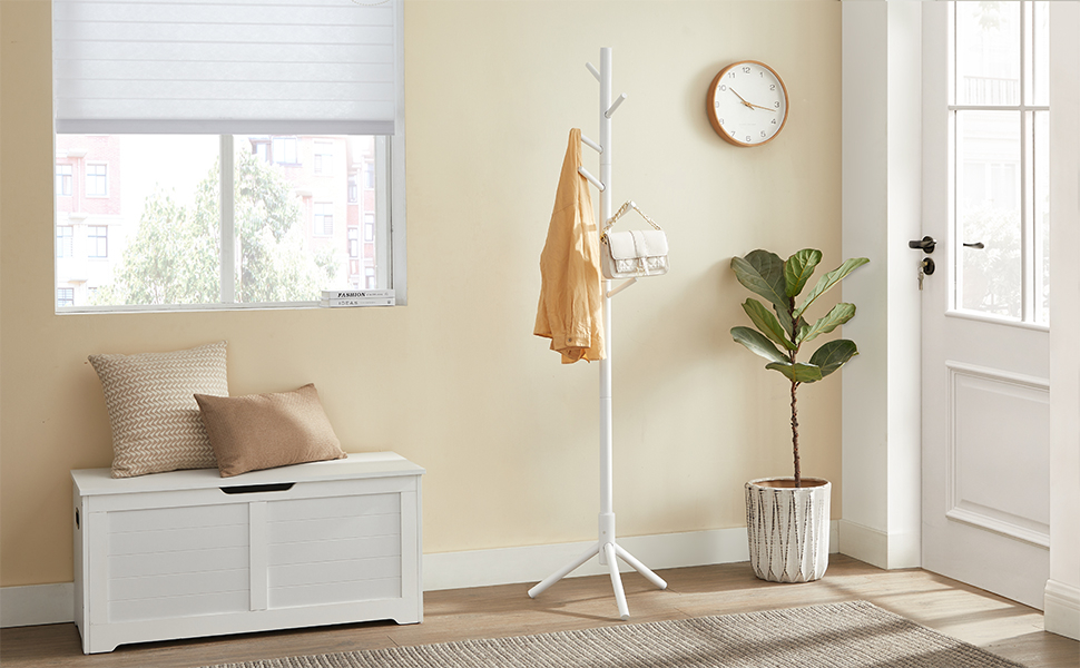 Specificatii: Culoare: alb Material: lemn masiv Dimensiune produs: 47 x 47 x 175 cm (L x l x H) Lungimea fiecarui carlig: 12,3 cm Greutate produs: 2,2 kg Sarcina statica a fiecarui carlig: 3 kg Sarcina statica  totala: 24 kg Despre acest articol Fabricat din lemn masiv cu diametrul de 3,8 cm, acest cuier este durabil si stabil. In plus, culoarea alba adauga o nota revigoranta casei dvs.Designul cu 3 sectiuni va permite sa decideti inaltimea cuierului.Stabilitatea este prioritatea principala pentru un cuier. Baza triunghiulara cu latimea de 47 cm ofera o baza solida pentru acest cuier, care poate sustine pana la 24 kg.Acest cuier de 47 x 47 x 175 cm se potriveste chiar si in holurile inguste si suporta o incarcatura grea. Cele 8 carlige (incarcatura de 3 kg per carlig) pot fi folosite pentru agatarea hainelor, gentilor si esarfelor.Structura simpla, piesele etichetate si instructiunile usor de urmat va vor ajuta sa finalizati asamblarea fara efort. Excelent pentru utilizare in casa, magazin, birou sau sali de asteptare.