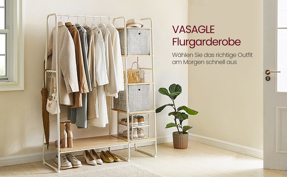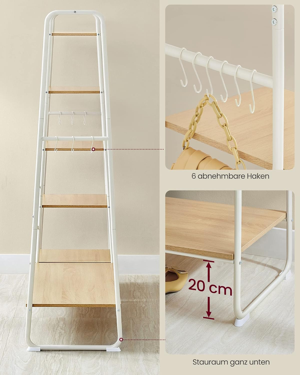 VASAGLE Raft pentru haine cu suport pentru pantofi, 5 polite, 6 carlige laterale, 45x120x160cm, alb