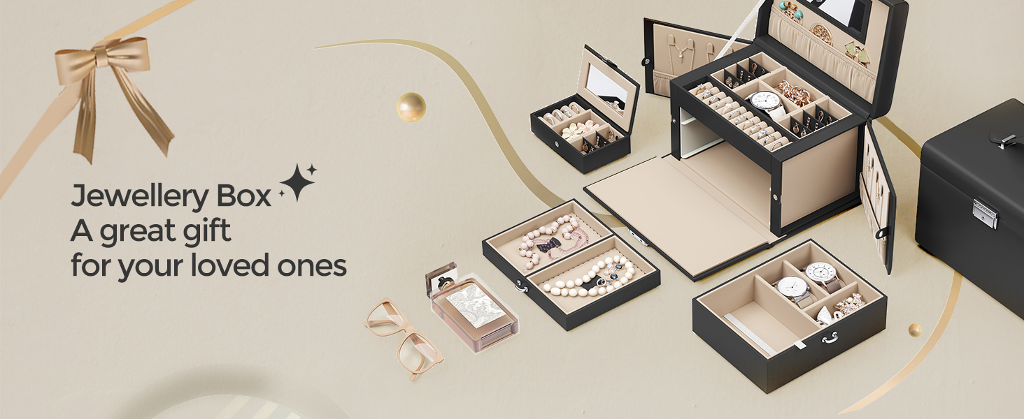 SONGMICS Cutie de bijuterii pe 3 nivele, cu 2 sertare, oglinda, maner, inchidere cu cheie, 18x26x17cm, negru