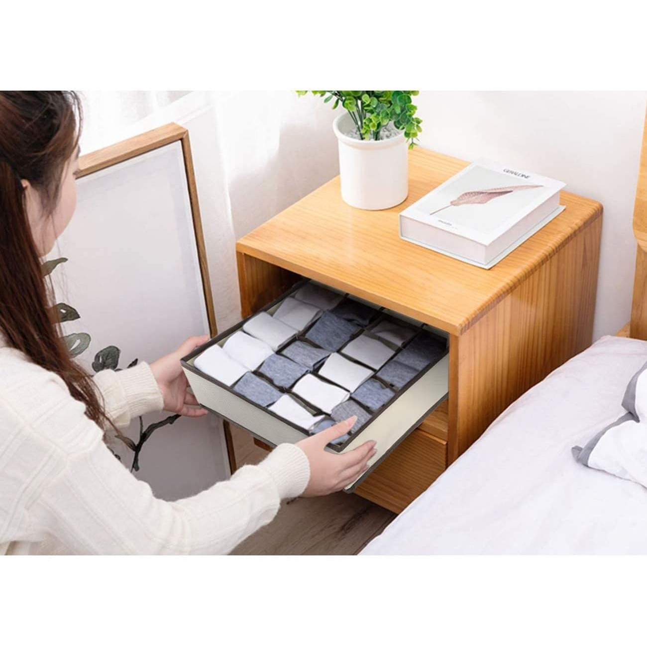Cutie de Depozitare , pentru Lenjerie, Șosete și Sutiene, Material Textil, 24 Compartimente, 32 x 32 x 10 cm, Culoare Bej
