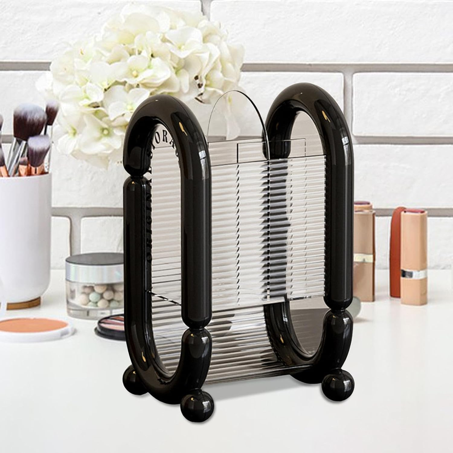 Organizează-ți produsele cosmetice cu această cutie de depozitare , concepută special pentru a păstra pensulele, creioanele și burețeii de machiaj într-un singur loc. Cu un design compact și elegant, este ideală pentru a adăuga ordine și stil zonei tale de machiaj.