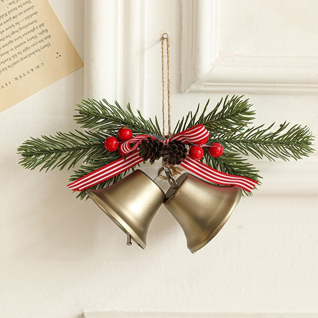 Aceasta decoratiune este realizata din materiale de calitate, cu un design rafinat ce include 2 clopotei aurii de Craciun, completati de o crenguta de brad artificiala, conuri si bobite decorative. Fundita textila adauga un accent clasic si elegant, transformand aceasta piesa intr-un element decorativ deosebit pentru brad, usi, ferestre sau orice colt al casei.