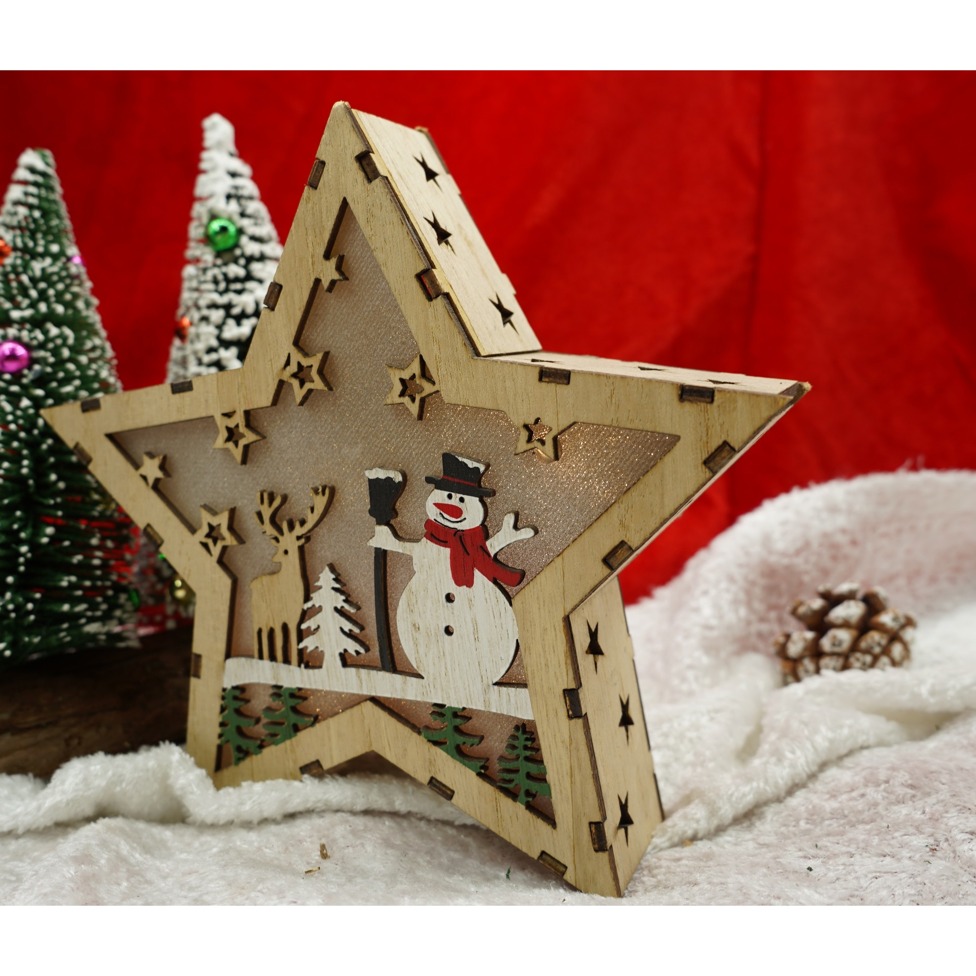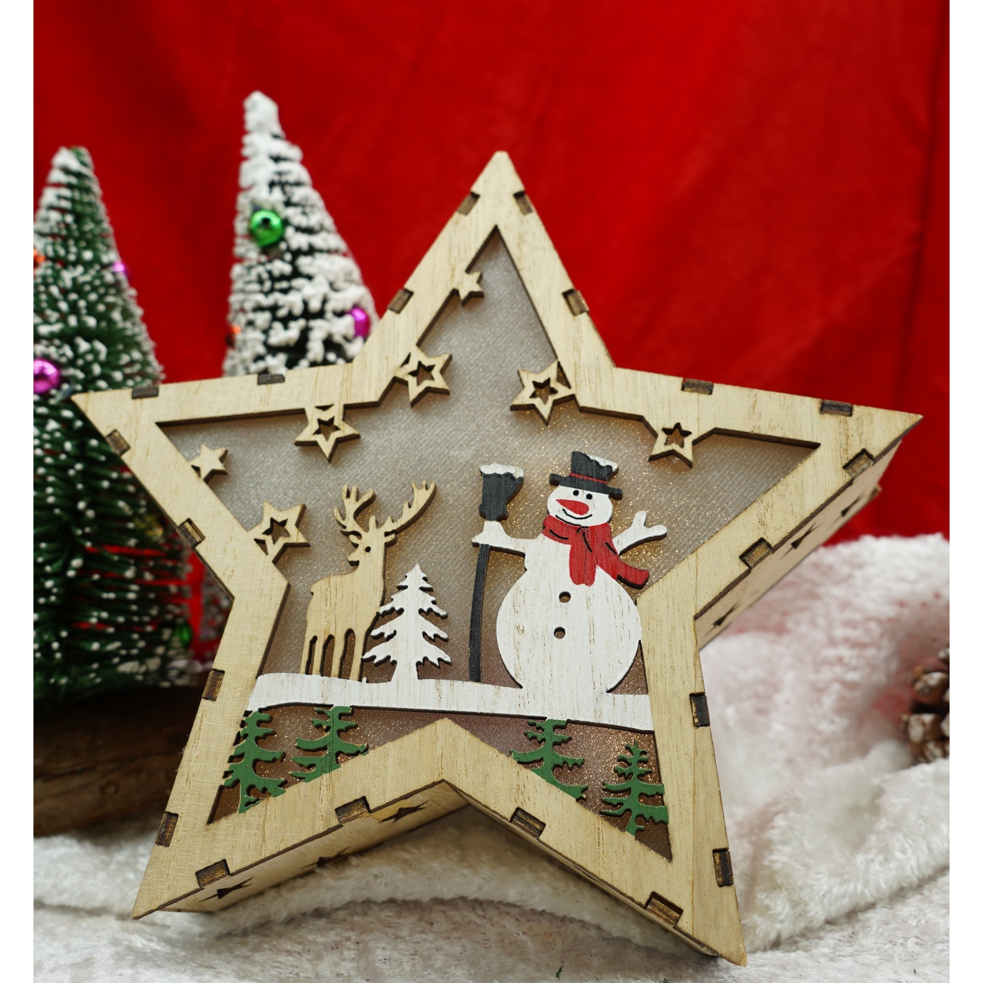 Decoratiune luminoasa, model de Stea cu Om de zapada, maro, lungime: 18 cm, latime: 18 cm, inaltime: 4 cm, lemn, interior/exterior