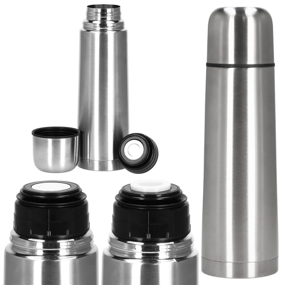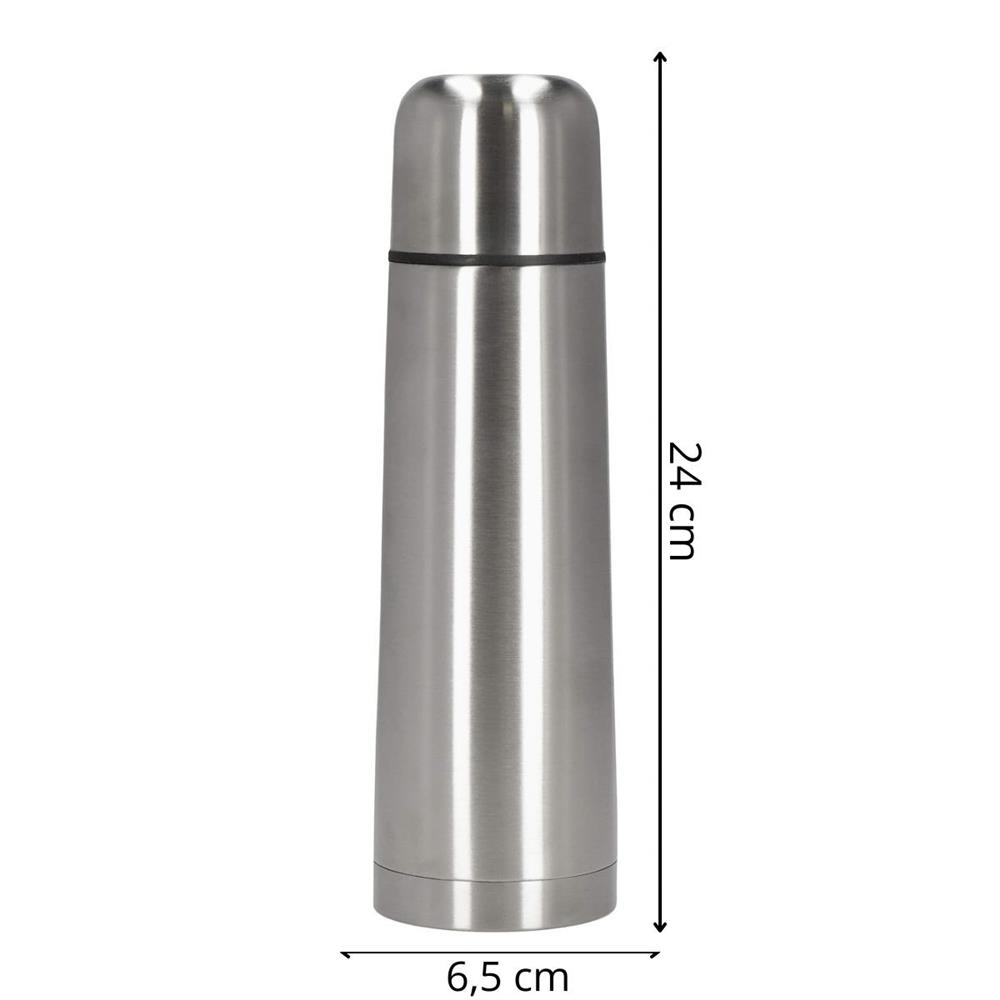 Material: otel inoxidabil Capacitate: 0.5L Produsul este aprobat pentru contactul cu alimentele Dimensiuni: Inaltimea interioara a termosului: 20,5 cm Inaltimea exterioara a termosului: 22,5 cm Inaltime totala: 24 cm Grosime in punctul cel mai lat: 6,5 cm Grosime in cel mai ingust punct: 4,6 cm Diametru baza: 6,5 cm Inaltime capac: 5 cm Diametru capac: aproximativ 6 cm Capac termos: 5,3 x 5,2 cm (inaltime x latime) Termosurile din otel au un numar mare de avantaje. Otelul inoxidabil nu absoarbe mirosurile, ceea ce elimina problema aromei de cafea sau de ceai atunci cand este reutilizat. Termosurile din otel inoxidabil sunt, de asemenea, durabile si nu ruginesc, asa ca va vor servi pentru o perioada lunga de timp. Este produsul ideal pentru calatorii!  Pastreaza bautura la temperatura perfecta timp de pana la 24 de ore!  Fabricat din otel inoxidabil - durabil, sigur pentru sanatate, usor de curatat, nu absoarbe mirosurile  Capacul etans - asigura transportul in siguranta, fara risc de scurgere, precum si deschiderea si inchiderea rapida si usoara  Siguranta - aprobat pentru contactul cu alimentele.  Versatila - perfecta pentru calatorii, munca, scoala.  Usor de pastrat curat - fara intretinere complicata, fara rugina Izolatia in vid presupune crearea unui vid intre cele doua straturi ale termosului. Acest lucru reduce schimbul de temperatura intre interior si exterior. Prin urmare, bauturile raman calde sau reci mult mai mult timp. Unicitatea acestui termos consta in simplitatea sa eleganta. Pur si simplu desurubati capacul si acesta se transforma intr-o ceasca practica