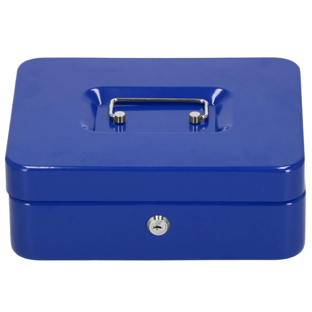 Caseta pentru bani tip cutie de valori, compartimentanta, cu cheie, metal, 20x16x9cm, albastru
