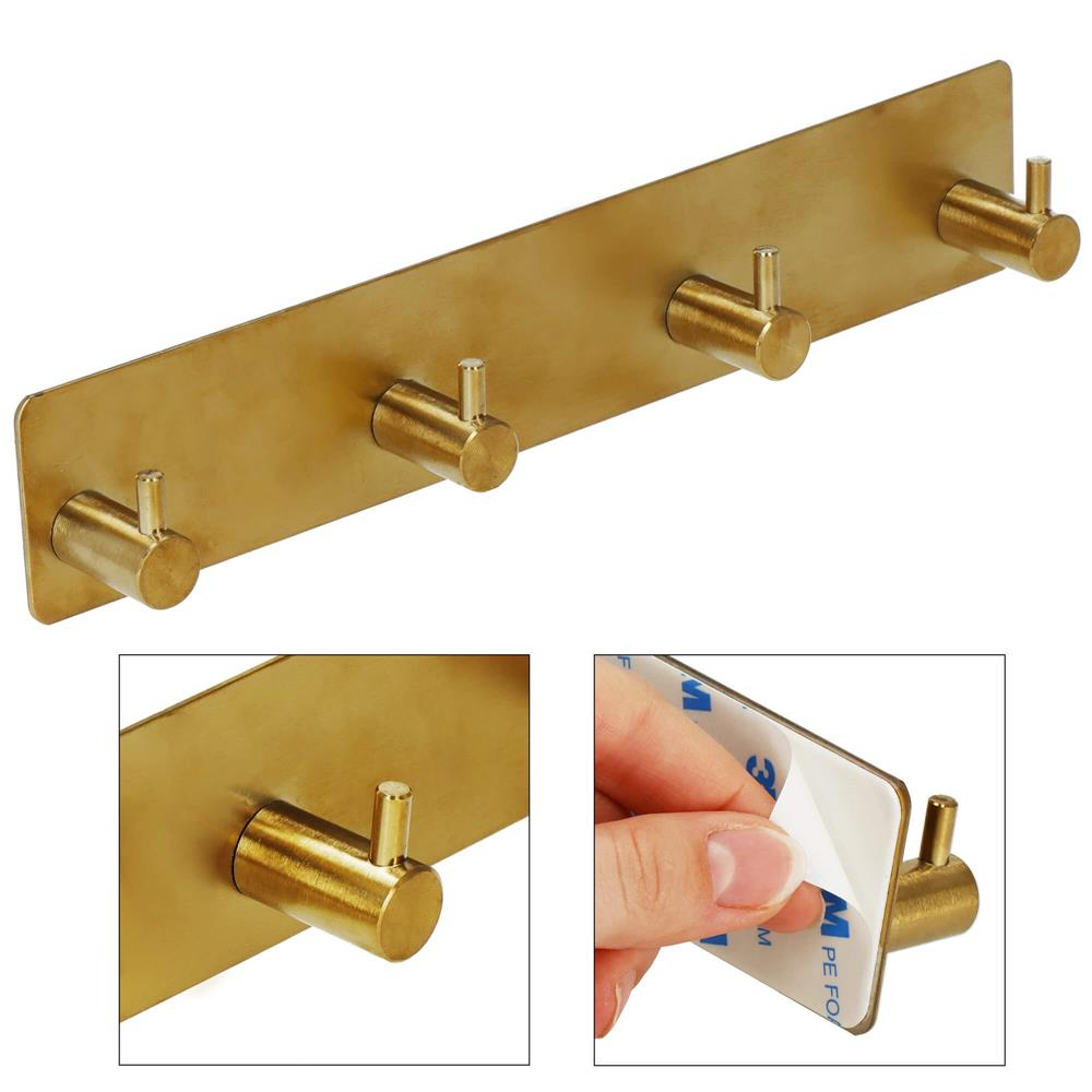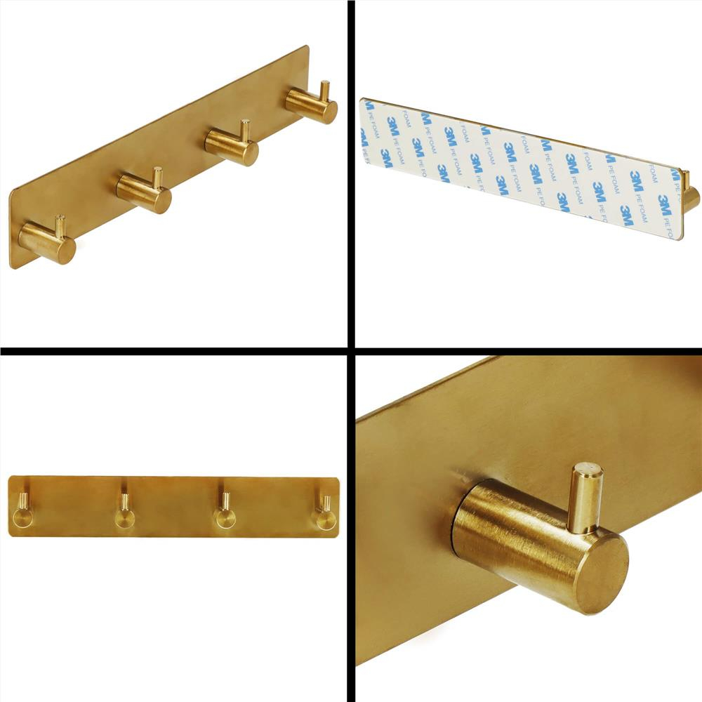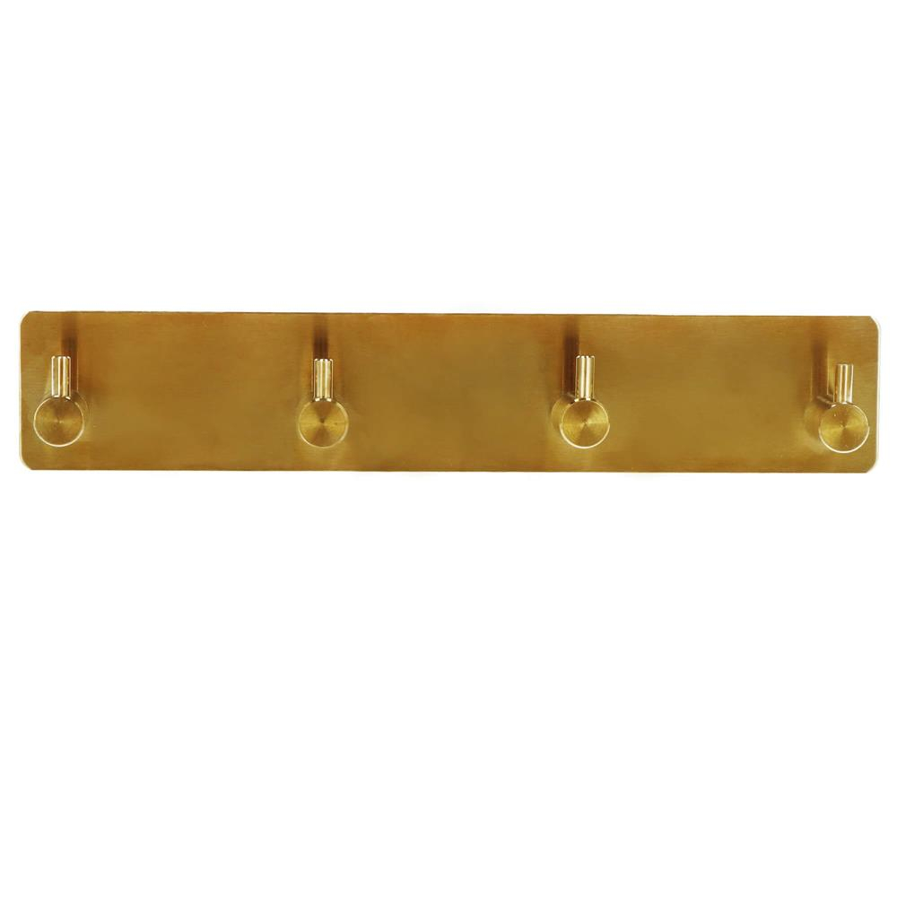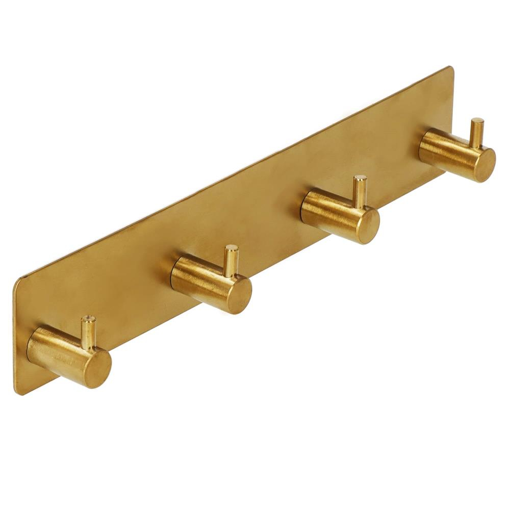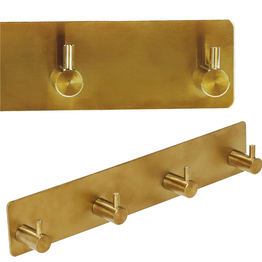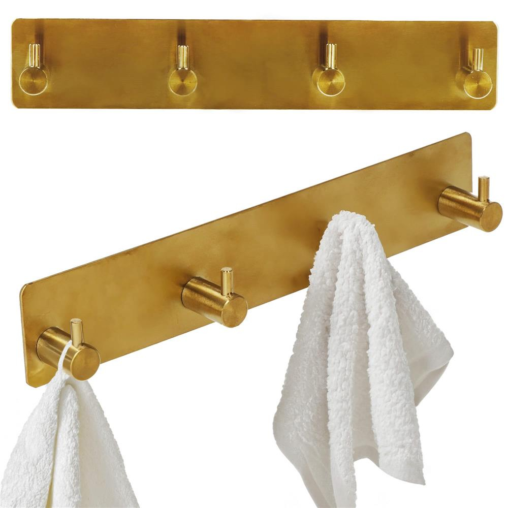 Cuier de baie pentru prosoape, montare fara gaurire, otel, 4 agatatori, 24x4.5cm, auriu