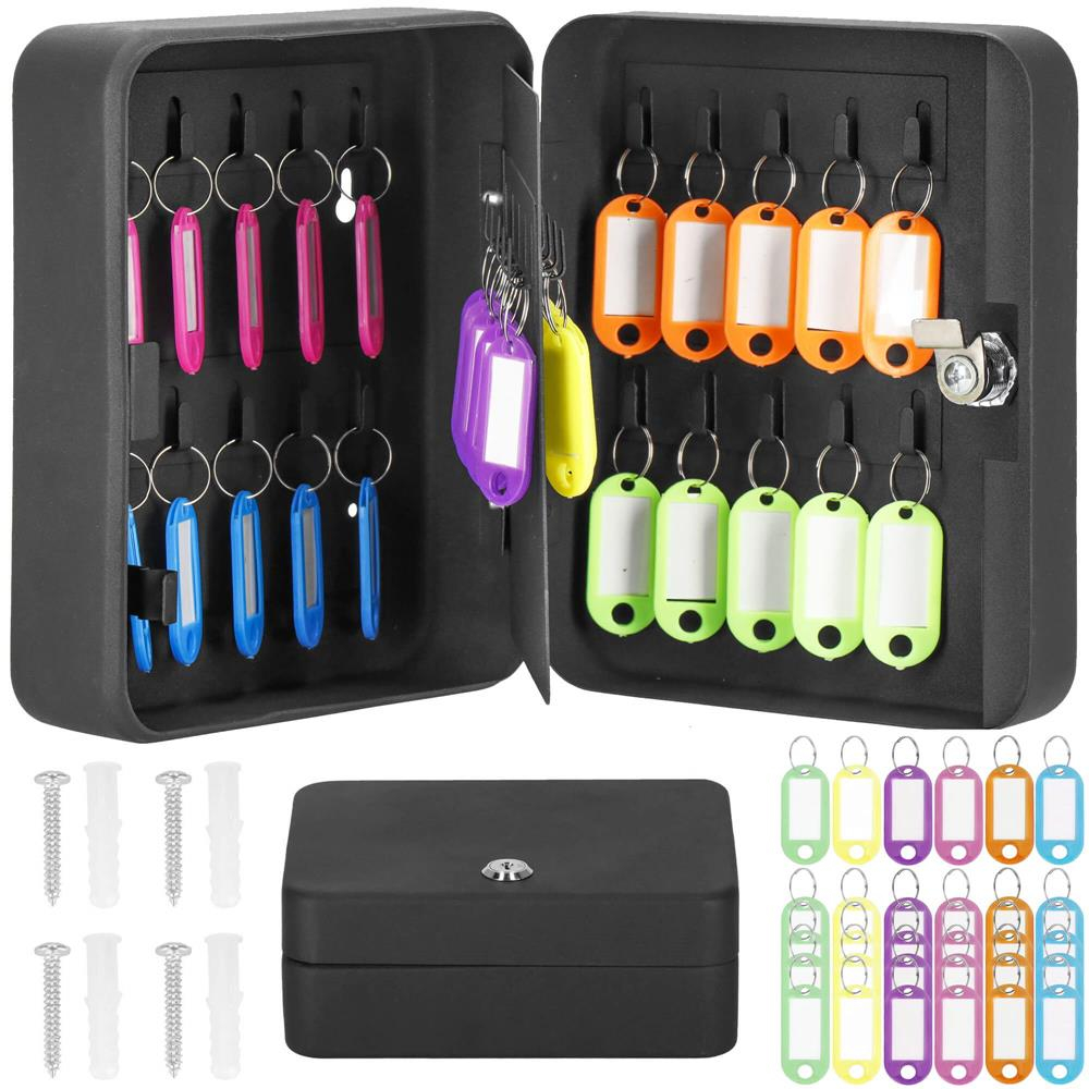 Culoarea carcasei: negru Culoare breloc: multicolor (mix) Material: otel Finisaj: mat Inchidere cu cheie: da Numarul de carlige pentru chei: 20 Numar de brelocuri: 20 Numarul de chei pentru carcasa: 2          Dimensiuni: Latime: 20 cm Adancime: 16 cm Inaltime: 7,5 cm Peretii grosi ai casetei asigura o buna protectie a cheilor din interior. Cu produsul nostru, puteti fi siguri ca nu veti pierde niciodata niciuna dintre cheile dumneavoastra. Constructia solida a casetei garanteaza siguranta si discretie. Daca profitati de oferta noastra, nu veti primi doar o carcasa rezistenta si durabila, ci si un set de etichete pentru chei. Cu ajutorul acestora, veti mentine ordinea si organizarea. Pentru a evita ca dulapul sa se piarda sau sa fie furat din greseala, montati-l pe perete! Dulapul are gauri pre-gaurite si veti primi in plus dibluri cu suruburi de la noi in kit. Produsul are culori discrete si universale, chiar si plasat pe perete nu va fi vizibil. Cutia de chei este un instrument extrem de util in multe medii. Suporturile pentru chei incluse faciliteaza pastrarea in ordine a cheilor depozitate. Incuietoarea cu cheie protejeaza continutul Fabricat din materiale durabile si puternice Inclus: elemente de montare / brelocuri de chei Echipat cu 20 de carlige pentru chei Incuiat cu cheie de blocare Culori discrete Poate fi combinat cu alte accesorii Poate fi montat pe perete Interiorul are un separator mobil cu carlige pentru o capacitate de depozitare mai mare