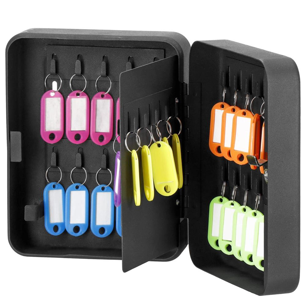 Culoarea carcasei: negru Culoare breloc: multicolor (mix) Material: otel Finisaj: mat Inchidere cu cheie: da Numarul de carlige pentru chei: 30 Numar de brelocuri: 30 Numarul de chei pentru carcasa: 2 Separator mobil cu carlige in interior           Dimensiuni: Latime: 20 cm Adancime: 16 cm Inaltime: 7,5 cm Separator interior: 17 x 13 cm Peretii grosi ai casetei asigura o buna protectie a cheilor din interior. Cu produsul nostru, puteti fi siguri ca nu veti pierde niciodata niciuna dintre cheile dumneavoastra. Constructia solida a casetei garanteaza siguranta si discretie. Daca profitati de oferta noastra, nu veti primi doar o carcasa rezistenta si durabila, ci si un set de etichete pentru chei. Cu ajutorul acestora, veti mentine ordinea si organizarea. Pentru a evita ca dulapul sa se piarda sau sa fie furat din greseala, montati-l pe perete! Dulapul are gauri pre-gaurite si veti primi in plus dibluri cu suruburi de la noi in kit. Produsul are culori discrete si universale, chiar si plasat pe perete nu va fi vizibil. Cutia de chei este un instrument extrem de util in multe medii. Suporturile pentru chei incluse faciliteaza pastrarea in ordine a cheilor depozitate. Incuietoarea cu cheie protejeaza continutul Fabricat din materiale durabile si puternice Inclus: elemente de montare / brelocuri de chei Echipat cu 30 de carlige pentru chei Incuiat cu cheie de blocare Culori discrete Poate fi combinat cu alte accesorii Poate fi montat pe perete Interiorul are un separator mobil cu carlige pentru o capacitate de depozitare mai mare