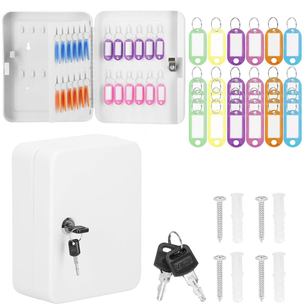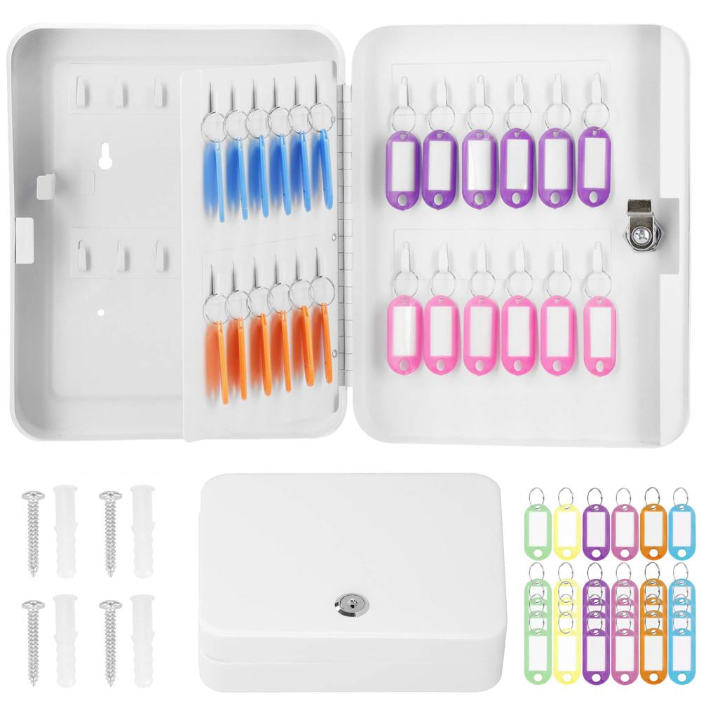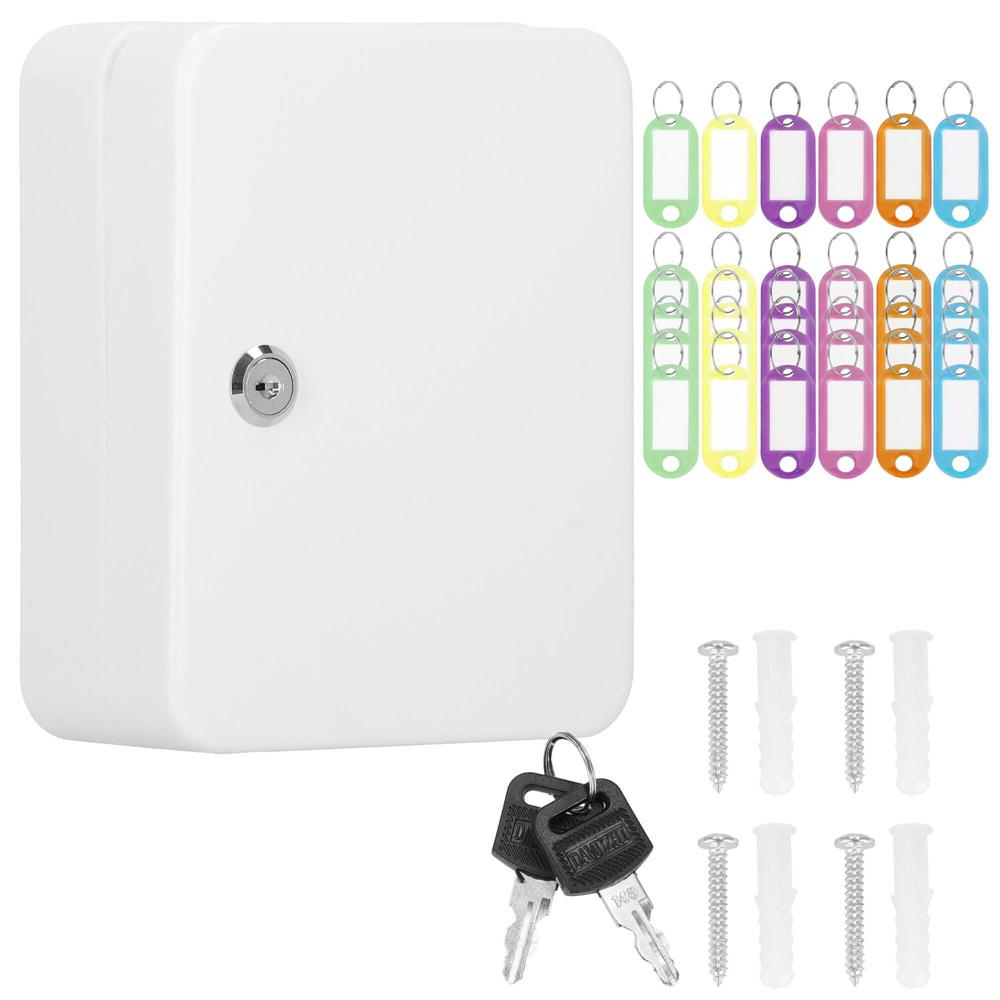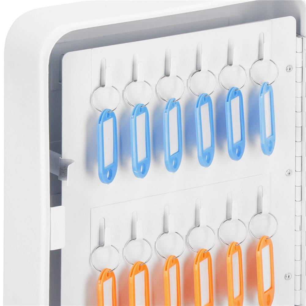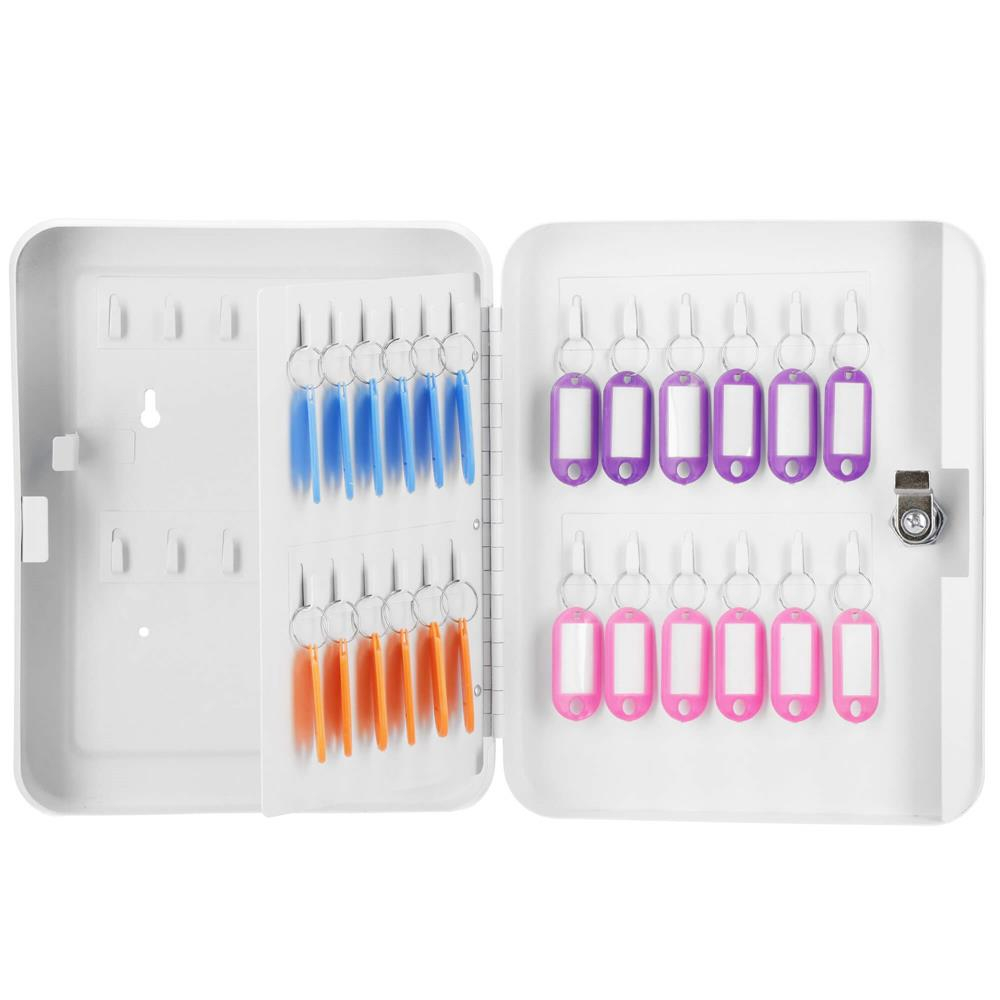 Culoarea carcasei: alb Culoare breloc: multicolor (mix) Material: otel Finisaj: mat Inchidere cu cheie: da Numarul de carlige pentru chei: 48 Numar de brelocuri: 48 Numarul de chei pentru carcasa: 2  Dimensiuni: Latime: 25 cm Adancime: 20 cm Inaltime: 7,5 cm Separator metalic in interior: 21 x 17 cm Peretii grosi ai casetei asigura o buna protectie a cheilor din interior. Cu produsul nostru, puteti fi siguri ca nu veti pierde niciodata niciuna dintre cheile dumneavoastra. Constructia solida a casetei garanteaza siguranta si discretie. Daca profitati de oferta noastra, nu veti primi doar o carcasa rezistenta si durabila, ci si un set de etichete pentru chei. Cu ajutorul acestora, veti mentine ordinea si organizarea. Pentru a evita ca dulapul sa se piarda sau sa fie furat din greseala, montati-l pe perete! Dulapul are gauri pre-gaurite si veti primi in plus dibluri cu suruburi de la noi in kit. Produsul are culori discrete si universale, chiar si plasat pe perete nu va fi vizibil. Cutia de chei este un instrument extrem de util in multe medii. Suporturile pentru chei incluse faciliteaza pastrarea in ordine a cheilor depozitate. Incuietoarea cu cheie protejeaza continutul Fabricat din materiale durabile si puternice Inclus: elemente de montare / brelocuri de chei Echipat cu 48 de carlige pentru chei Incuiat cu cheie de blocare Culori discrete Poate fi combinat cu alte accesorii Poate fi montat pe perete Interiorul are un separator mobil cu carlige pentru o capacitate de depozitare mai mare