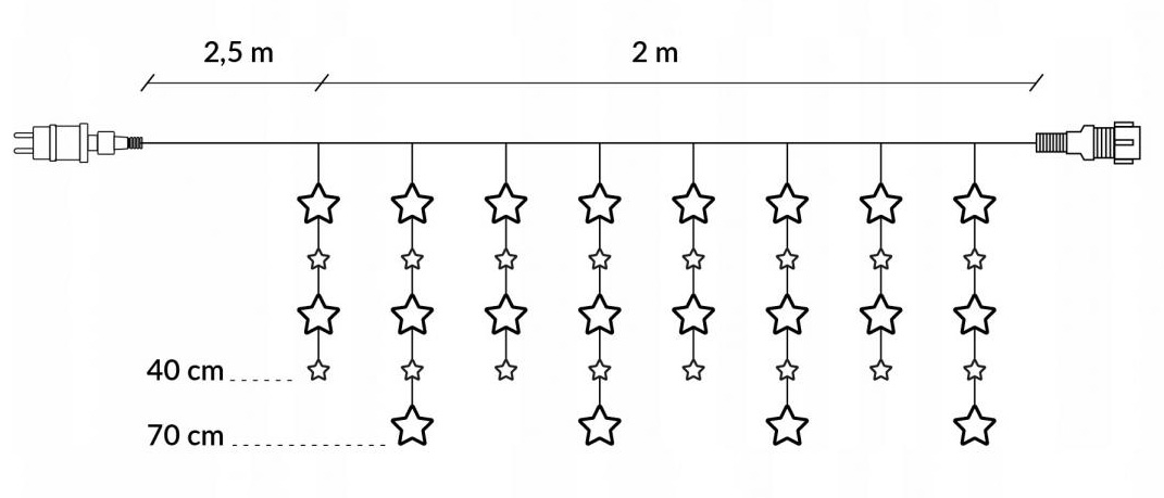 Culoare: alb caldProgramator cu 8 functiiLungimea piesei iluminante: aproximativ 2 mLungimea cablului: aproximativ 2.5 mAsezarea turturilor la fiecare 18 cmLungimea ghetului: 40cm / 70cmLatimea stelelor: 18,5 cmDimensiunea lunilor stea: 8x10 cmLampi de gheata 92 LED-uriAlimentare 220-240vLED-uri cu economie de energieAlimentat electricArderea unei diode nu opreste setul!Diodele impermeabile - pot fi scufundate in apa - fara alimentareLampi pe fire de cupru durabile cu diametrul de 1,3 mm, rezistente la rupereCE, certificat RoHSClasa de etanseitate IP44Utilizare externa si interna Perdeaua de lumina are un program de iluminare cu 8 functii: combinatie, val, secventa, slo-glo, intermitent, schimbare lenta a culorii, intermitent, lumina constanta
