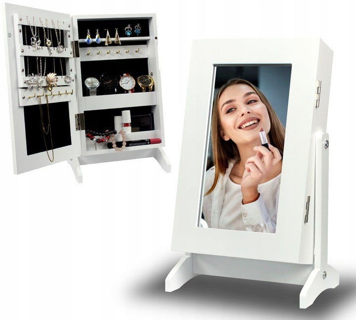 MASUTA DE TOALETA ALBA - VICTORIA MINIDulapul de bijuterii cu oglinda este cu siguranta o idee de cadou excelenta pentru orice femeie. Acesta poate gazdui un numar mare de coliere, inele, bratari si ceasuri. Interiorul tapitat adauga farmec si eleganta, iar oglinda exterioara este, dupa cum toata lumea stie, un element indispensabil in orice dormitor.Oglinda transparentaCaptusit cu plus moaleCarlige si rafturi pentru bijuteriiStil victorian modernFabricat din placi de mobilier MDFIncuiat cu un magnetAmbalate cu grija pentru transport*Articolele prezentate in imagine (bijuterii) nu fac parte din masa de toaleta