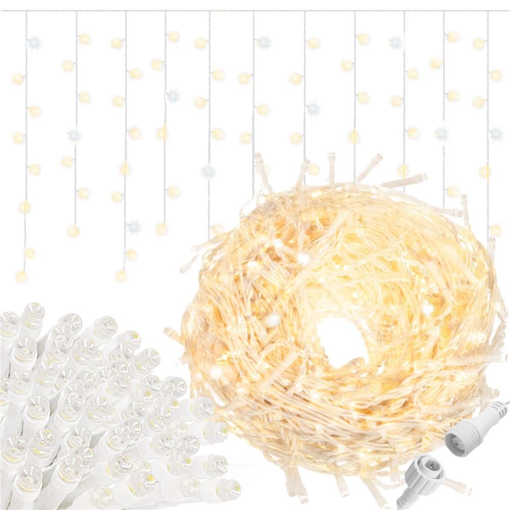 Perdeaua de lumina de gheata este una dintre cele mai frumoase decoratiuni de Craciun. Acestea vor fi decorul perfect pentru hol, balcon sau gard. Lampile creeaza o atmosfera unica de Craciun. Principalul avantaj este calitatea inalta a manoperei si durabilitatea produsului. Lampile sunt compatibile, ceea ce inseamna ca le puteti combina in seturi. Seturile cu telecomanda pot fi combinate cu seturile fara telecomanda. Un programator poate opera mai multe seturi. Conectorii ermetici au clasa de etansare IP44, ceea ce inseamna ca sunt adaptati pentru utilizare in exterior fara a fi nevoie de izolatie suplimentara. Butonul controlerului este sigilat, cauciucat. Firul gros de cupru este rezistent la rupere sau la temperaturi scazute. Culoare: alb cald (galben) + blit (flash)Lungimea sectiunii de iluminare aprox. 12 mLungimea cablului: aprox. 2,5 mLungimea ghetuselor: 0,4/0,5/0,6 mLumini 300 micro LED-uriAlimentare: retea electrica 220-240vDiode de economisire a energiei1 dioda arsa nu stinge setul!Rezistent la apa - poate fi scufundat in apa (fara alimentare)Conectori ermeticiLumini pe fire de cupru durabile cu diametrul de 1,3 mm, rezistente la rupereCertificat CE, RoHSClasa de protectie IP44Utilizare in exterior si interiorPot fi conectate pana la 3 siruri de lumini suplimentarePutere: 4,5 WPutere de iesire: 31V, 12WAlimentarea cu LED-uri: 1,8 - 3,6 V / 20Ma Perdeaua de lumina are un program de iluminare cu 8 functii: combinatie, val, secventa, slo-glo, intermitent, schimbare lenta a culorii, intermitent, lumina constanta