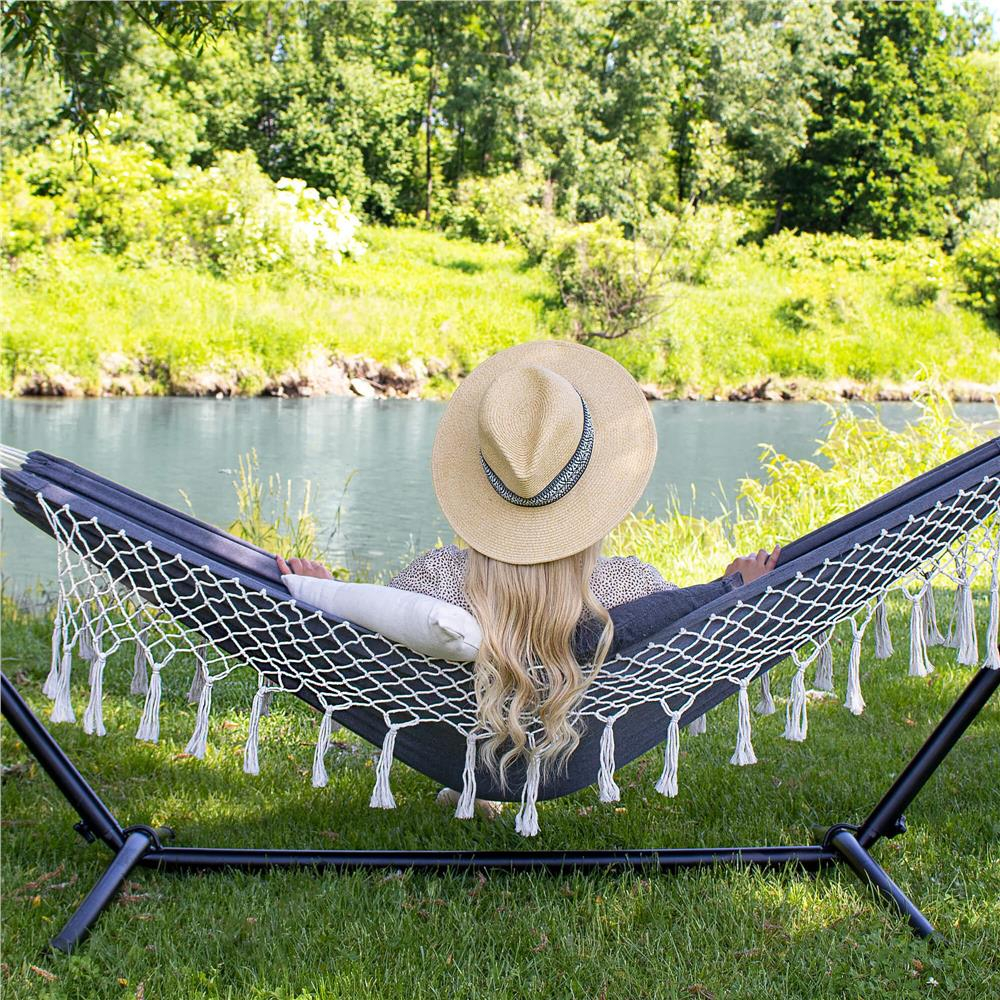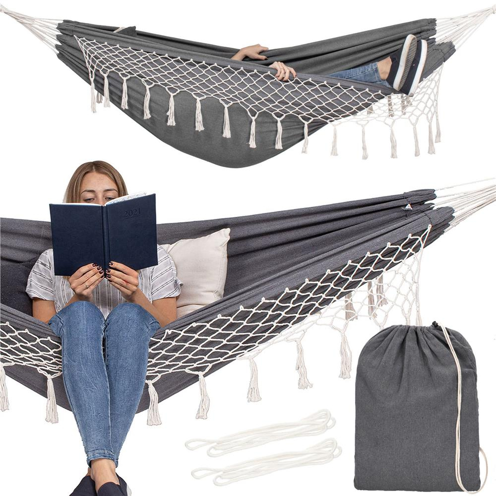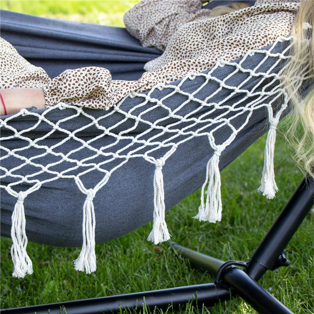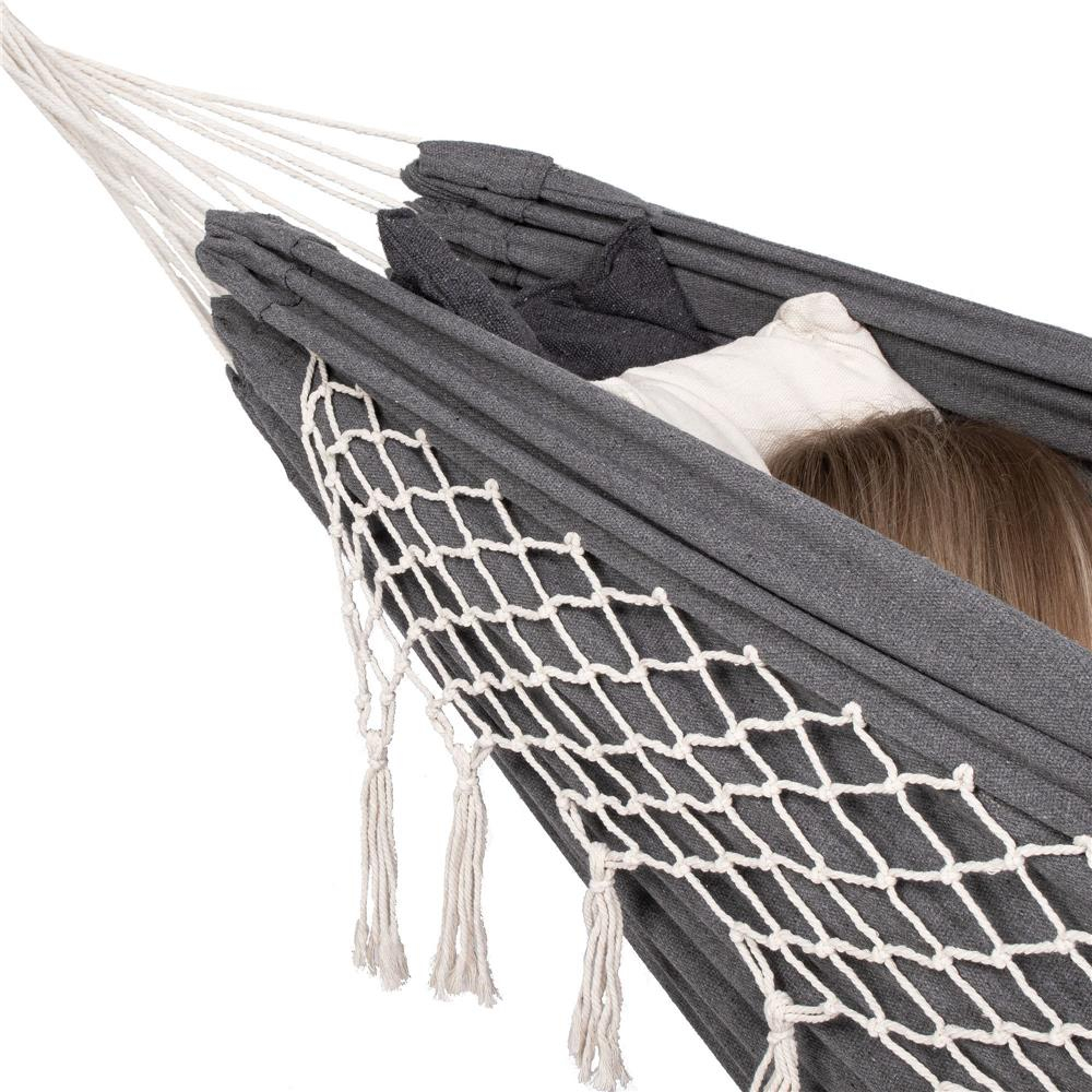 Hamac doua persoane cu franjuri si 2 perne, 200kg, 200×150 cm, gri inchis