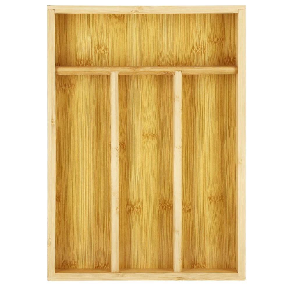 Material: bambus Culoare: lemn natural, furnir cu efect de lemn Utilizare: pentru tacamuri / accesorii de bucatarie Aplicatie: insertie de sertar 4 compartimente separate          Dimensiunile organizatorului: Latime: 25 cm Adancime: 34 cm Inaltime: 4,5 cm          Dimensiunile compartimentului: Pentru tacamuri: 24,5 x 7 cm (adancime x latime) Pentru accesorii suplimentare: 7 x 23 cm Pentru a avea grija de tacamurile dvs., merita sa le asezati in compartimente, astfel incat sa nu se ciocneasca intre ele. Acest lucru va prelungi durata de viata a acestora si va va permite sa va bucurati de setul dvs. preferat mult mai mult. Tavita noastra pentru tacamuri are mai multe compartimente, astfel incat sa puteti separa furculitele, lingurile, cutitele si chiar si alte piese de vesela!   Se potriveste cu multe sertare standard Puteti sa va pastrati bucataria ordonata Nu mai sunt tacamuri care se misca prin tot sertarul Cu un numar corect de compartimente, totul are un loc pentru el insusi Materialul de bambus este rezistent la umiditate Bambusul este cel mai des folosit pentru accesorii de bucatarie.  este rezistent la umiditate,  este antibacteriana,  nu absoarbe mirosurile,  nu se decoloreaza,  nu se deformeaza,  are o duritate adecvata,  este sigur pentru sanatate