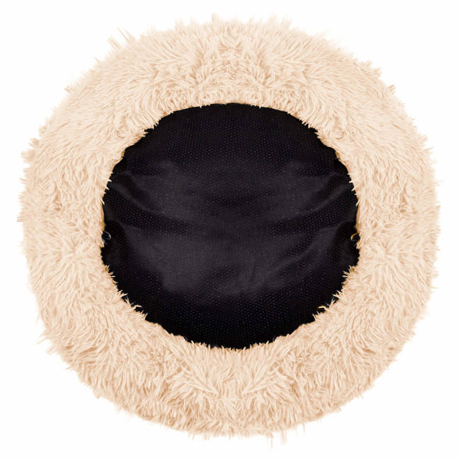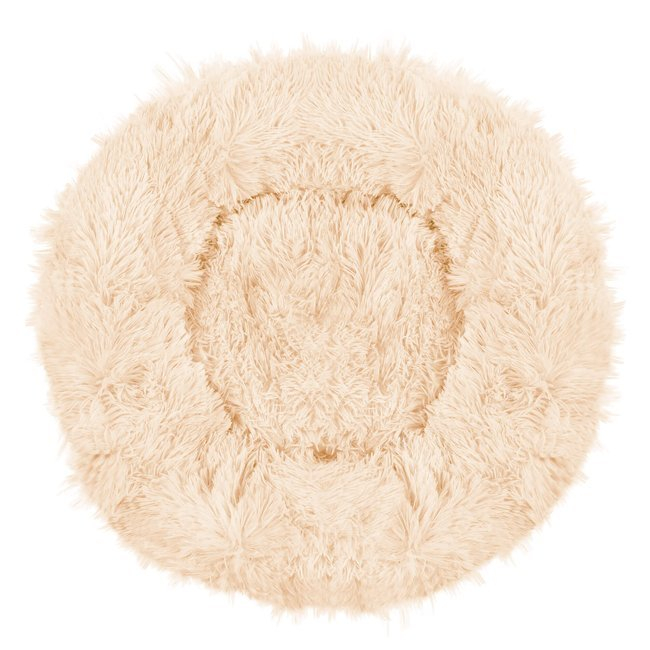 Material: poliester Culoare: crem Forma: rotunda Diametru: 90 cm Potrivit pentru catei/pisici cu talie: mai mica de 23 kg Baza antiderapanta Acest pat pufos pentru catei...