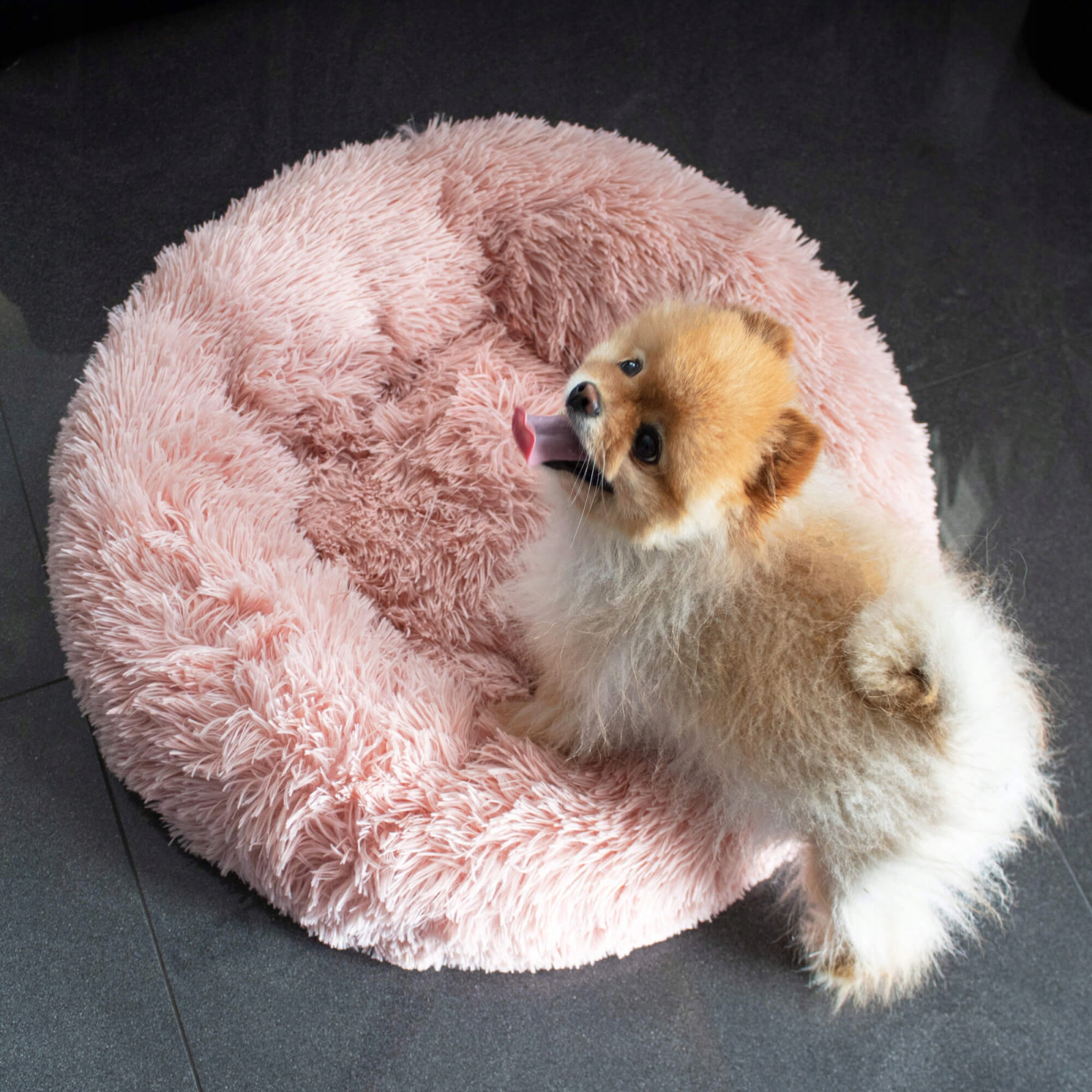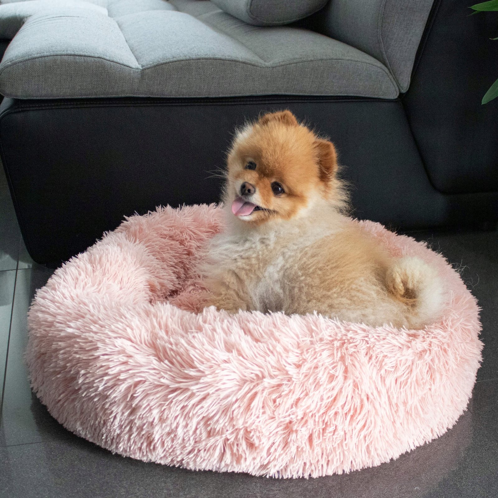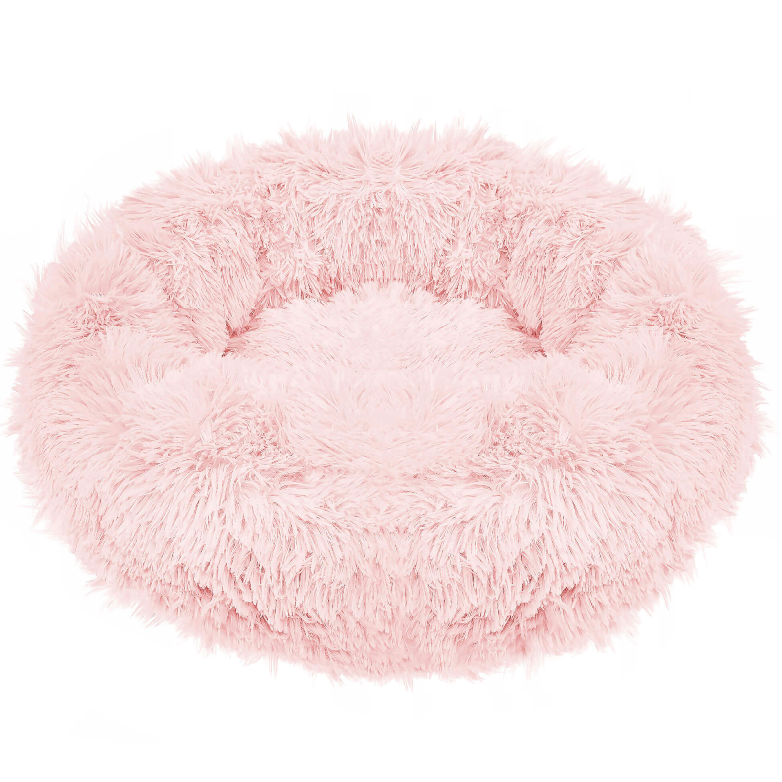 Material: poliester Culoare: roz deschis Forma: rotunda Diametru: 80 cm Potrivit pentru catei/pisici cu talie: mai mica de 17 kg Baza antiderapanta Acest pat pufos pentru...