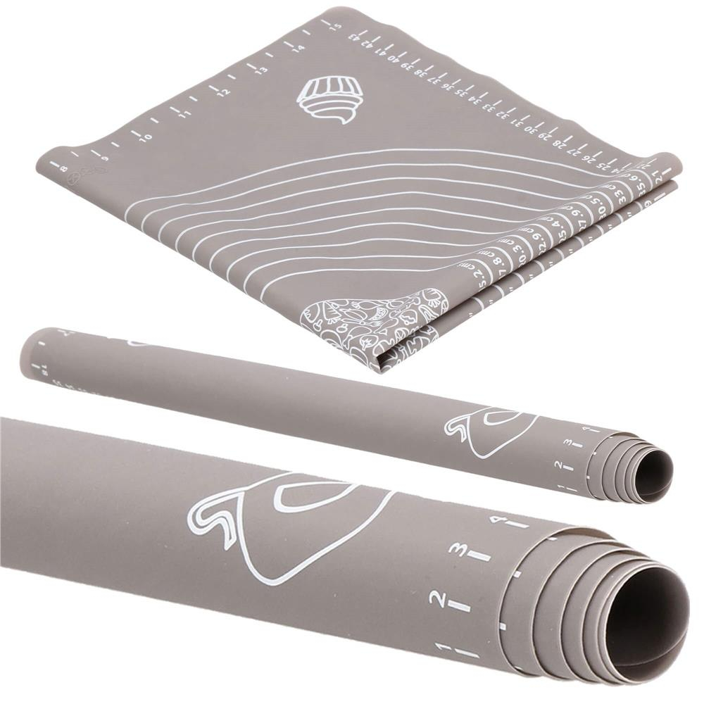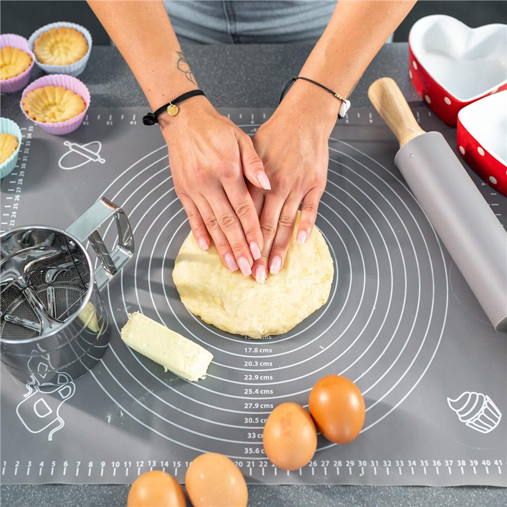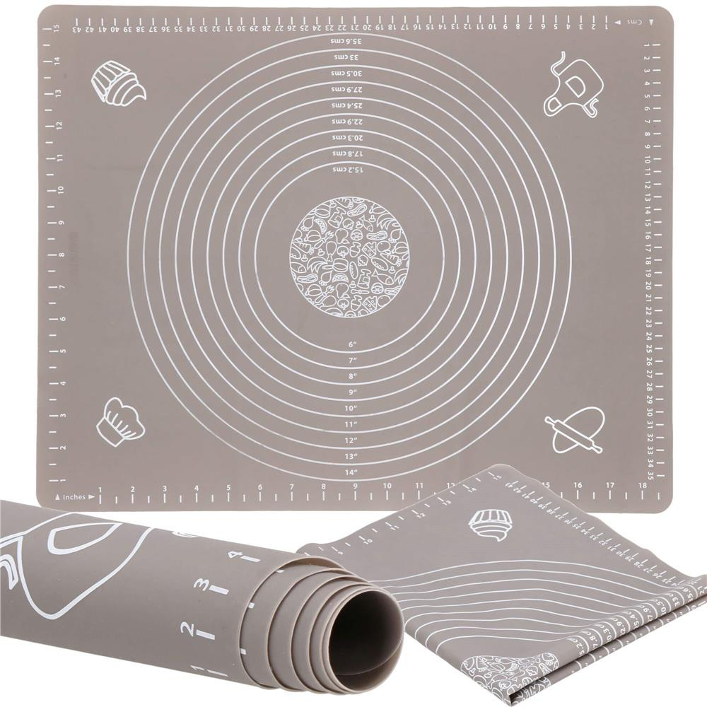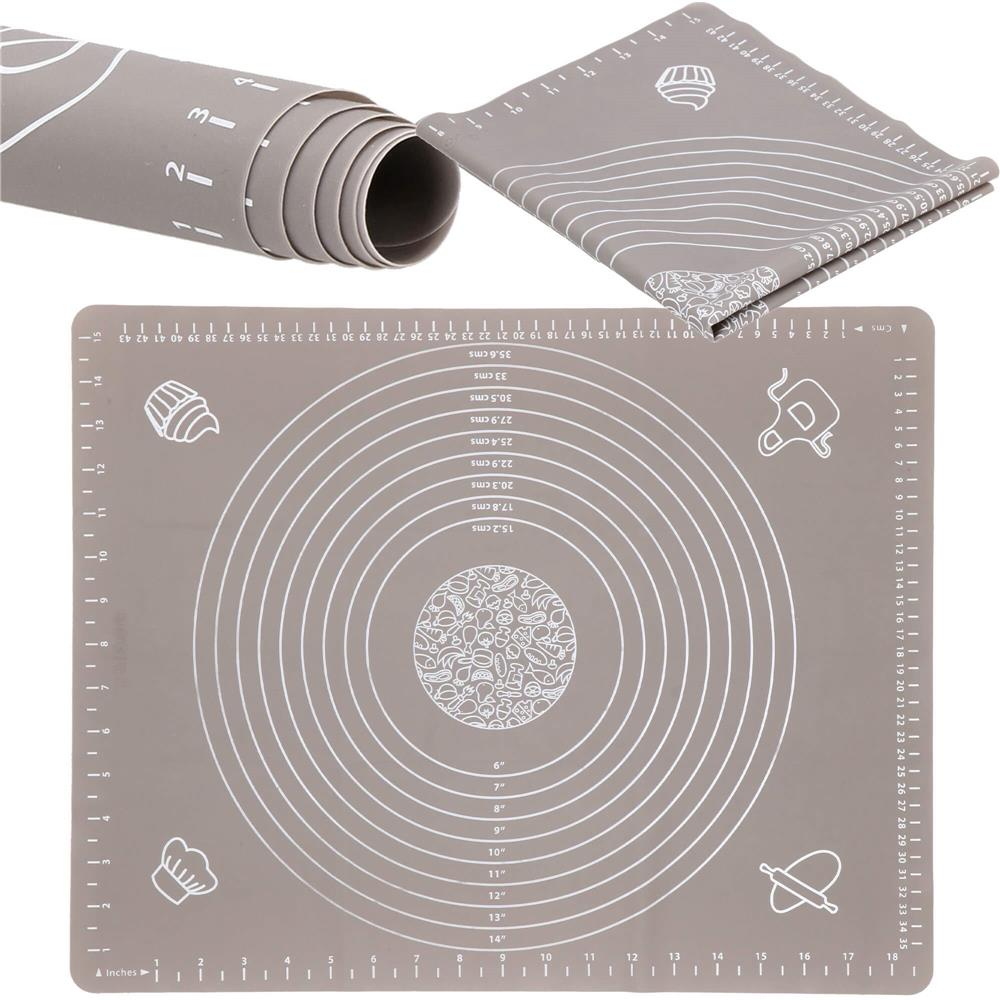 Culoare: Gri Dimensiune: 50 x 40 cm Latime: 50 cm Inaltime: 40 cm Material: silicon Rezistenta in intervalul de temperatura: 260 pana la -60°C In plus: nu absoarbe mirosurile, ocupa foarte putin spatiu atunci cand este pliata Aceasta plansa din silicon este ideala pentru bucatarii.  Datorita flexibilitatii materialului, aceasta ocupa foarte putin spatiu atunci cand este rulata si poate fi depozitata chiar si intr-un sertar mic. Usor de curatat sub jet de apa Aluatul framantat manual nu se va lipi de silicon Nu necesita ungere Nu absoarbe mirosurile Are gradatii pentru lungime si diametru Nu se va deforma atunci cand este pliat in rulou Poate rezista la temperaturi cuprinse intre 260°C si -60°C, astfel incat puteti pune pe el oale calde Materialul nu se va deteriora atunci cand se decupeaza, de exemplu, prajituri de turta dulce Economiseste timp si spatiu Este antiderapant si nu va aluneca atunci cand framantati aluatul Orice bucatar de casa stie exact cum este sa framanti aluatul care se tot lipeste de blatul de lemn al mesei. Alegand accesoriul nostru din silicon, veti putea face aluat, galuste sau pizza fara niciun stres suplimentar. Cu cei mai mici membri ai familiei, puteti decupa cu usurinta diferite modele pentru turta dulce sau prajituri, iar acestea se vor desprinde de pe covoras fara probleme. Covorasul este fabricat din materiale de cea mai buna calitate. Alegand siliconul, se garanteaza ca nu va absorbi mirosurile sau umezeala din lichidele adaugate pentru prajituri. In plus, acest material este sigur pentru sanatate si neutru din punct de vedere alimentar. Adesea, retetele din cartile de bucate sau de pe bloguri au dimensiuni specifice ale prajiturilor care trebuie facute. Din acest motiv, plansa de patiserie din silicon este dotata cu gradatii de lungime si diametru. De asemenea, merita mentionat faptul ca acestea nu sunt convexe, deci nu se vor vedea pe aluat. Planuiti o excursie cu cortul, iar gatitul este un hobby si intentionati sa va aratati abilitatile in vacanta? Nici o problema! Puteti lua placa de patiserie din silicon cu dvs. pur si simplu rulati-o, astfel incat sa incapa in orice bagaj.