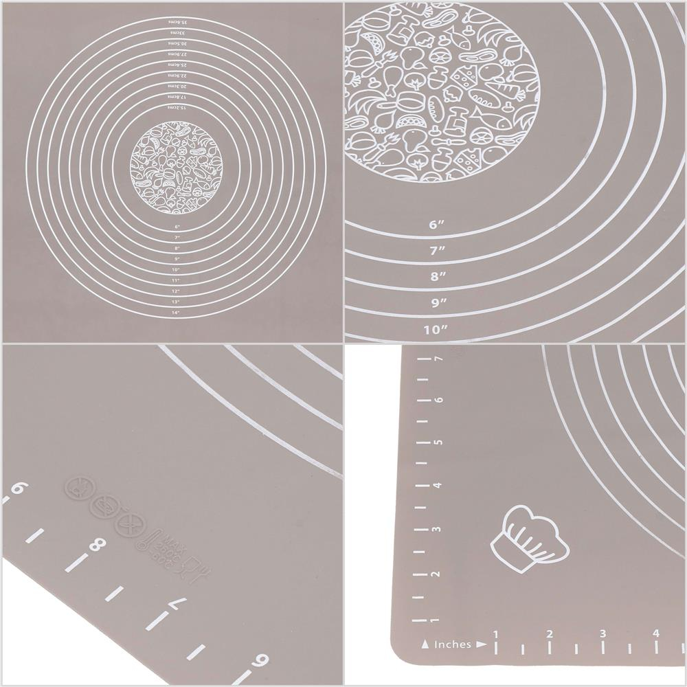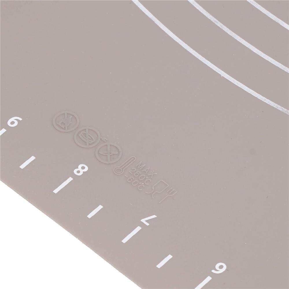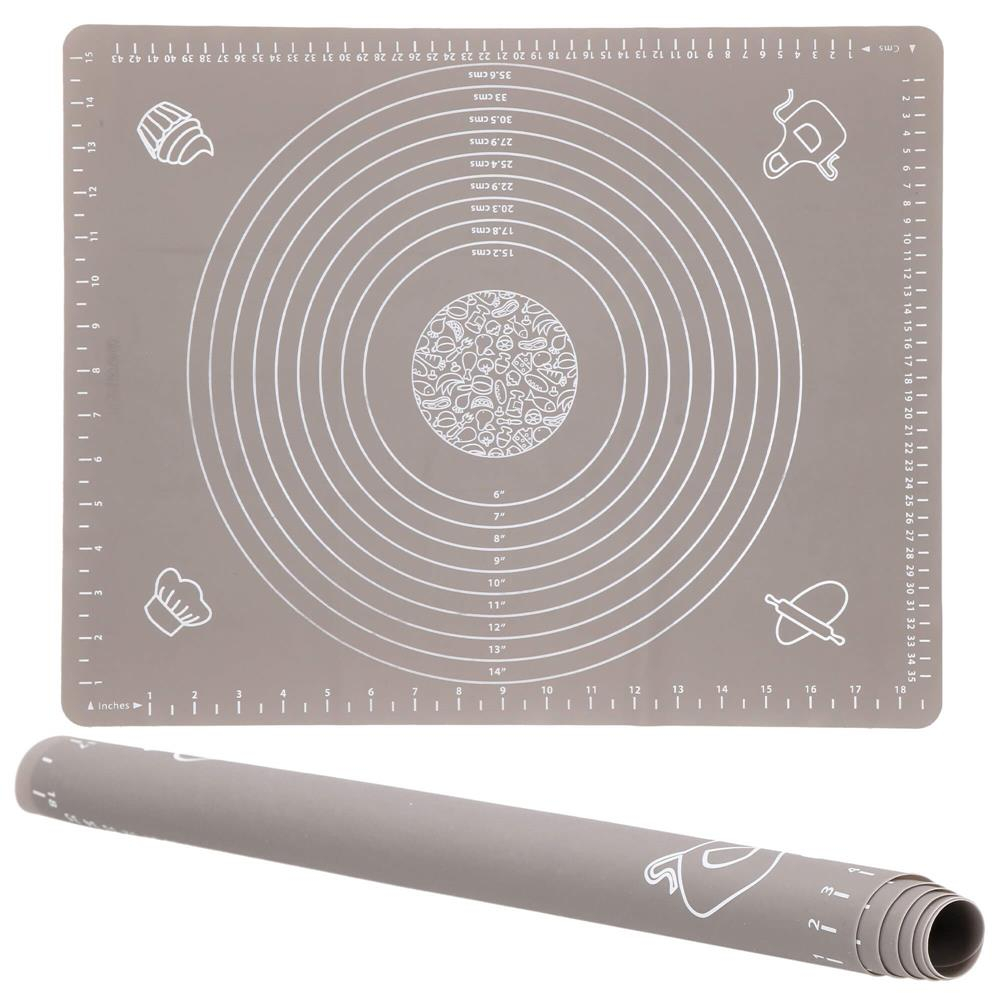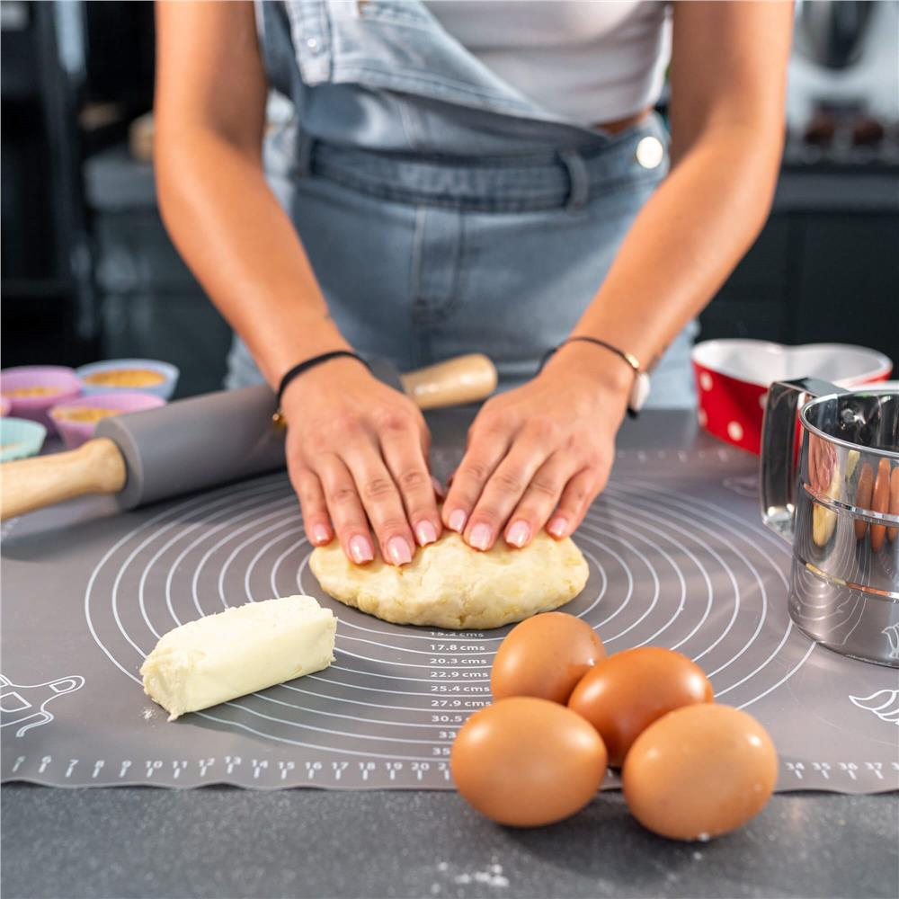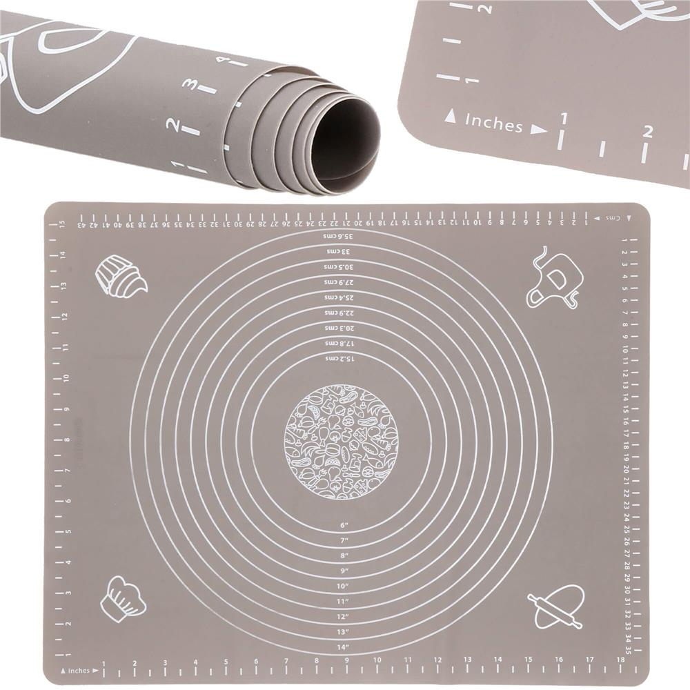Culoare: Gri Dimensiune: 50 x 40 cm Latime: 50 cm Inaltime: 40 cm Material: silicon Rezistenta in intervalul de temperatura: 260 pana la -60°C In plus: nu absoarbe mirosurile, ocupa foarte putin spatiu atunci cand este pliata Aceasta plansa din silicon este ideala pentru bucatarii.  Datorita flexibilitatii materialului, aceasta ocupa foarte putin spatiu atunci cand este rulata si poate fi depozitata chiar si intr-un sertar mic. Usor de curatat sub jet de apa Aluatul framantat manual nu se va lipi de silicon Nu necesita ungere Nu absoarbe mirosurile Are gradatii pentru lungime si diametru Nu se va deforma atunci cand este pliat in rulou Poate rezista la temperaturi cuprinse intre 260°C si -60°C, astfel incat puteti pune pe el oale calde Materialul nu se va deteriora atunci cand se decupeaza, de exemplu, prajituri de turta dulce Economiseste timp si spatiu Este antiderapant si nu va aluneca atunci cand framantati aluatul Orice bucatar de casa stie exact cum este sa framanti aluatul care se tot lipeste de blatul de lemn al mesei. Alegand accesoriul nostru din silicon, veti putea face aluat, galuste sau pizza fara niciun stres suplimentar. Cu cei mai mici membri ai familiei, puteti decupa cu usurinta diferite modele pentru turta dulce sau prajituri, iar acestea se vor desprinde de pe covoras fara probleme. Covorasul este fabricat din materiale de cea mai buna calitate. Alegand siliconul, se garanteaza ca nu va absorbi mirosurile sau umezeala din lichidele adaugate pentru prajituri. In plus, acest material este sigur pentru sanatate si neutru din punct de vedere alimentar. Adesea, retetele din cartile de bucate sau de pe bloguri au dimensiuni specifice ale prajiturilor care trebuie facute. Din acest motiv, plansa de patiserie din silicon este dotata cu gradatii de lungime si diametru. De asemenea, merita mentionat faptul ca acestea nu sunt convexe, deci nu se vor vedea pe aluat. Planuiti o excursie cu cortul, iar gatitul este un hobby si intentionati sa va aratati abilitatile in vacanta? Nici o problema! Puteti lua placa de patiserie din silicon cu dvs. pur si simplu rulati-o, astfel incat sa incapa in orice bagaj.