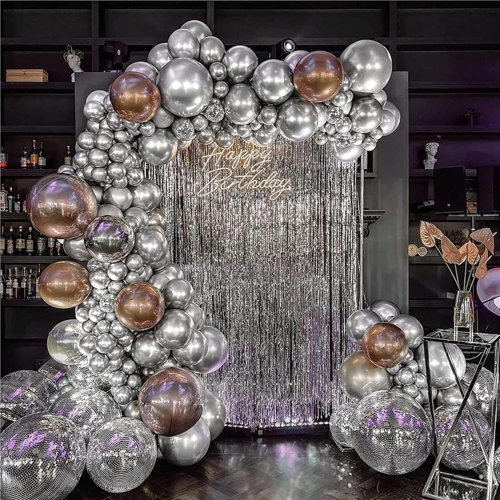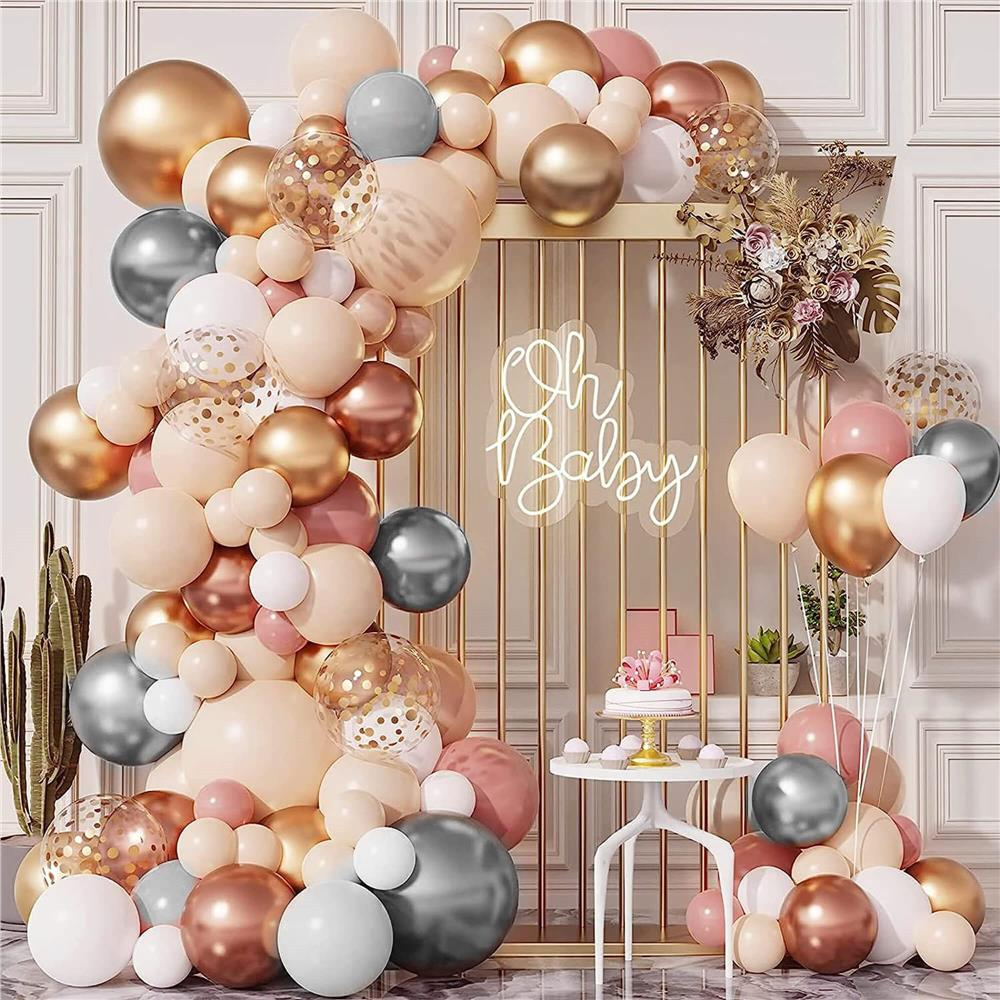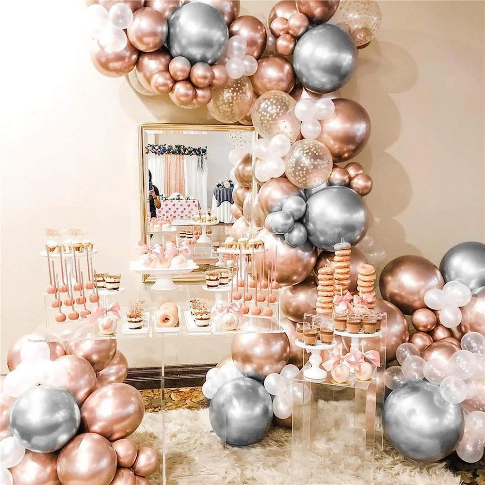Parametrii: Numar de piese per set: 50 + toleranta +/- 2 bucati Culoare: multicolor Inaltime dupa umflare: aprox. 40 cm Material: latex Baloanele sunt impresionante, ele pot crea decoratiuni multicolore cu un impact vizual mare pe care oaspetii le pot vedea de la intrare, de pe scaun sau dansand. Decoratiunile din baloane dau o deosebita culoare atmosferei, petrecerea va fi magica. Culoare intensa atunci cand baloanele sunt umflate Festivitatea ta va arata gata de instagram-ready! Buchetele mari de baloane colorate dau ringului de dans un farmec aparte. Arcade decorate cu baloane vor pune in prim plan masa sarbatoritilor si intreaga incapere. Indiferent daca doresti sa decorezi o mica petrecere, o receptie sau o nunta, decoratiunile noastre cu baloane vor  transforma evenimentul intr-o experienta extraordinara. Setul include: 12x baloane gri metalizat 10x balon alb 18x balon roz metalizat 10x balon transparent cu confetti
