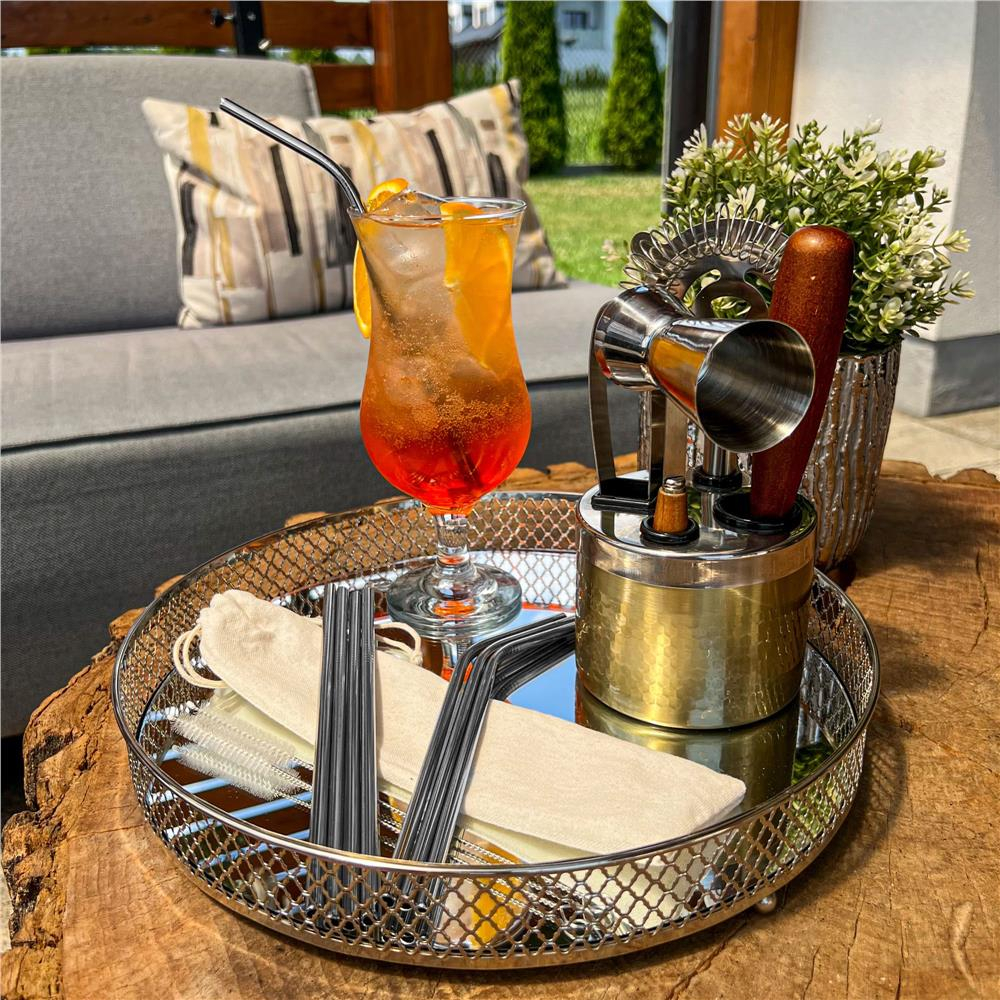Material: otel inoxidabil Culoare: argintiu Numar de paie: 8 Am vazut cu totii consecintele asupra mediului ale utilizarii excesive a plasticului si a obiectelor de unica folosinta, cum ar fi pungile de plastic si paiele de unica folosinta cu aspect aparent inofensiv, care au fost utilizate pe scara larga in intreaga lume pana in prezent. Din fericire, puteti incepe cu usurinta sa faceti mici schimbari care au un impact urias asupra mediului la scara globala si sa incepeti sa folositi produse reutilizabile, cum ar fi paiele metalice din otel inoxidabil, care pot fi spalate cu periile incluse pentru o perioada foarte lunga de timp.  economisiti - este o achizitie unica pentru o perioada lunga de timp, deci economii pure si simple   pana la 8 intr-un set - pastrati-le acasa, in geanta sau la serviciu   realizate din otel inoxidabil - cel mai mare avantaj al sau este rezistenta la coroziune, datorita adaosului de crom  sigure pentru sanatate - nu contin BPA sau alte substante nocive   nu altereaza gustul - va puteti bucura de bauturile preferate fara sa va faceti griji cu privire la un gust ciudat  sunt rezistente la caldura - atat la temperaturi scazute, cat si la temperaturi ridicate  sunt ondulate in partea de sus - paiele nu vor aluneca in mana   2 perii de curatare - potrivite ca marime si diametru, ideale pentru mentinerea igienei necesare  Setul include: 4x paie drepte din otel 4x paie de otel curbate 2x perii de curatare geanta practica de transport Cele 2 perii de curatare incluse, cu capat rotund pentru a evita deteriorarea interiorului, va permit sa va pastrati cu usurinta setul de paie curate. Acestea se potrivesc usor in husa de transport, se usuca rapid si fac ca inceperea utilizarii lor sa fie un lucru simplu.