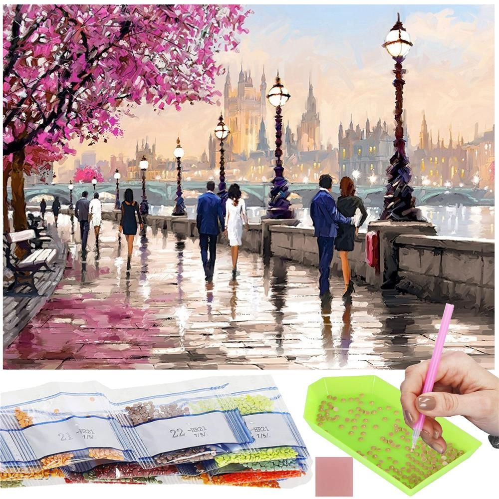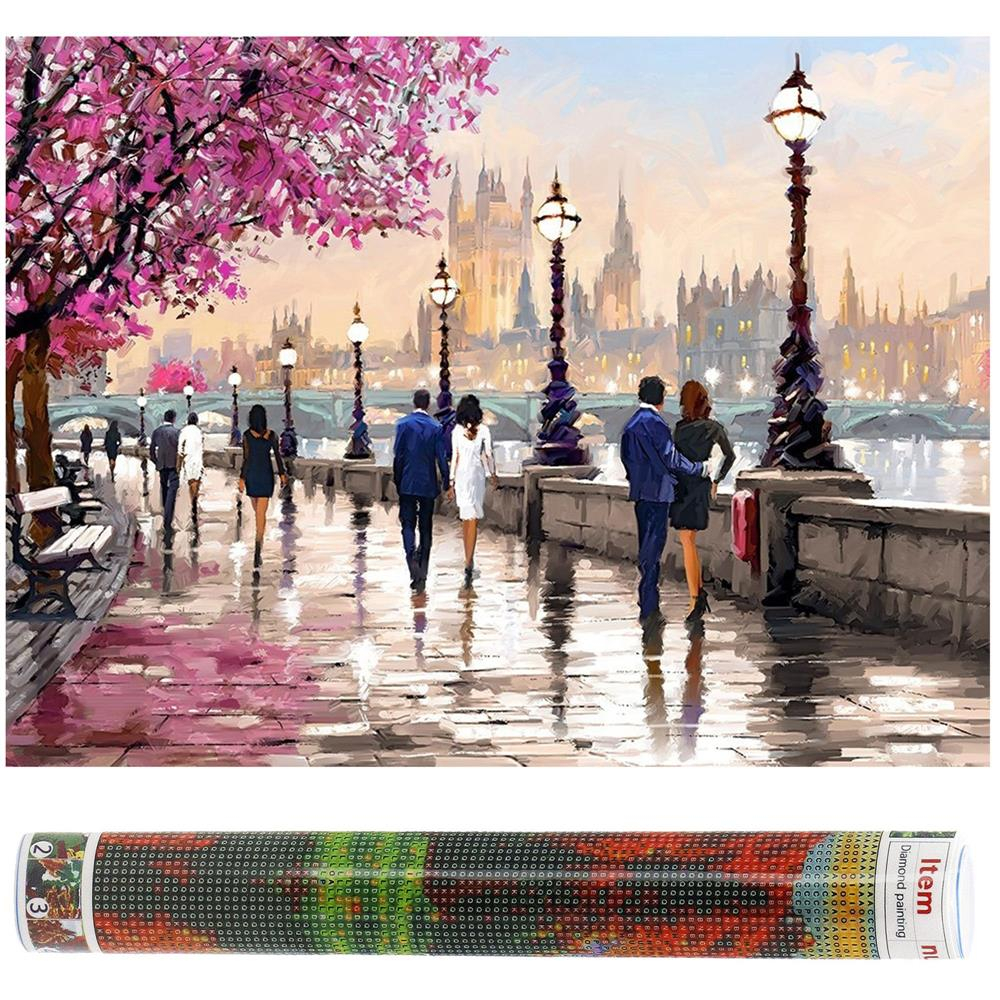 Dimensiuni: 40x30 cm Material: acrilic Culoare: multicolor Model: peisaj urban Setul include: Panza puternica cu imagine imprimata Aplicator roz pentru prinderea si lipirea diamantelor Tava...