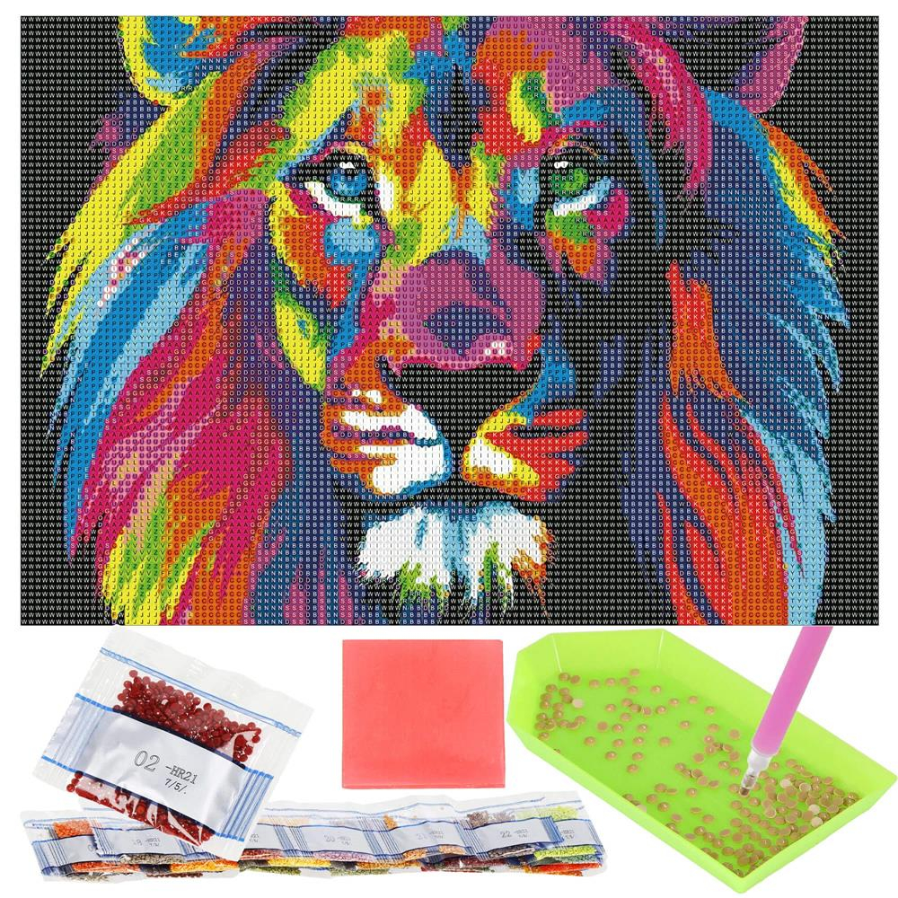 Dimensiuni: 30x40 cm Material: acrilic Culoare: multicolor Model: leu Setul include: Panza puternica cu imagine imprimata Aplicator roz pentru prinderea si lipirea diamantelor Tava verde...