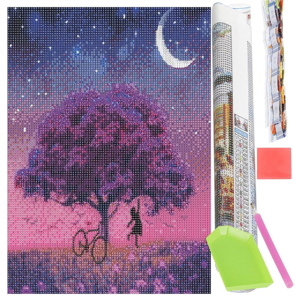 Set de broderie cu diamante 5D, 30x40cm, model Pom inflorit sub luna
