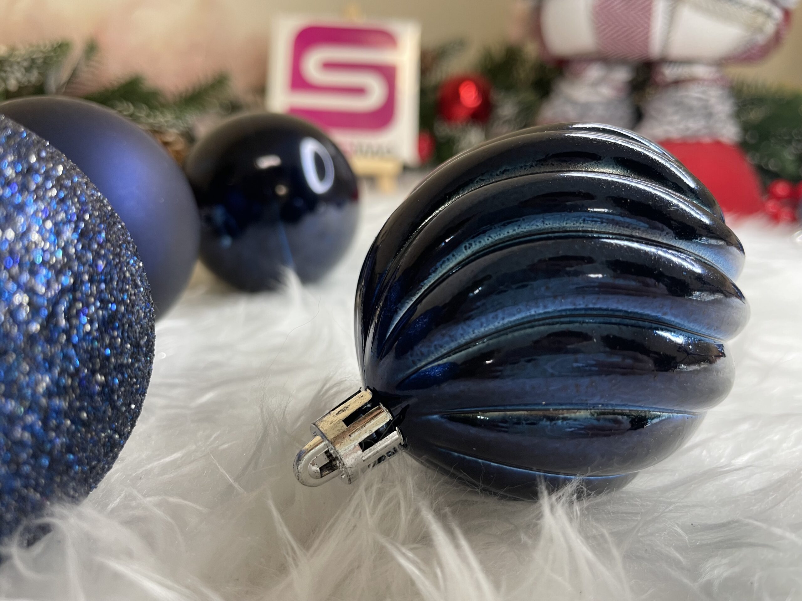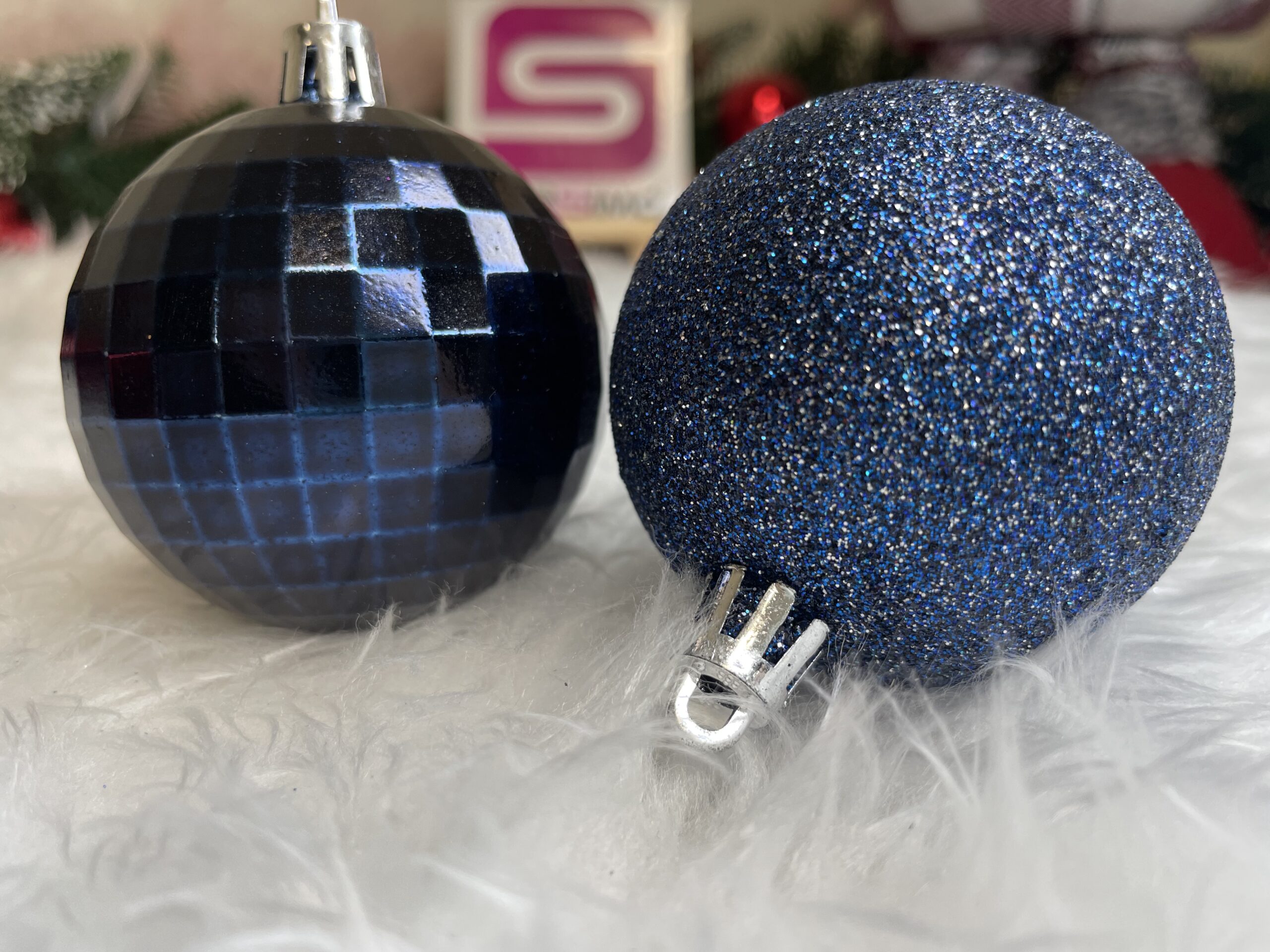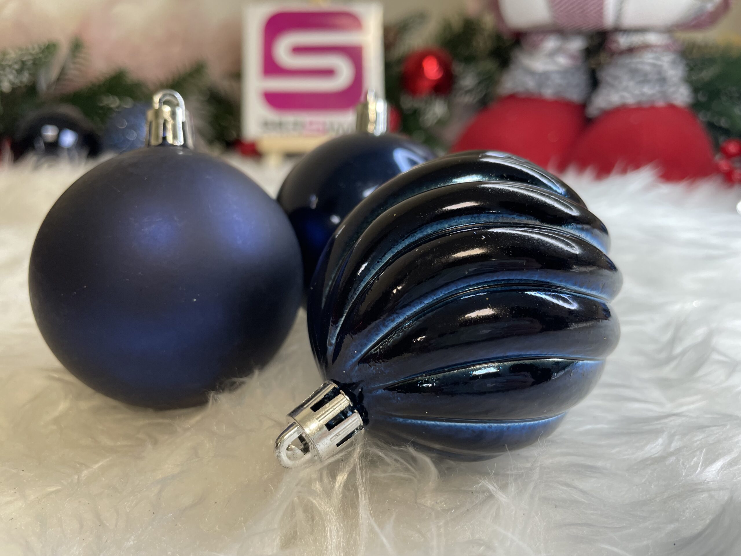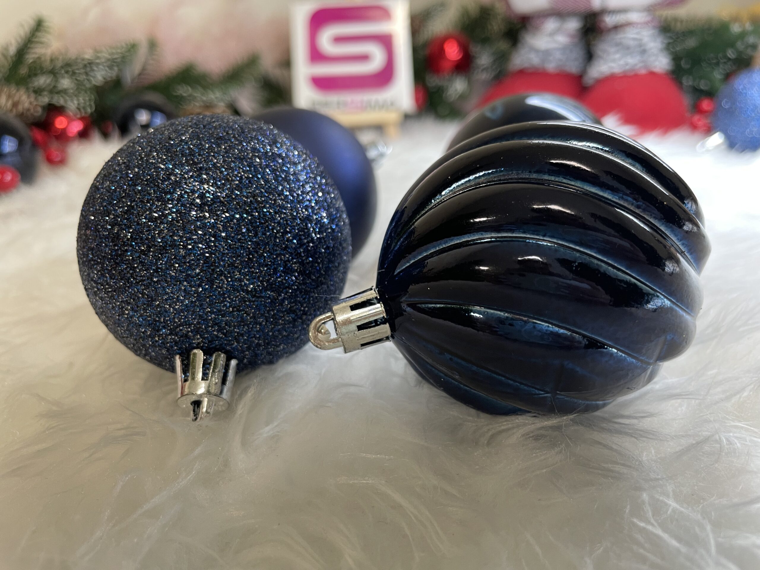 Culoare: bleumarin inchis / albastru inchis Material: plastic Dimensiune: 6 cm Cantitate: 20 globulete Modele: mat, cu sclipici, in relief si bile disco Incasabil, snur...