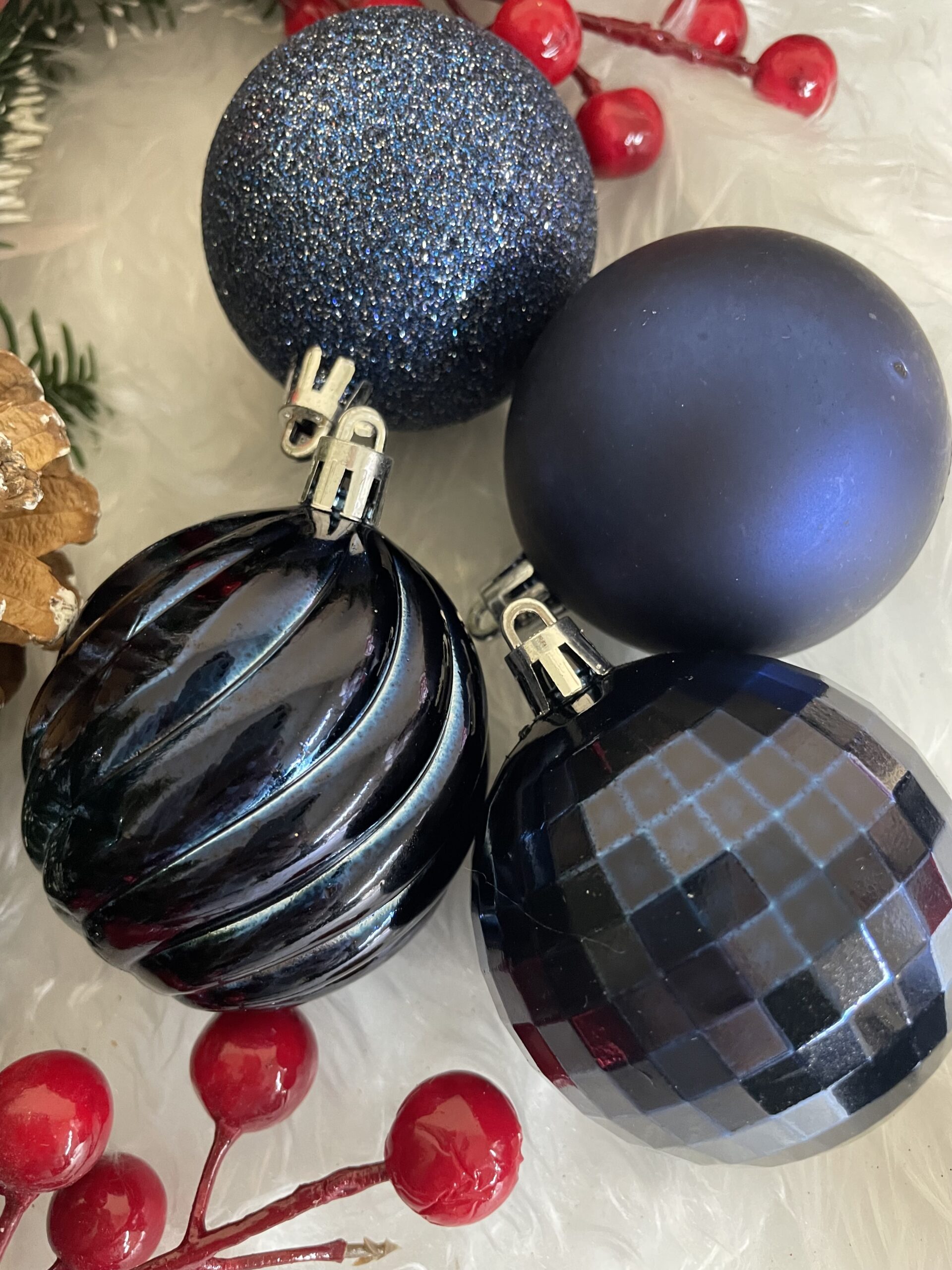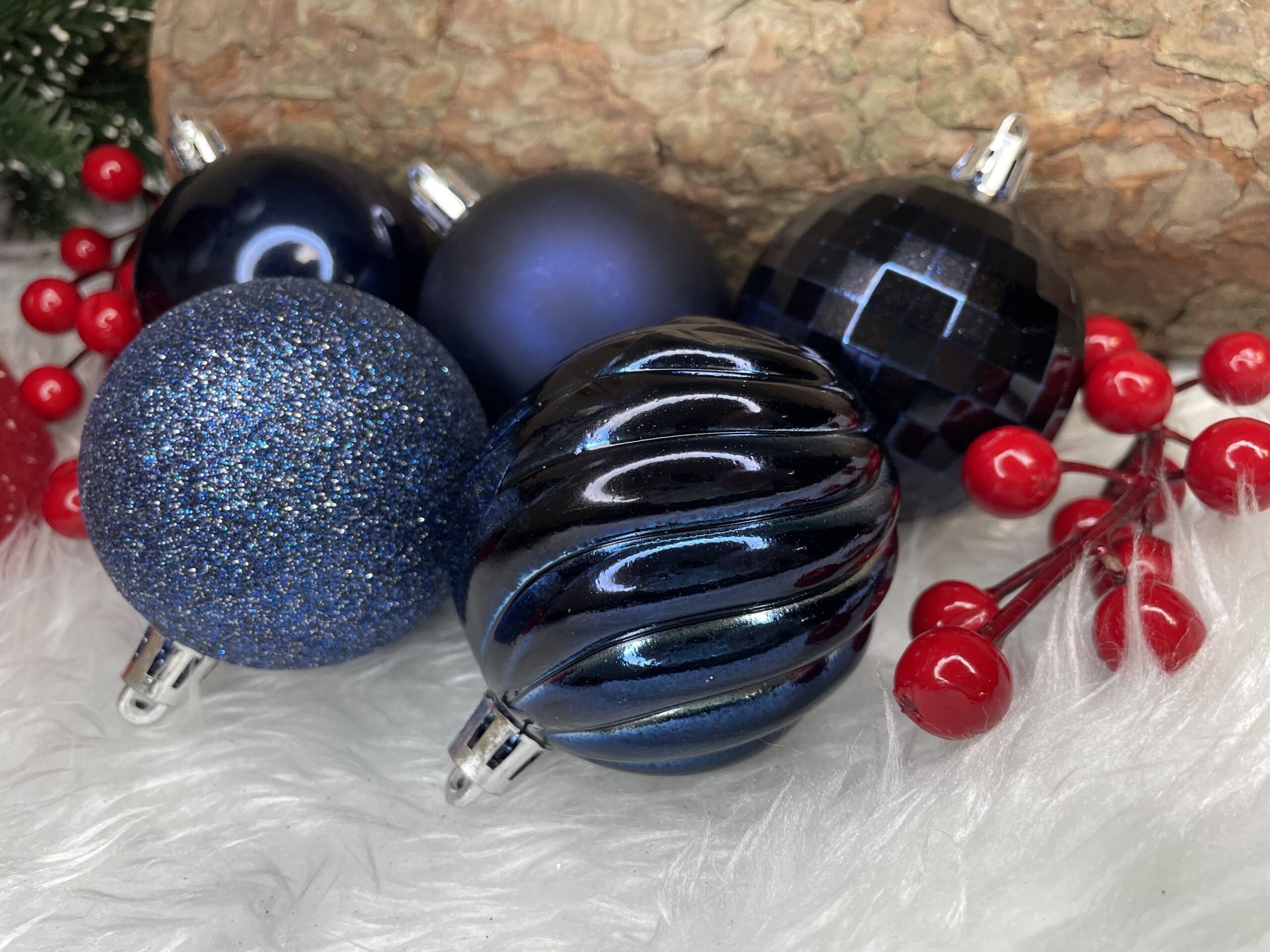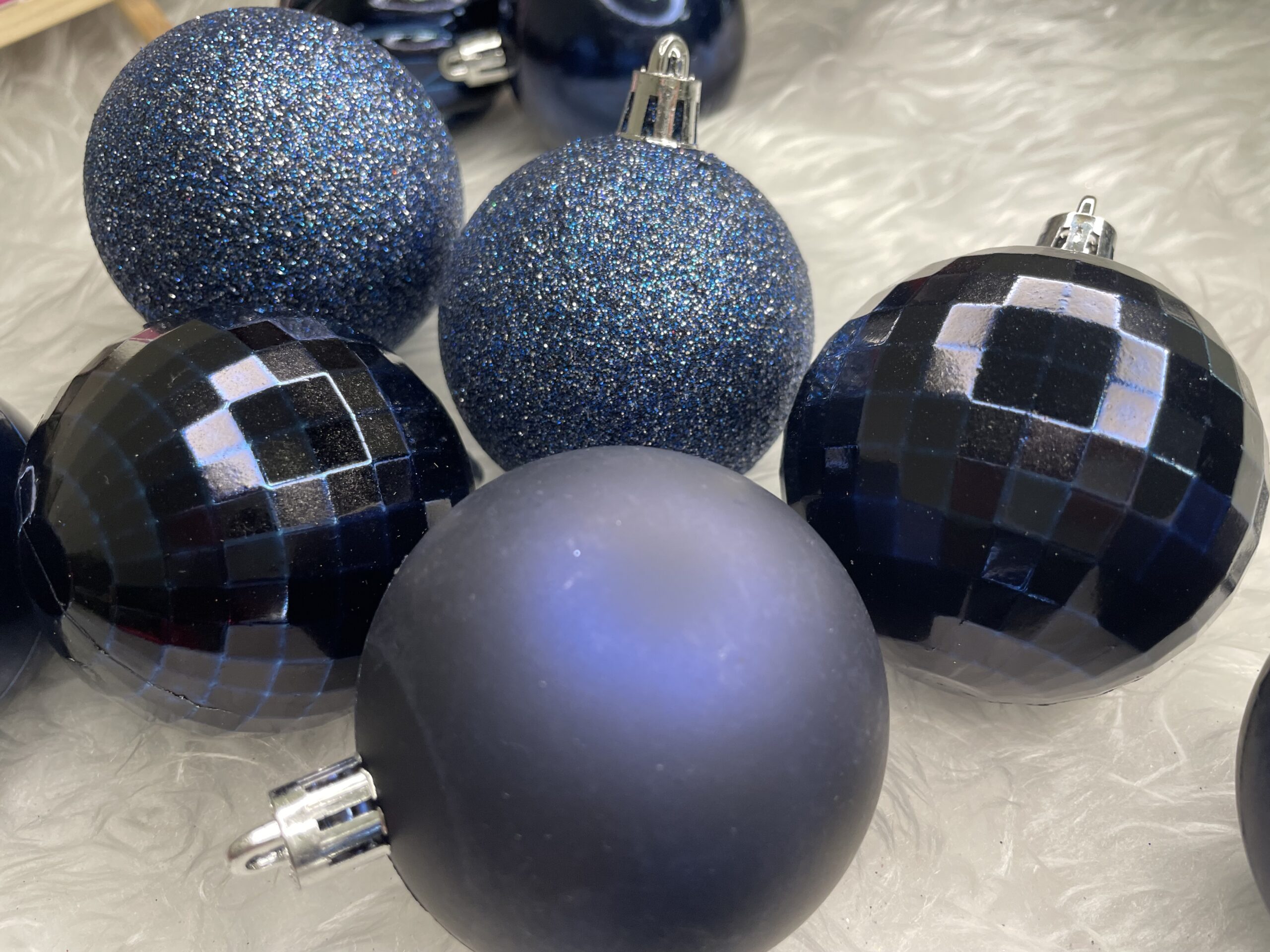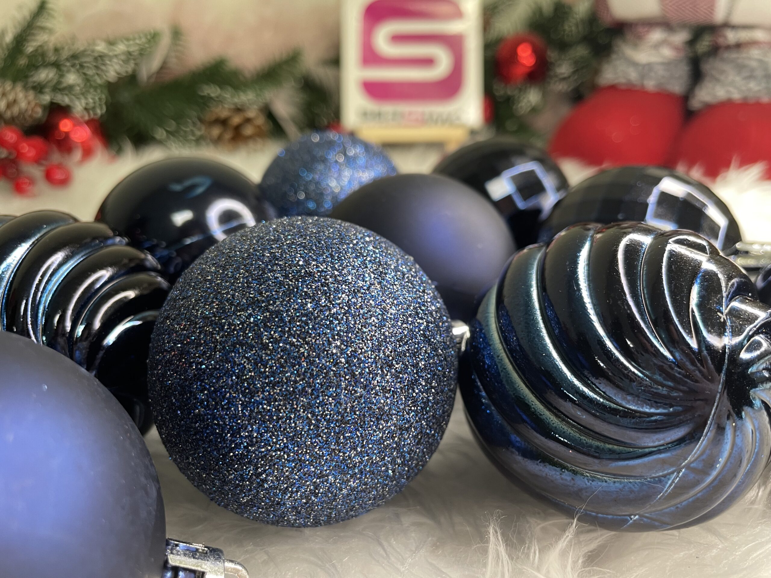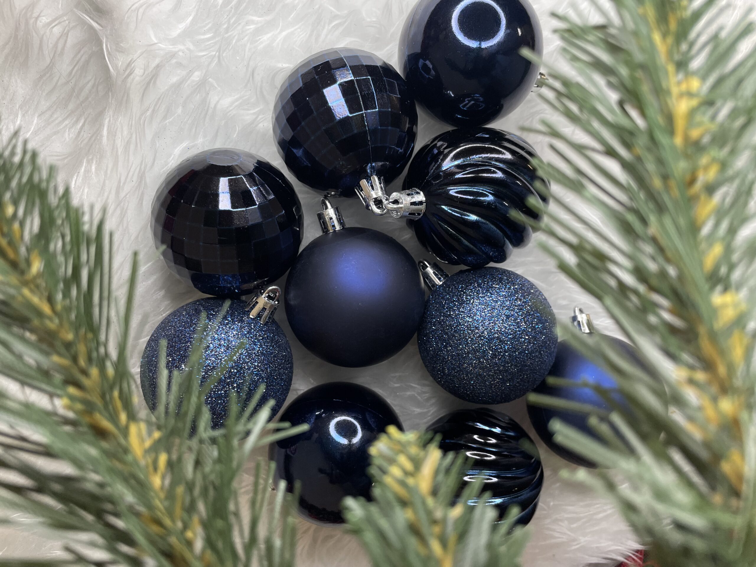 Culoare: bleumarin inchis / albastru inchis Material: plastic Dimensiune: 6 cm Cantitate: 20 globulete Modele: mat, cu sclipici, in relief si bile disco Incasabil, snur...
