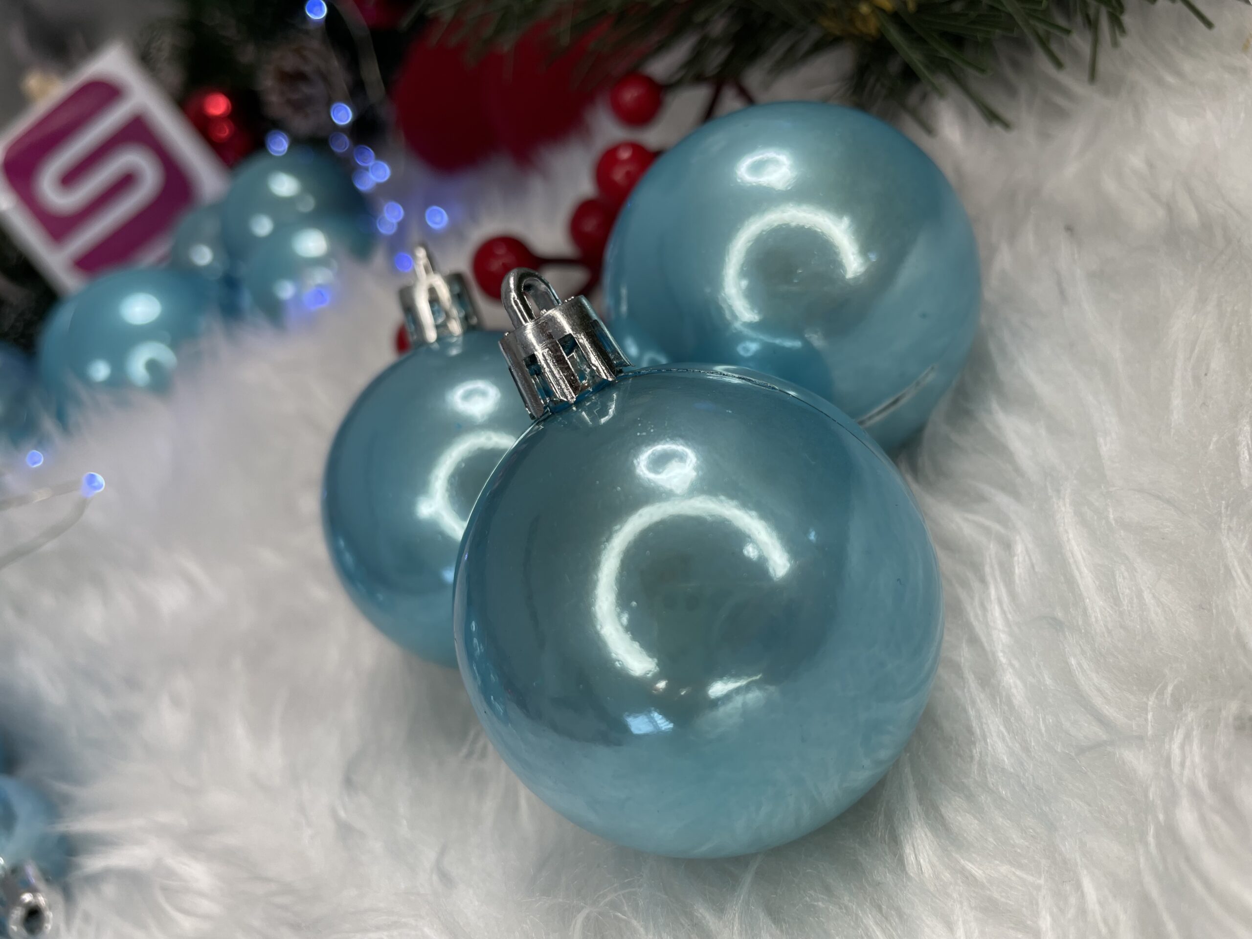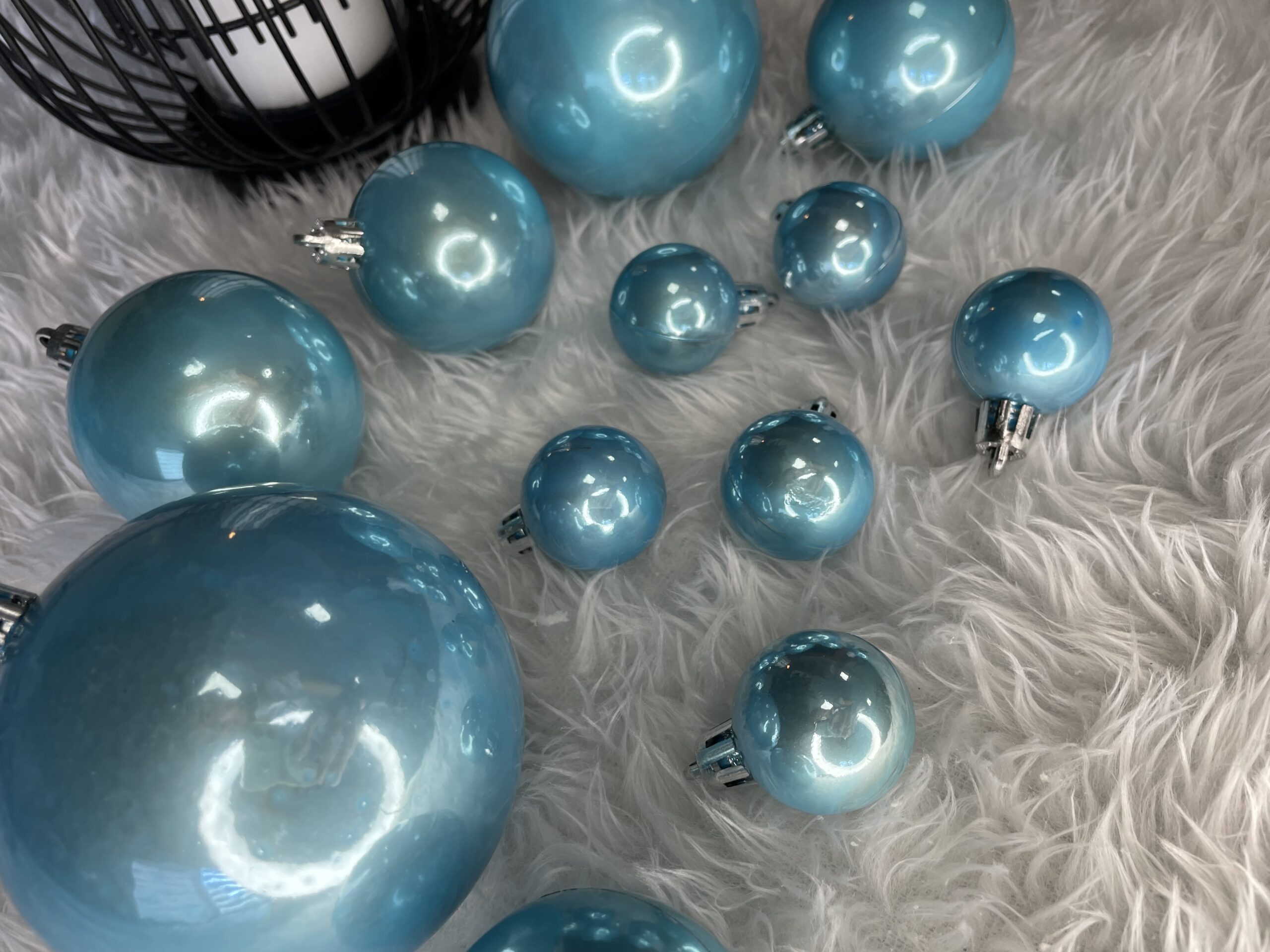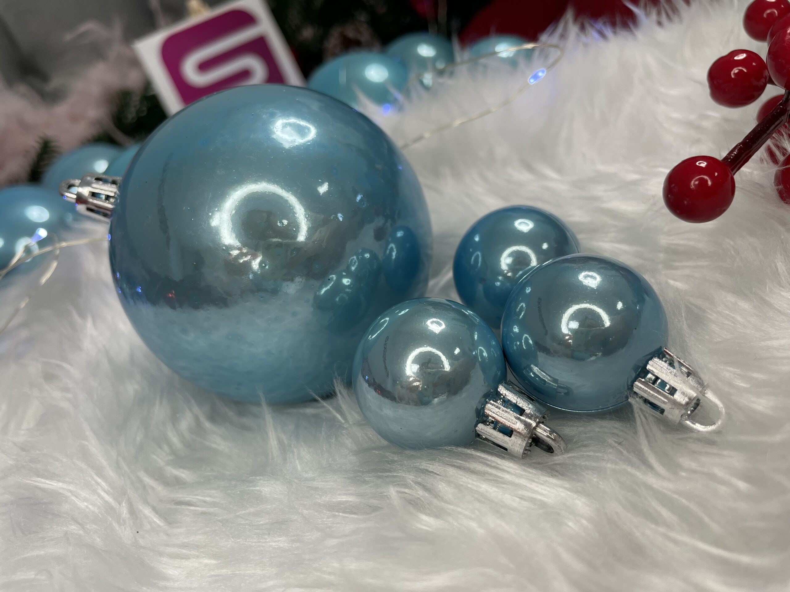 Globurile dintr-un set cu o singura culoare va vor permite sa creati un decor minunat pentru brad. Arata frumos in timpul zilei si dupa intuneric, insotite de iluminat festiv. Setul include snururi care va permit sa agatati globurile rapid si usor in locul dorit. Designul din plastic creste siguranta datorita materialului incasabil. Alegerea lor in locul globurilor de sticla va contribui la siguranta celor mici din casa. Diversele dimensiuni va permit sa creati modele inedite de aranjare a bradului de Craciun. Culoare: albastru perla Material: plastic Cantitate: 37 bucati globuri (+/- 1 bucata) Setul include urmatoarele globuri Mini 10x - 3 cm Mic 10x - 5 cm Mediu 8x - 6 cm Mare 5x - 7 cm Maxi 4x - 8 cmAtentie! Numarul de piese din set poate varia + - 1 buc.
