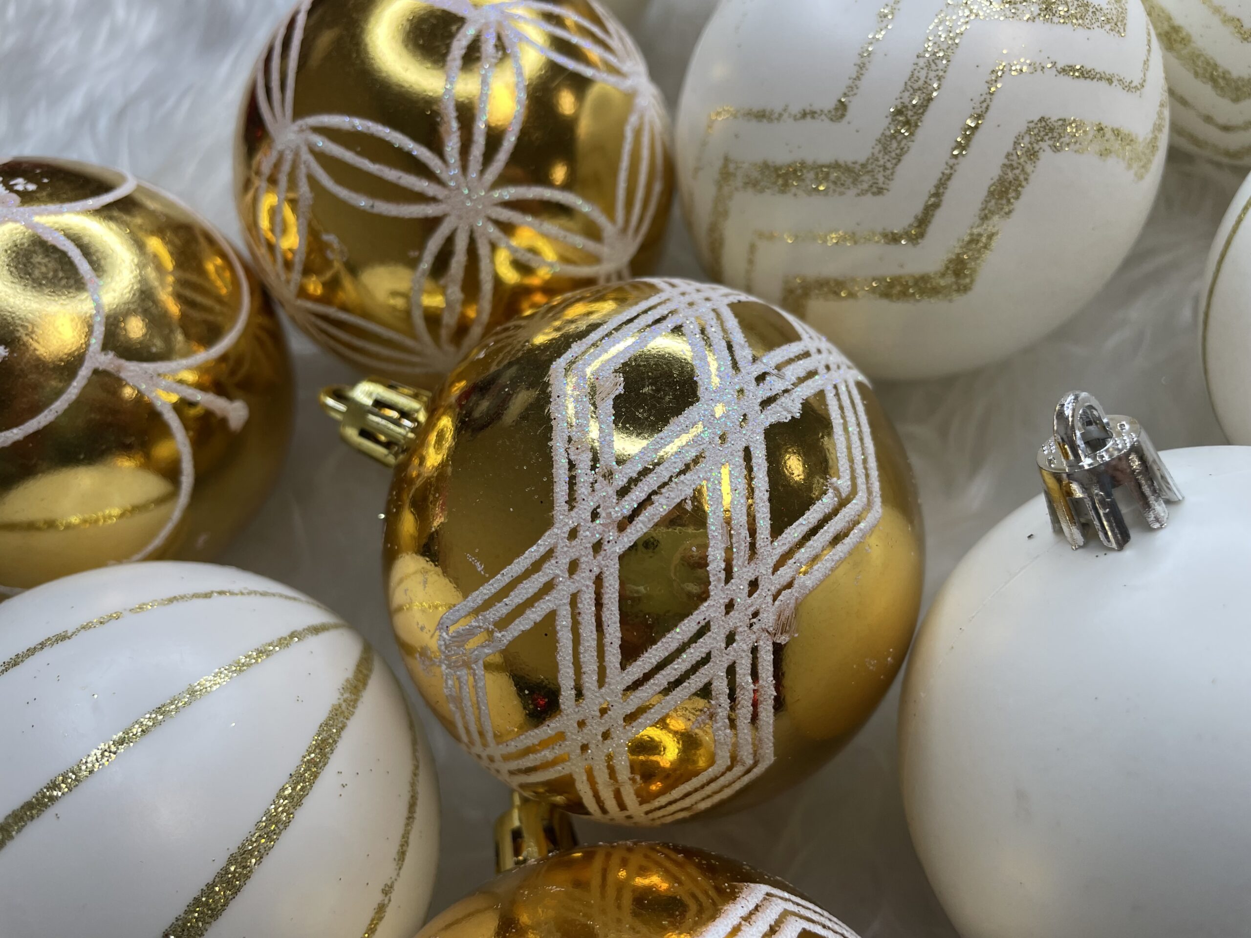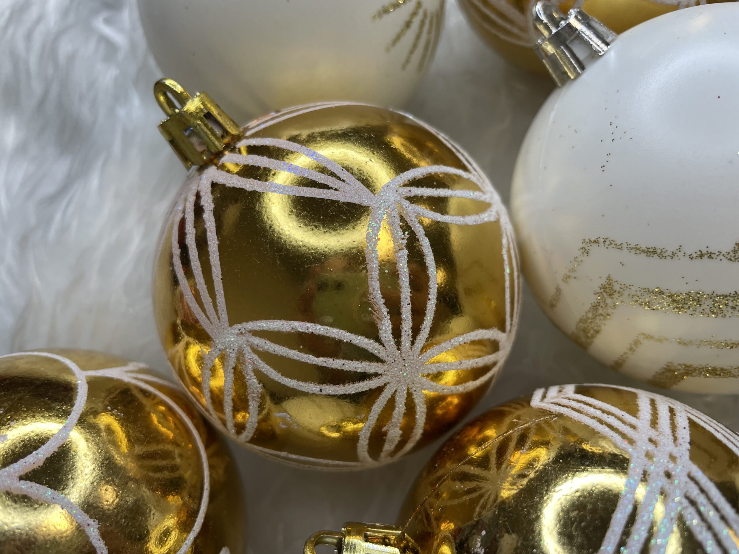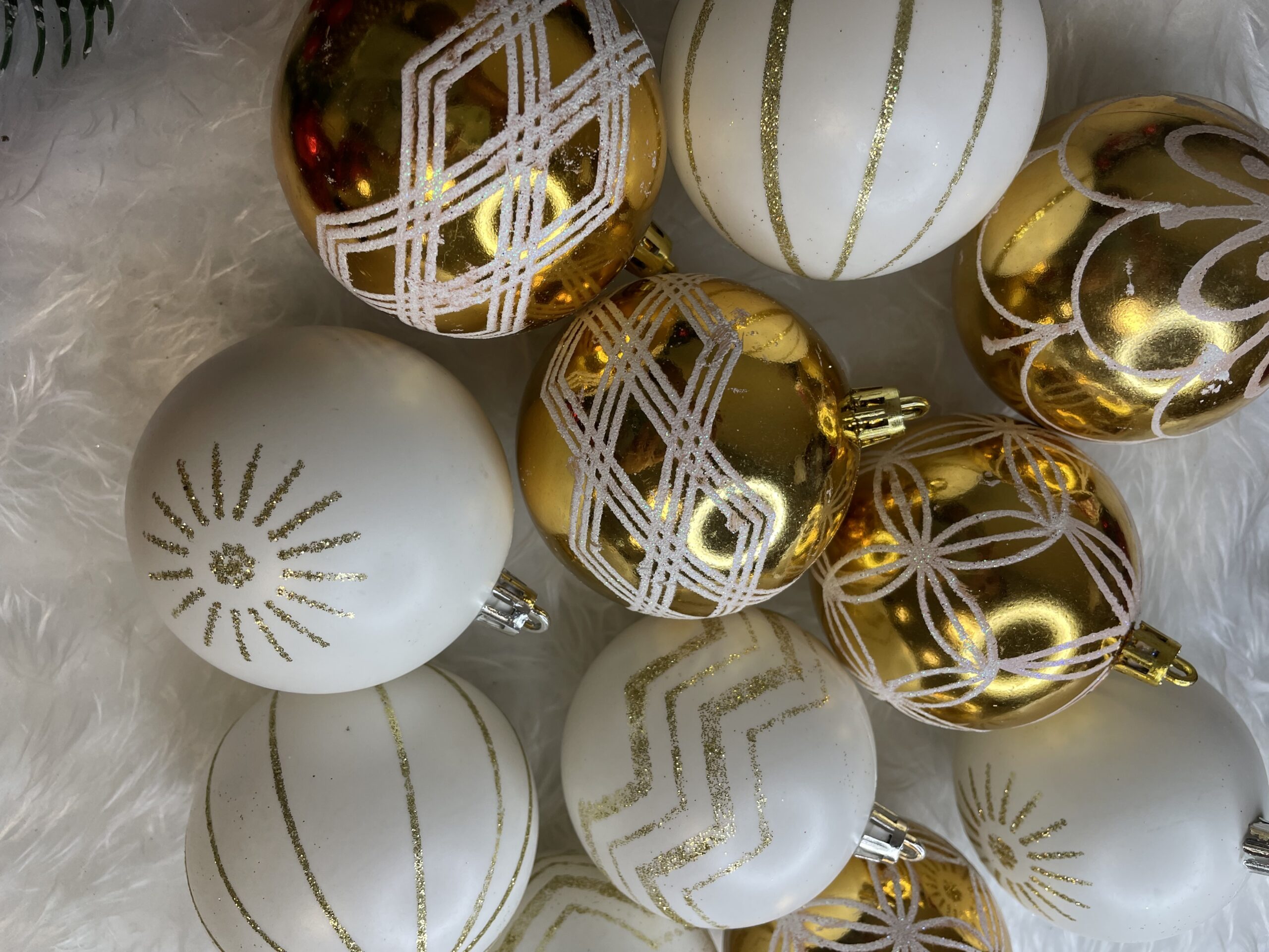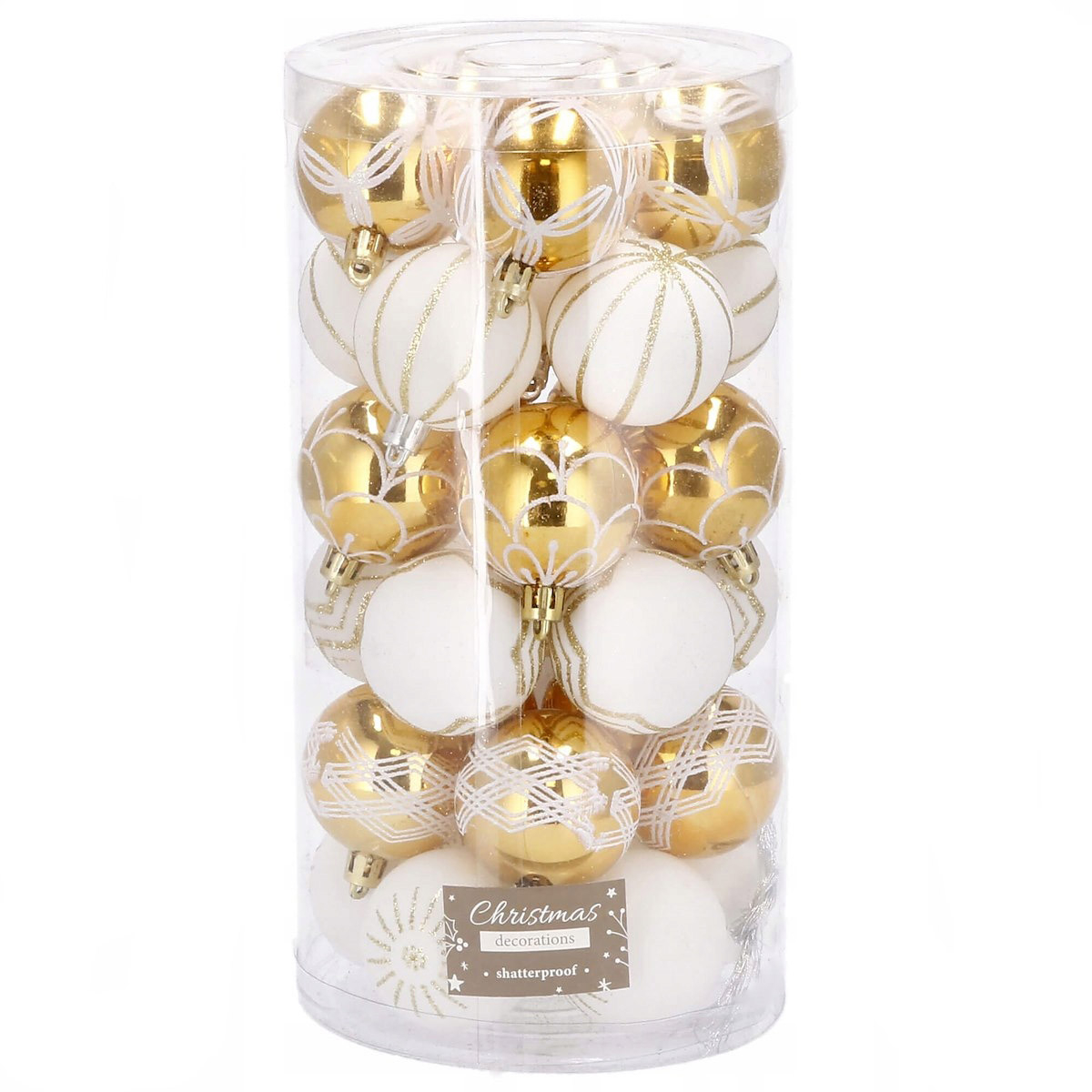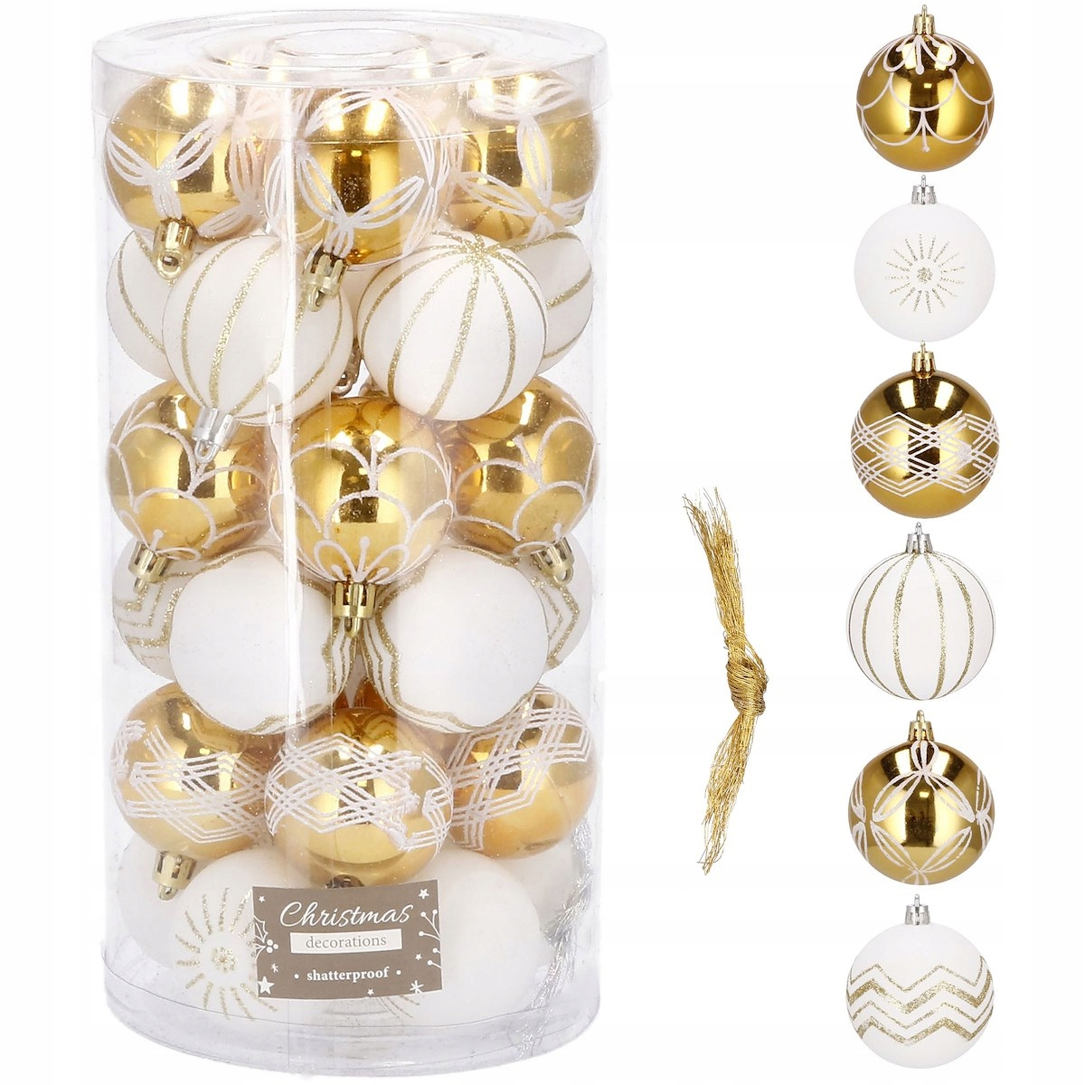 Set globuri de Craciun cu modele de sarbatori, 30 bucati, 5cm, alb auriu