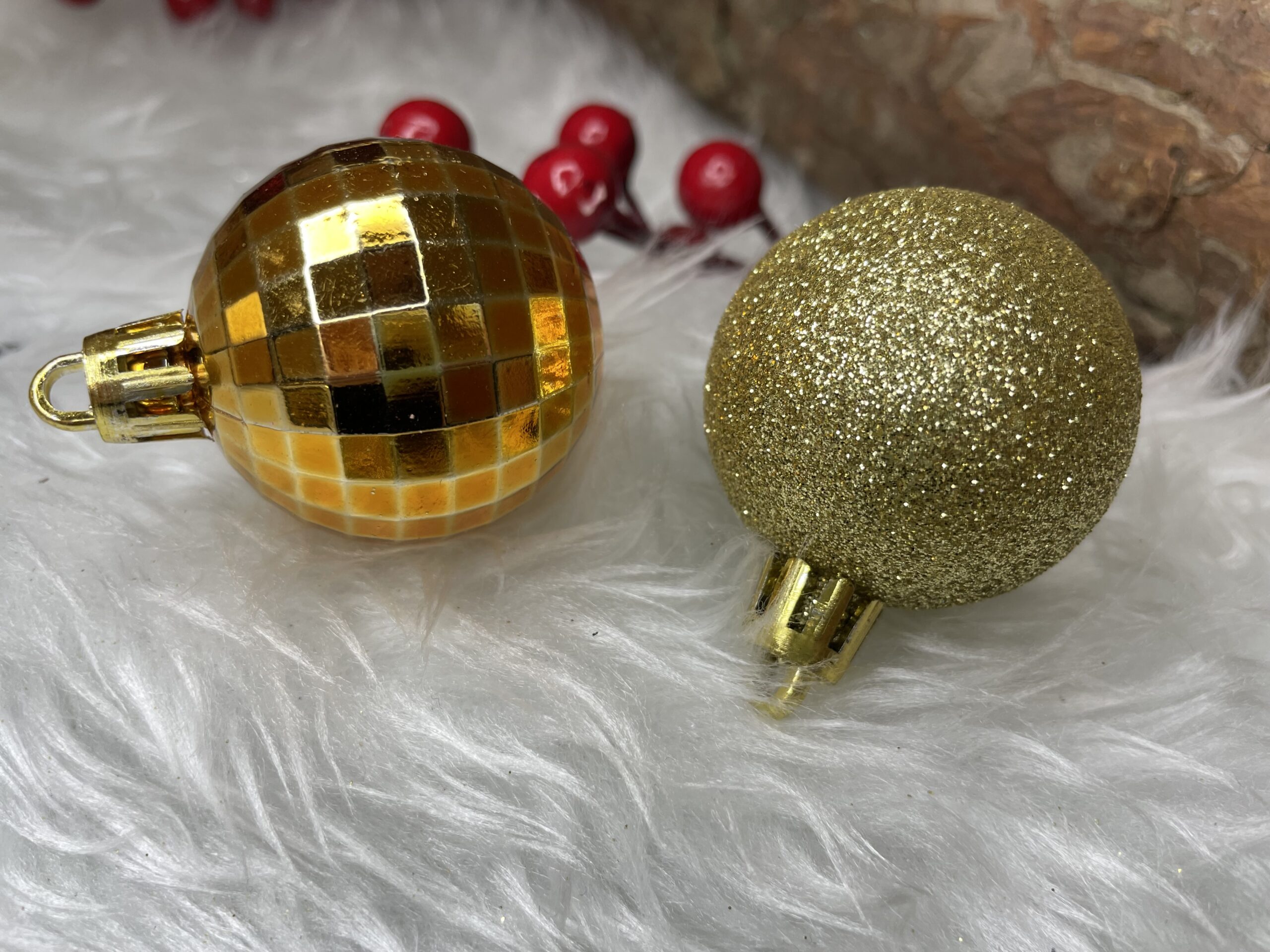 Culoare: auriu Material: plastic Cantitate: 155 piese Modele: 22 modele diferite incluse in set Diametru: diverse marimi Globurile si decoratiunile dintr-un set cu o singura culoare va vor permite sa creati un decor minunat pentru brad. Arata frumos in timpul zilei si dupa intuneric, insotite de iluminat festiv. Setul include snururi care va permit sa agatati globurile rapid si usor in locul dorit. Designul din plastic creste siguranta datorita materialului incasabil. Alegerea lor in locul globurilor de sticla va contribui la siguranta celor mici din casa. Diversele dimensiuni va permit sa creati modele inedite de aranjare a bradului de Craciun. Setul include urmatoarele piese 6x diamant - 7 cm 6x Clopot - 7 cm 6x Con - 11 cm 4x Trestie / acadea - 13 cm 6x Icicleta din sfere - 11 cm 6x Ghinda - 9 cm 4x Bomboane (cilindru) - 12 cm 4x Bomboane (rotunde) - 12 cm 3x Manusi Mat - 5 cm 3x manusi lucioase - 5 cm 4x Mini rotund (sclipici) - 4 cm 4x Round mini (finis lucios) - 4 cm 4x Mini rotund (mat) - 4 cm 6x Rotund mic (sclipici) - 5 cm 6x Rotund mic (lucius) - 5 cm 6x Rotund mic (mat) - 5 cm 6x rotund mic (minge disco) - 5 cm 6x rotund mediu (sclipici) - 6 cm 6x rotund mediu (mat) - 6 cm 6x rotund mediu (lucius) - 6 cm 6x rotund mediu (sclipici-stralucire) - 6 cm 4x Rotund mare (minge disco) - 8 cm 4x Rotund mare (decoratiuni roz si alb) - 8 cm 4x Rotund mare (ornament alb si roz) - 8 cm 1x Rotund maxi (sclipici) - 10 cm 1x Rotund maxi (mat) - 10 cm 1x Rotunda maxi (lucioasa) - 10 cm 4x Star (sclipici-stralucire) - 8 cm 4x Steaua (stralucire) - 9 cm 4x Inima - 7 cm 6x Icicle - 19 cm 12x Steaua plata (sclipici) - 10 cm Atentie! Numarul de piese din set poate varia + - 2 buc.