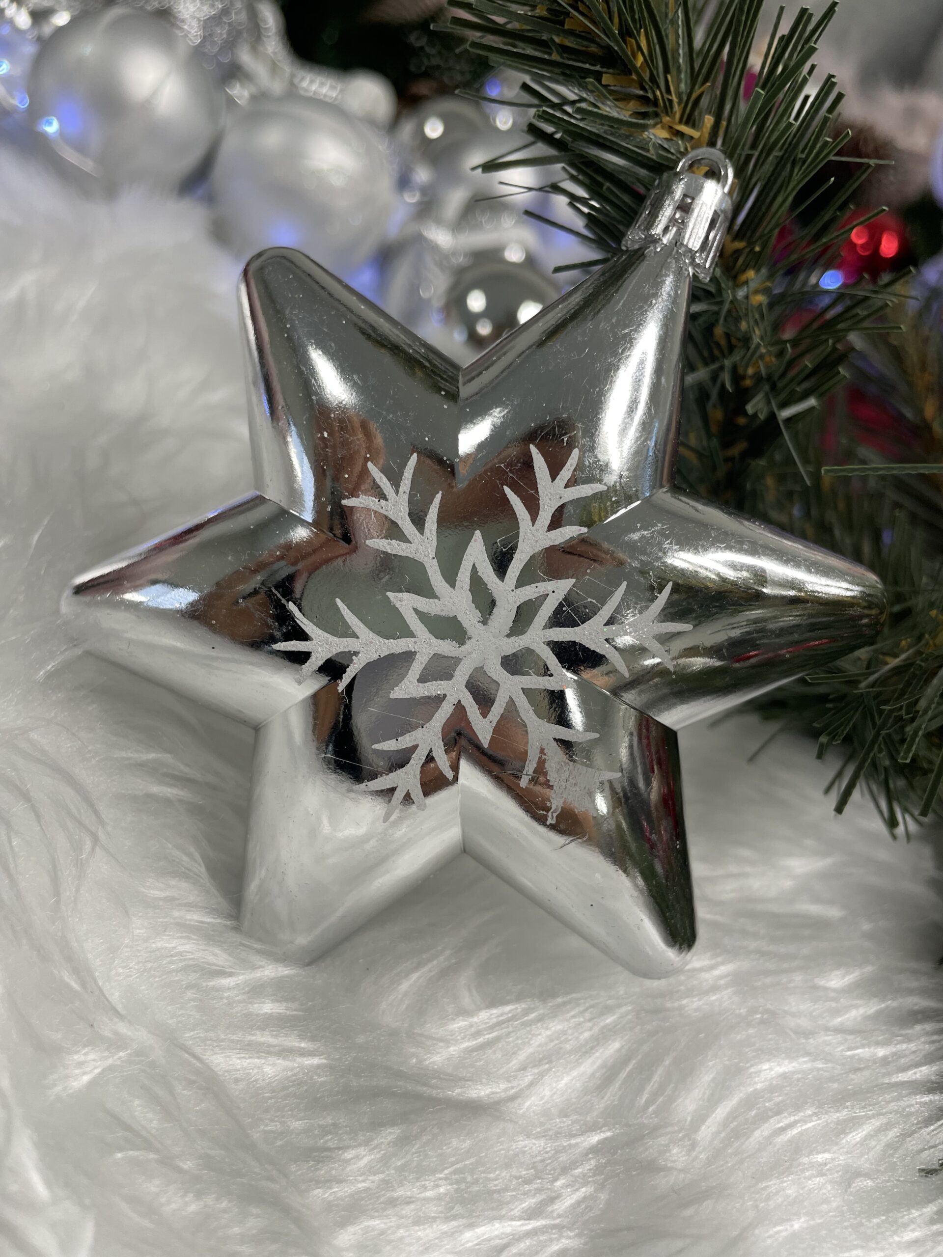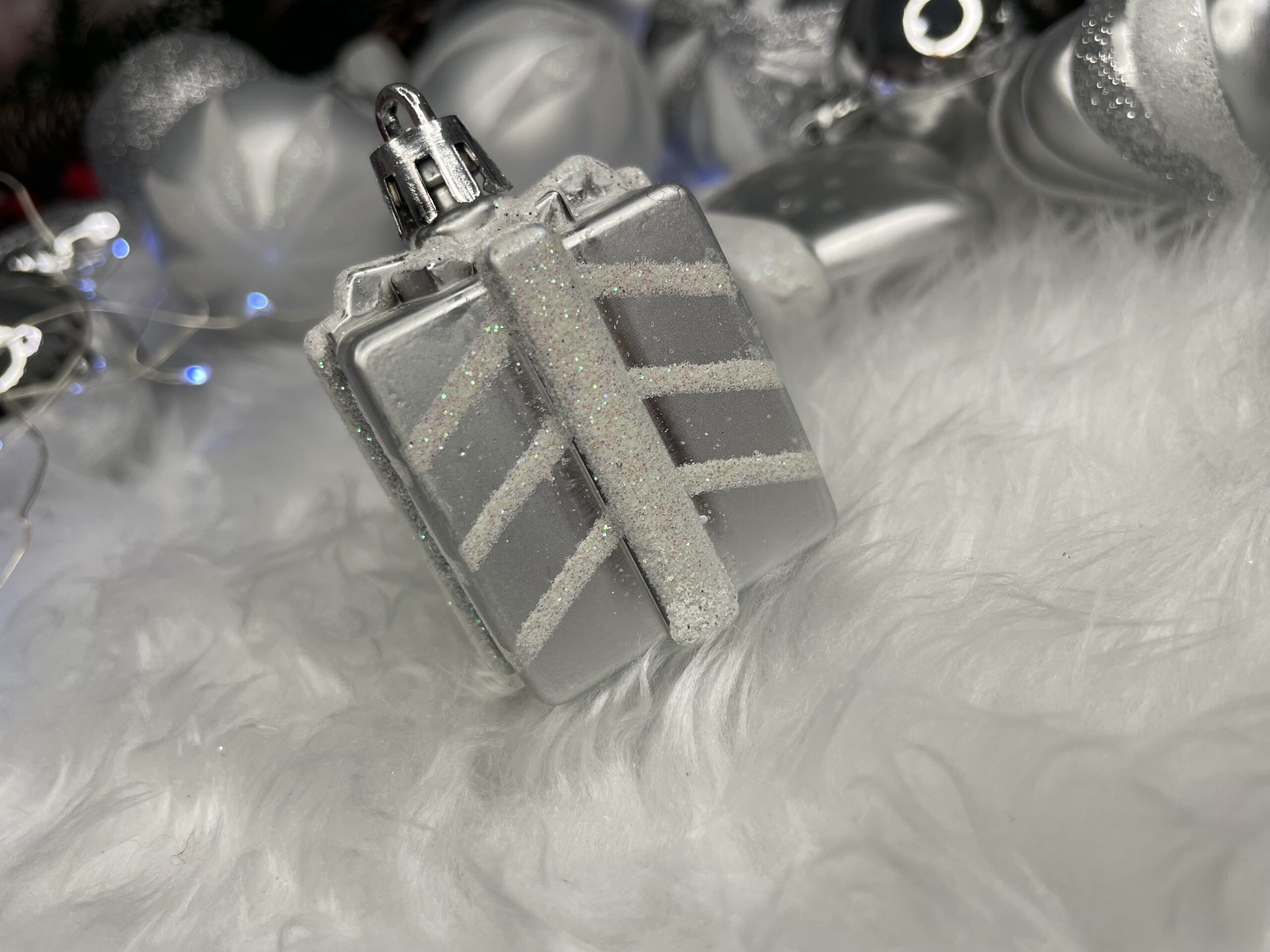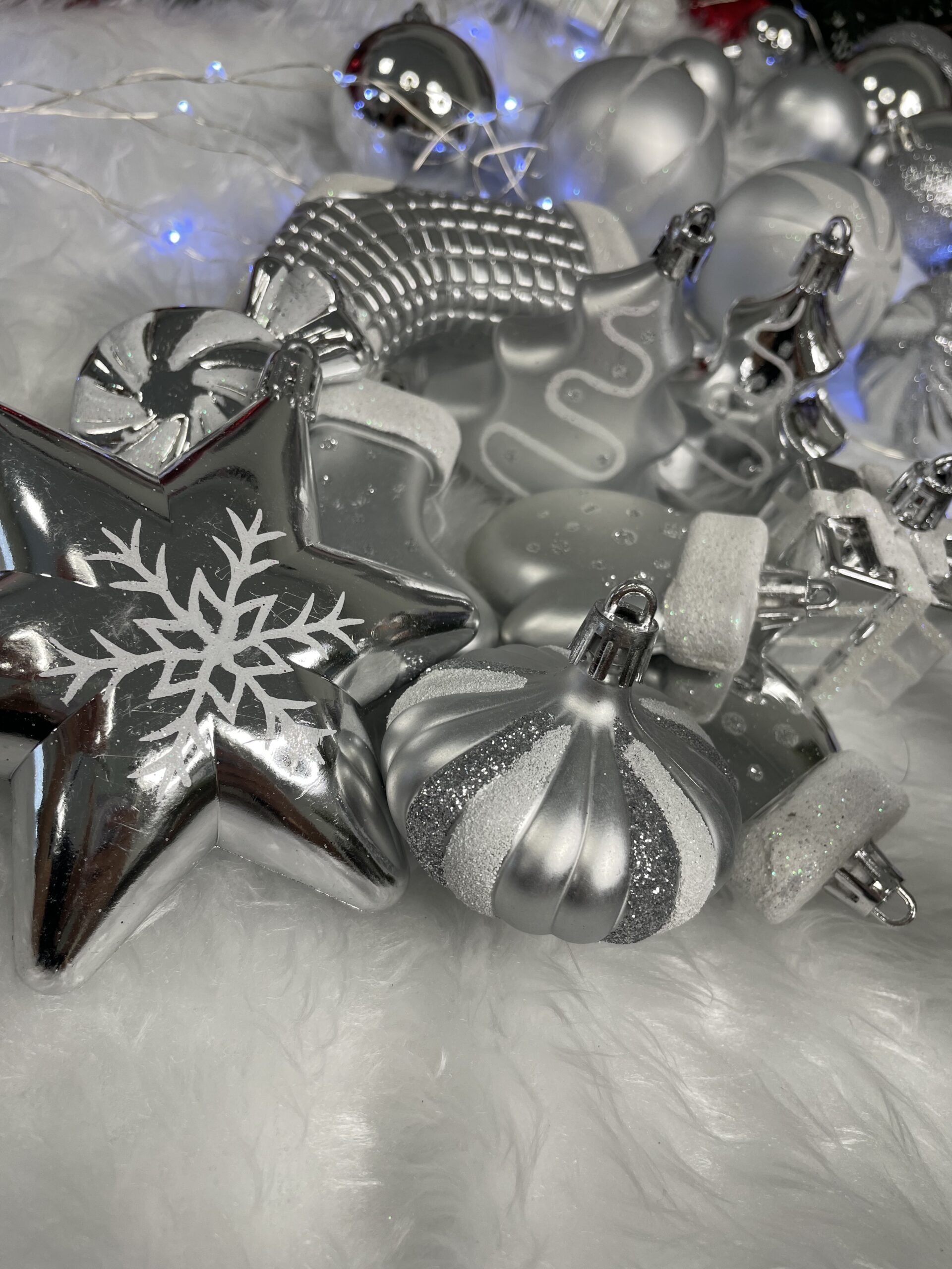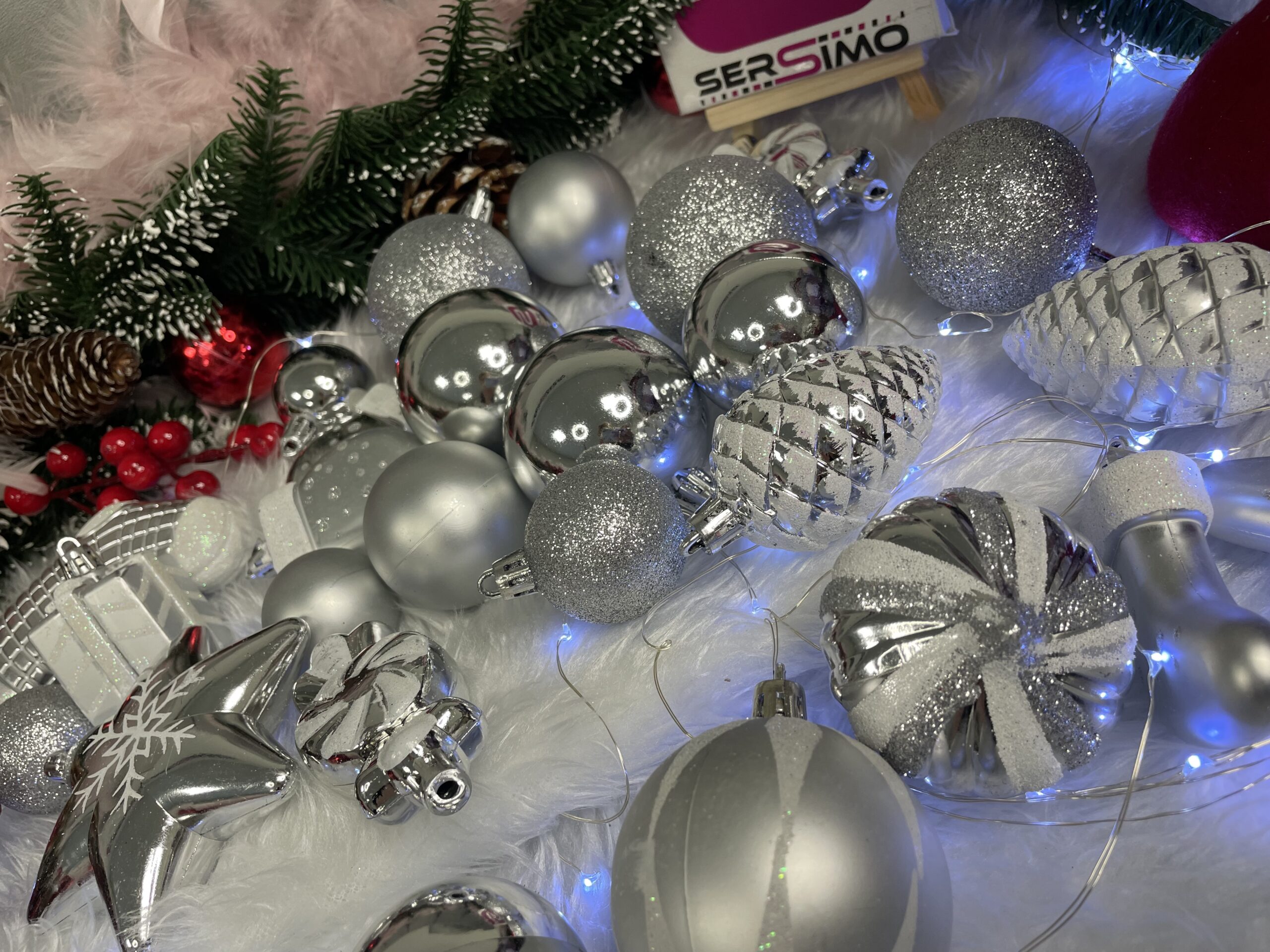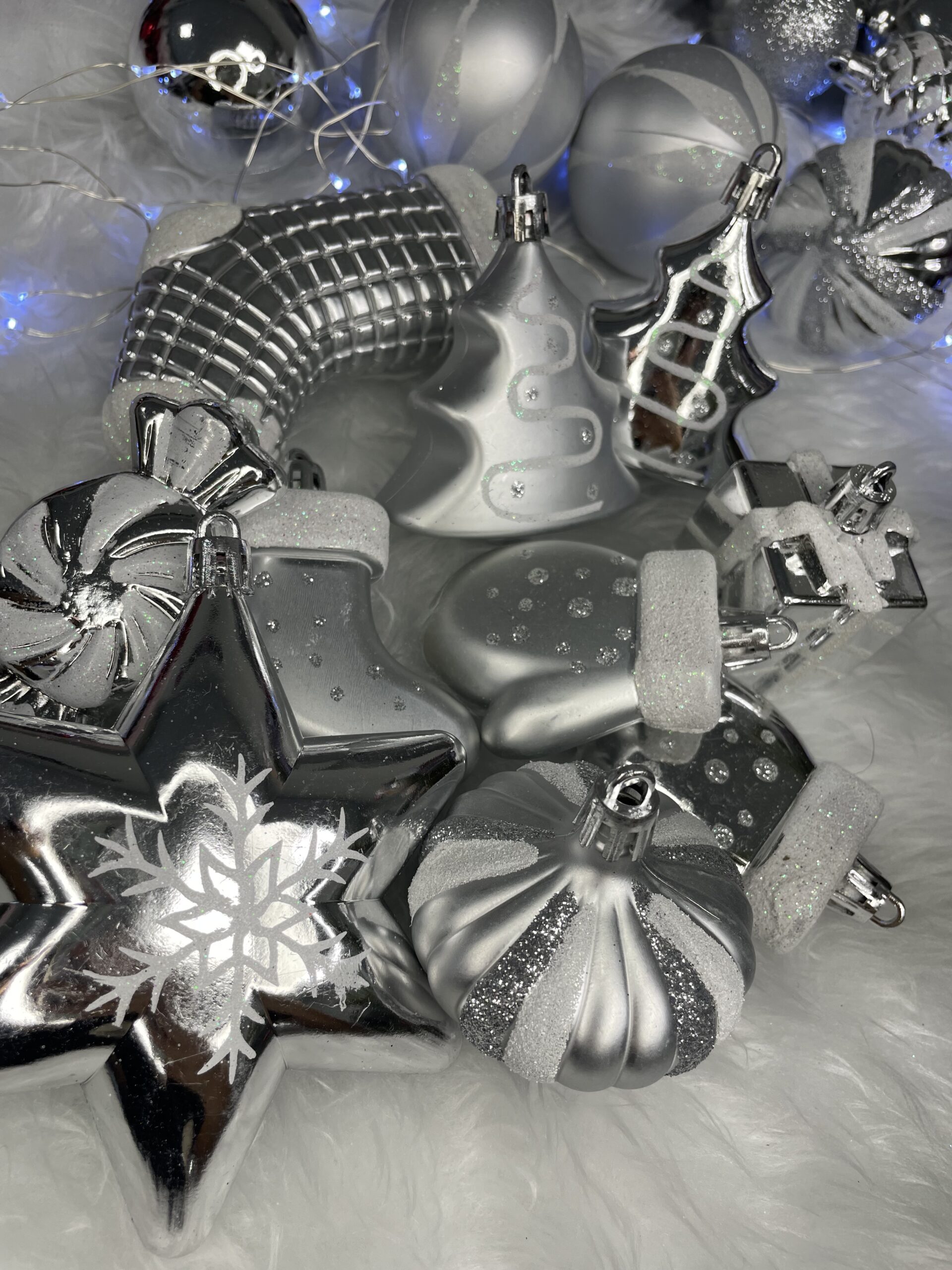 Set globuri si decoratiuni de Craciun, 77 piese, diverse dimensiuni, argintiu