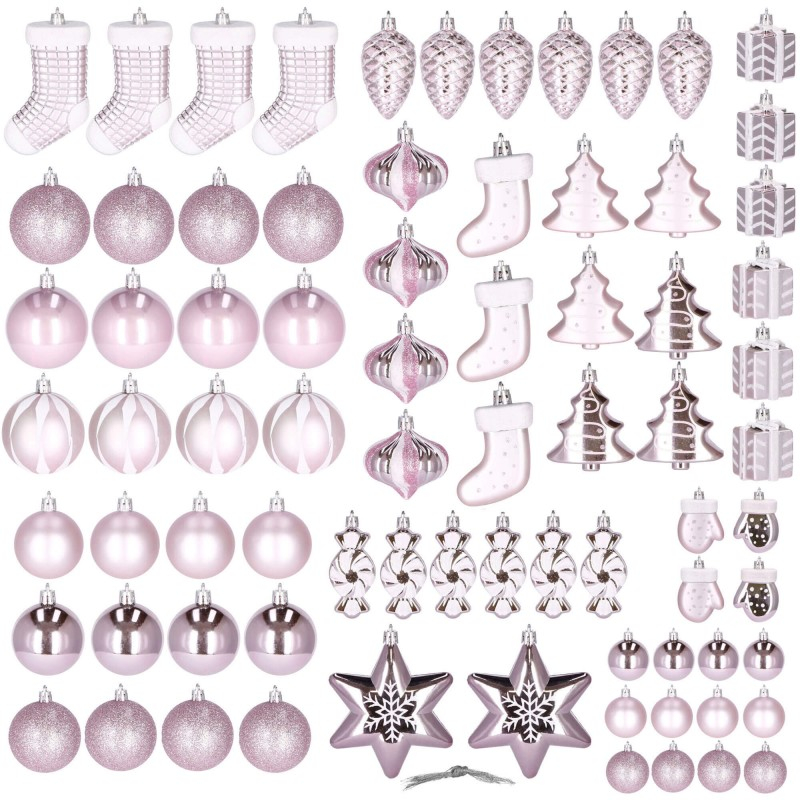 Set globuri si decoratiuni de Craciun, 77 piese, diverse dimensiuni, roz