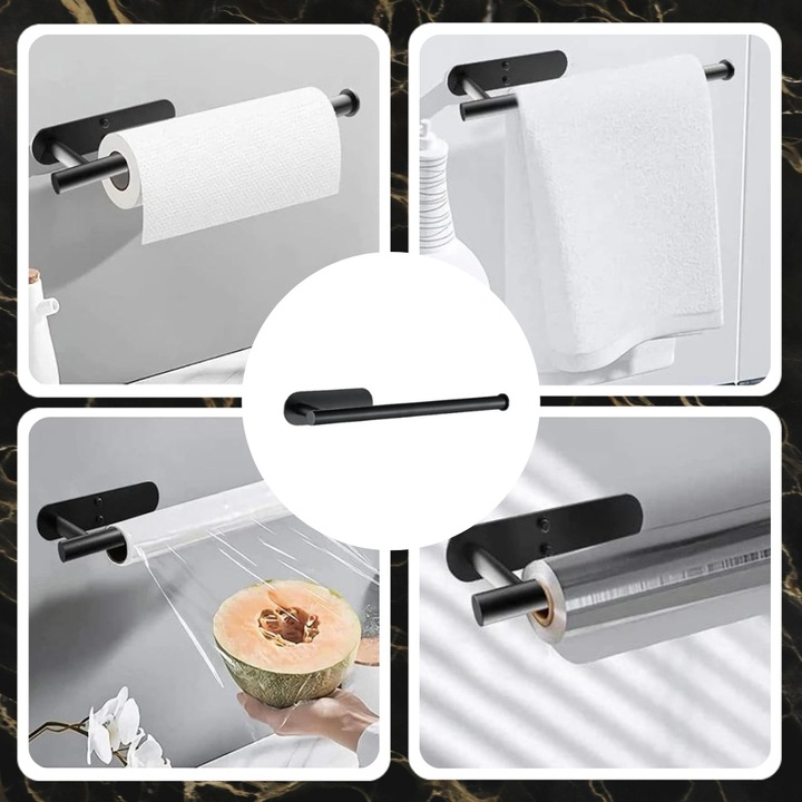 Material: otel inoxidabil Lungime: 33,5 cm Latime: 4,5 cm Adancime: 7 cm Culoare: negru Atasare: autoadeziva sau cu suruburi (incluse) Economisiti spatiu - Suportul pentru...