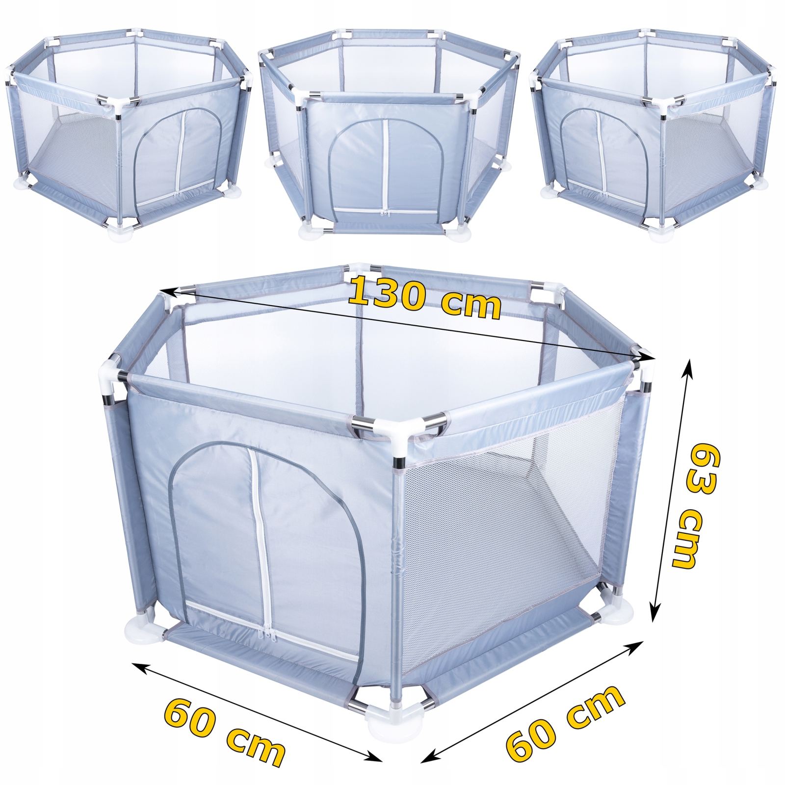 Specificatii tehnice: Diametrul exterior: 130 cm Diametru interior: 115cm Distanta dintre peretii opusi: 110cm Inaltime: 63 cm Latimea unui singur perete hexagonal: 60cm Material: tesatura oxford 150D Cadru metalic solid cu accesorii din plastic Intrare cu fermoar Atentie , bilele din plastic nu sunt incluse in pachet ! Tarcul pliabil, asigura ore de distractie fara sfarsit pentru unul sau mai multi copii. Cu parcul nostru, puteti crea un mediu de joaca sigur pentru copilul dumneavoastra. Vine cu pereti din plasa de ventilatie pentru o vizibilitate usoara si o usa cu fermoar pentru acces usor. Usor de asamblat si pus deoparte sau chiar de luat pentru vacante sau petreceri. In acest fel, veti avea intotdeauna o zona de joaca sigura. Copilul dvs. mic poate exersa statul in picioare si tararea in parc. El/ea poate sa se traga singur(a) si sa exerseze pasii in timp ce se joaca cu marginile din jur. Datorita diametrului sau mare si peretilor inalti, va permite o distractie grozava fara riscul de a varsa sau de a pierde mingi.