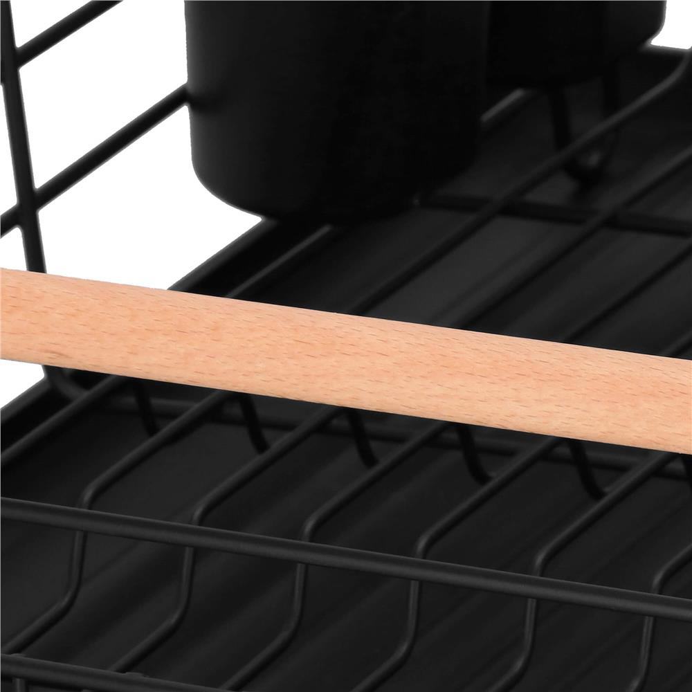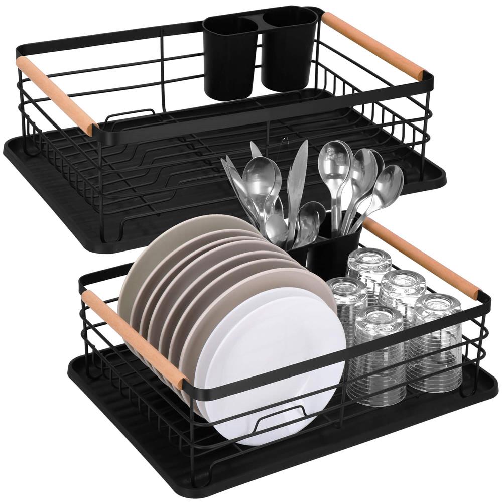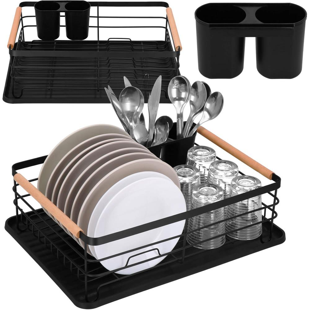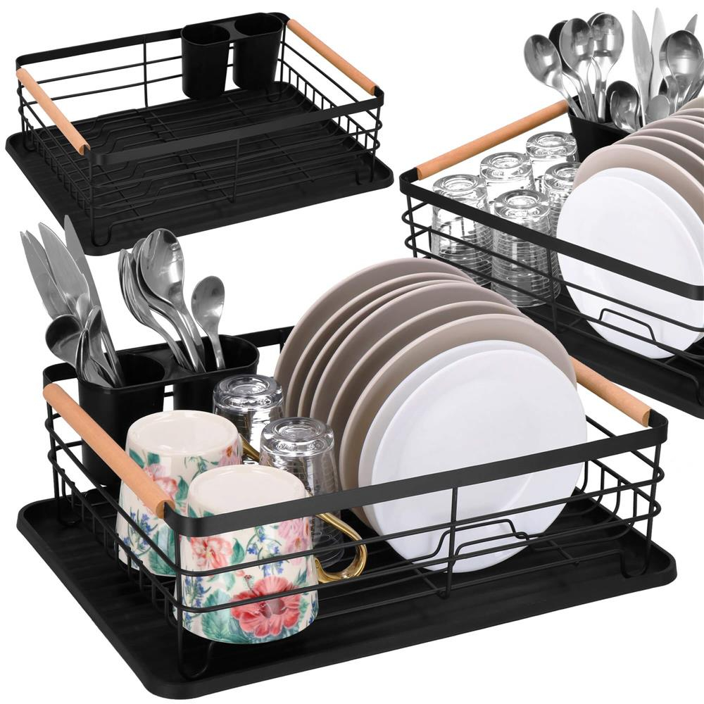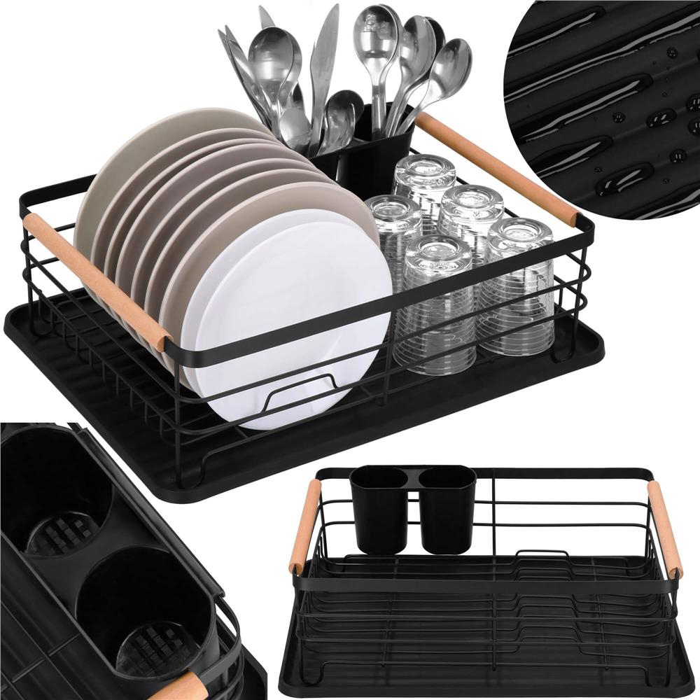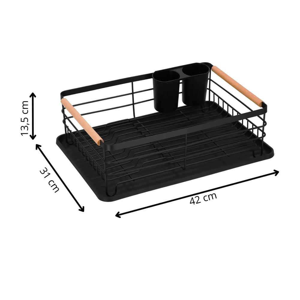 Uscator de vase cu suport tacamuri, din otel, cu tava de scurgere, manere lemn, 42x32x15cm, negru