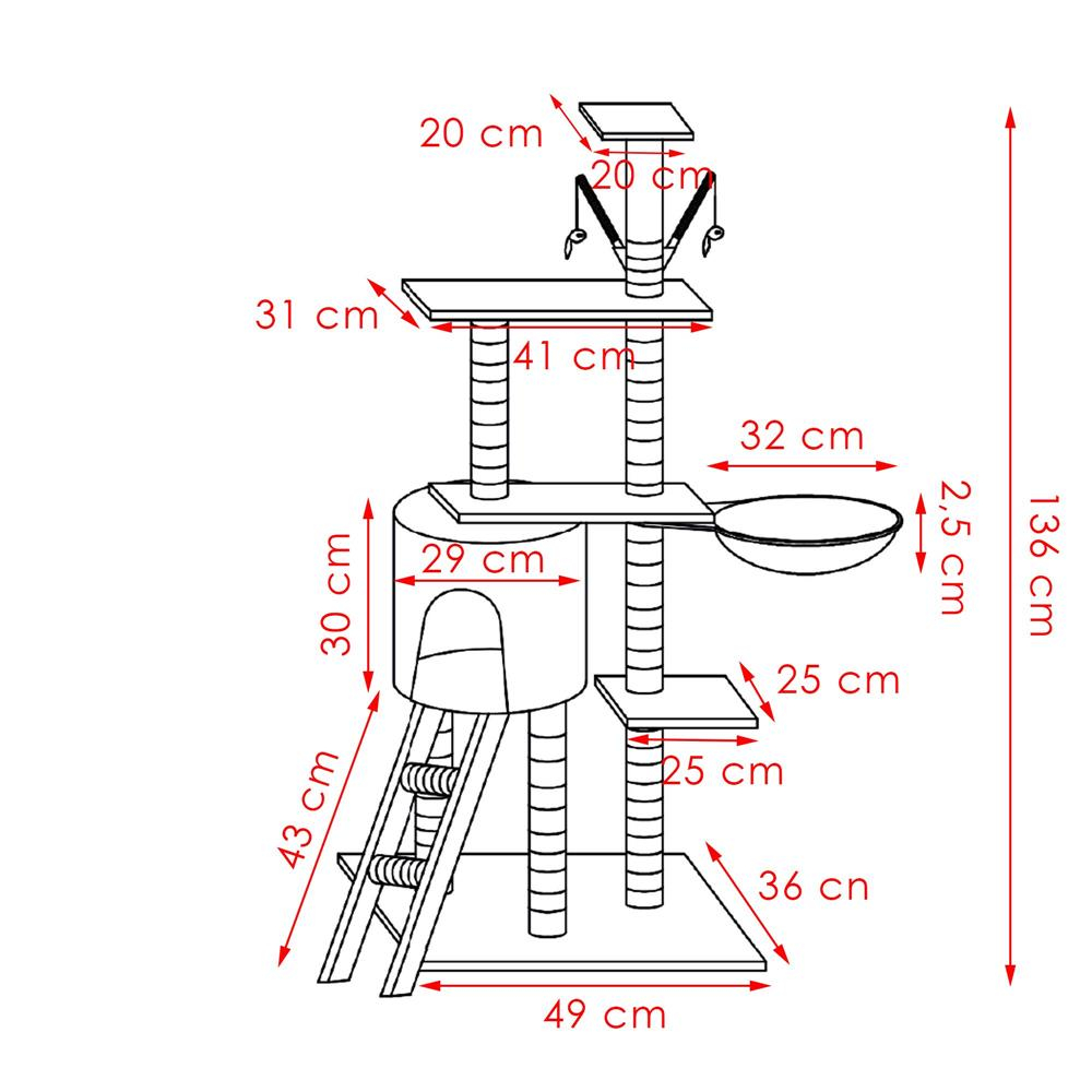Culoare: gri 8x nivele Numar de tuburi de constructie: 9 Dimensiuni: Inaltime totala: 136 cm Lungimea bazei: 49 cm Latimea bazei: 35 cm Grosimea bazei: 1,8 cm Cottage: 30 x 29 cm (diametru x inaltime) Grosimea bazei casutei: 1,5 cm Platforma 1: 25 x 25 cm Grosimea platformei: 1,5 cm Vizuina: 32 x 32 x 2,5 cm Grosimea marginii asternutului: 6 mm Platforma 2: 40 x 20 cm (lungime x latime) Grosimea bazei: 1,5 cm Scara: 43 x 19 cm Lungimea tuburilor la scara: 15 cm Grosimea tuburilor la scara: 15 cm: 4 cm Platforma 3: 41 x 31 cm (lungime x latime) Grosimea platformei: 1,5 cm Platforma 4: 20 x 20 cm (lungime x latime) Jucarii suspendate: min. 11 cm max. 23 cm (sfoara elastica) Grosimea pomponului: aprox. 4 cm Lungimea betelor de jucarie: 18 cm Lungimea atasamentului pentru bete: 4,5 x 1,8 cm (lungime x grosime) Lungimea tuburilor de constructie: 24,5 / 31 / 37 cm Grosimea tuburilor de constructie: 5 / 5,5 cm Aranjament: Inaltimea pana la baza casutei: 42 cm (masurata de la baza) Inaltime pana in partea superioara a casutei: 68 cm Inaltimea pana la vizuina: (cm) 68 cm Inaltimea pana la 1 platforma: 36 cm Inaltimea pana la a 2-a platforma: 69 cm Inaltimea pana la a treia platforma: 103 cm Inaltimea pana la a patra platforma: 136 cm Inaltimea de la 1 platforma la 2 platforma: 34 cm Inaltimea de la varful casei pana la a 3-a platforma: cm 35 cm Inaltimea de la partea de jos a barlogului pana la a 3-a platforma: cm: 45 cm Inaltimea de la a 3-a platforma la a 4-a platforma: cm: 45 cm 33,5 cm Inaltimea de la platforma 1 pana la barlog: 33 cm Inaltimea de la baza scarii la baza casei: 46 cm Vrei ca pisica ta sa se distreze la nesfarsit intr-un loc placut si relaxant? Aceasta este implinirea celor mai profunde vise atat ale proprietarilor, cat si ale animalelor lor de companie - un stalp de zgarieturi pe mai multe niveluri! Stabilitate: stalpul este proiectat pentru o stabilitate neclintita. Pisica ta poate sa se catere, sa sara si sa zgarie fara griji. Design pe mai multe niveluri pentru joc optim: locul de joaca ofera nu doar unul, ci mai multe niveluri de explorat. Pisica ta poate urca pe varfuri si cobori in adancuri, descoperind noi perspective de joaca si relaxare. Placut la atingere: realizat dintr-un material exceptional de placut la atingere, stalpul de zgariere ofera labei pisicii sensibilitatea si confortul de care are nevoie. Durabilitate: realizat din material durabil, va rezista nu numai la zgarieturile de zi cu zi, ci si la multe luni de utilizare intensiva, asigurand durabilitate ani de zile. Distractie si bucurie: Cu o varietate de niveluri si locuri ascunse de explorat, pisica ta va gasi o multime de moduri de a petrece timp activ si distractiv. Materiale naturale, sigure pentru pisici: sfoara din jurul stalpilor este fabricata din sisal, o fibra tare si foarte durabila. Acesta este cu siguranta momentul potrivit pentru a oferi pisicii tale iubite un loc ideal de dezvoltare, joaca si odihna. Locul nostru de joaca nu este doar o piesa de mobilier, este o oaza de placere pentru animalul tau de companie.