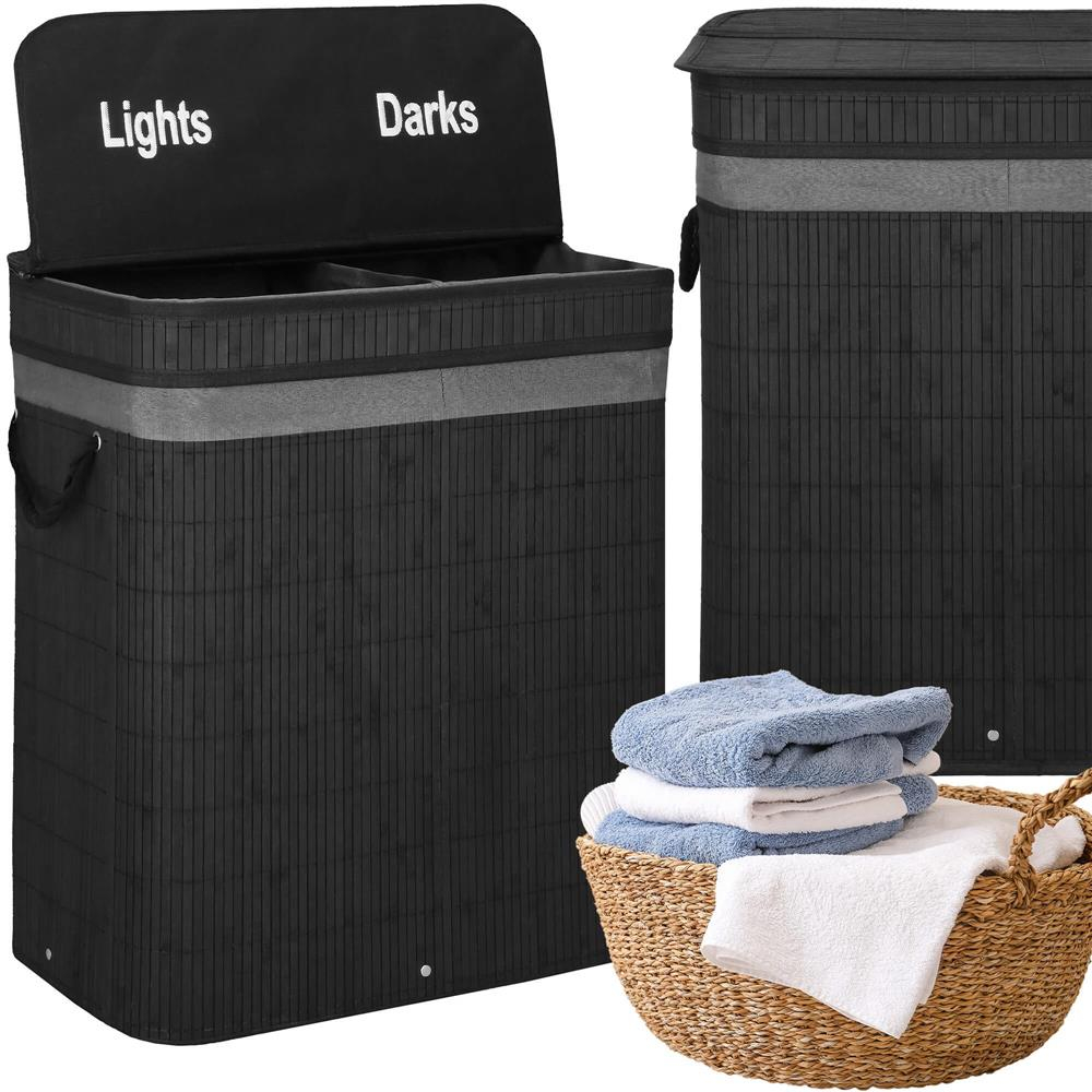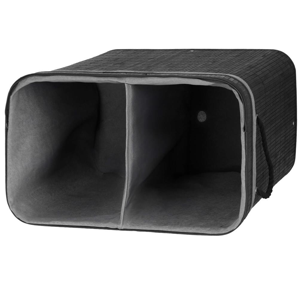 Cos de rufe din bambus cu capac, 2 compartimente, sac detasabil, volum 100L, 54x35x60cm, negru