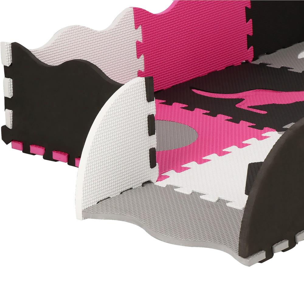 Material: spuma EVA Design: Forme Culoare: alb, gri, roz, negru Numar de puzzle-uri: 9 Numar de margini: 12+4 mai mici Numarul tuturor elementelor: 34 (puzzle, umplutura de puzzle, margini) Dimensiuni atunci cand este desfasurat, cu marginile plate: 120x120 cm Dimensiunea puzzle-ului: 30x30 cm Dimensiunea marginii: 30x15 cm Grosime: 1 cm Bordura cu optiune de montare plana si verticala Dimensiunea atunci cand este pliat: 30x30x20 cm Un covoras din spuma cu un design educativ este perfect pentru camera unui copil. Va stimula imaginatia copiilor, ii va proteja de solul rece in timpul jocului sau le va permite sa construiasca structuri dupa propriile idei. In plus, este ideala pentru copiii care abia invata sa stea in picioare sau care stau nesigur si inca mai cad sau se rastoarna uneori in timpul jocului. Material netoxic Izoleaza impotriva solului rece Nu absoarbe apa Usor de curatat Durabil Stimuleaza creativitatea Amortizeaza miscarile copilului Posibilitatea de a construi un cub din puzzle Ocupa foarte putin spatiu atunci cand este pliat Covorasul din spuma este format din 34de elemente (puzzle-uri, umplutura de puzzle si margini), care, atunci cand sunt unite, vor crea un nou loc de joaca preferat pentru cei mai mici membri ai familiei. Covorasul este fabricat din material netoxic si are o grosime de pana la 1 cm, asigurand o izolare excelenta fata de solul rece, dar si amortizand miscarile unui copil care abia invata sa mearga. Puzzle-urile pliabile sunt o modalitate excelenta de a va distra creativ si captivant. Piesele detasabile sunt perfecte pentru a se juca cu recunoasterea formelor – cel mic poate scoate piesele si le poate potrivi fara niciun ajutor. Datorita faptului ca puzzle-urile pot fi asezate atat pe plat, cat si pe verticala, ele pot fi folosite, de exemplu, pentru a crea un parc de joaca.