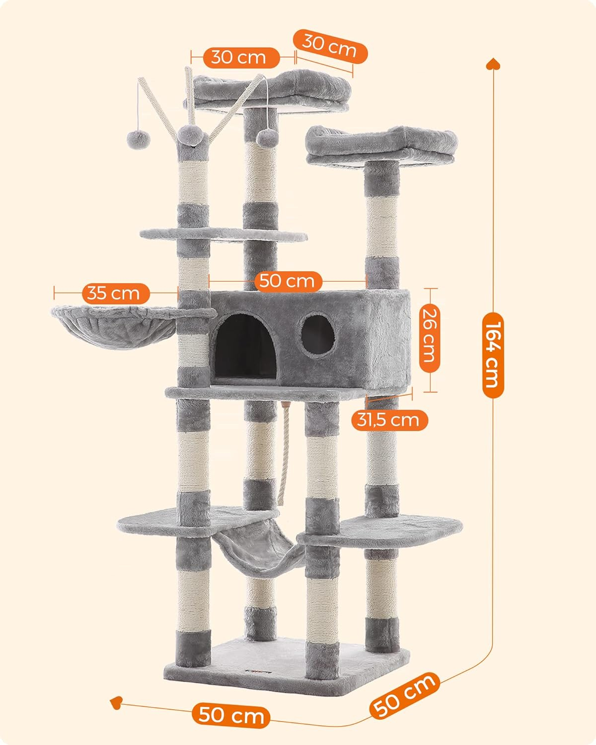 FEANDREA Ansamblu de joaca pentru pisici, tip copac, cu 3 culcusuri, hamac si ascunzatoare, 50x50x164cm, gri deschis