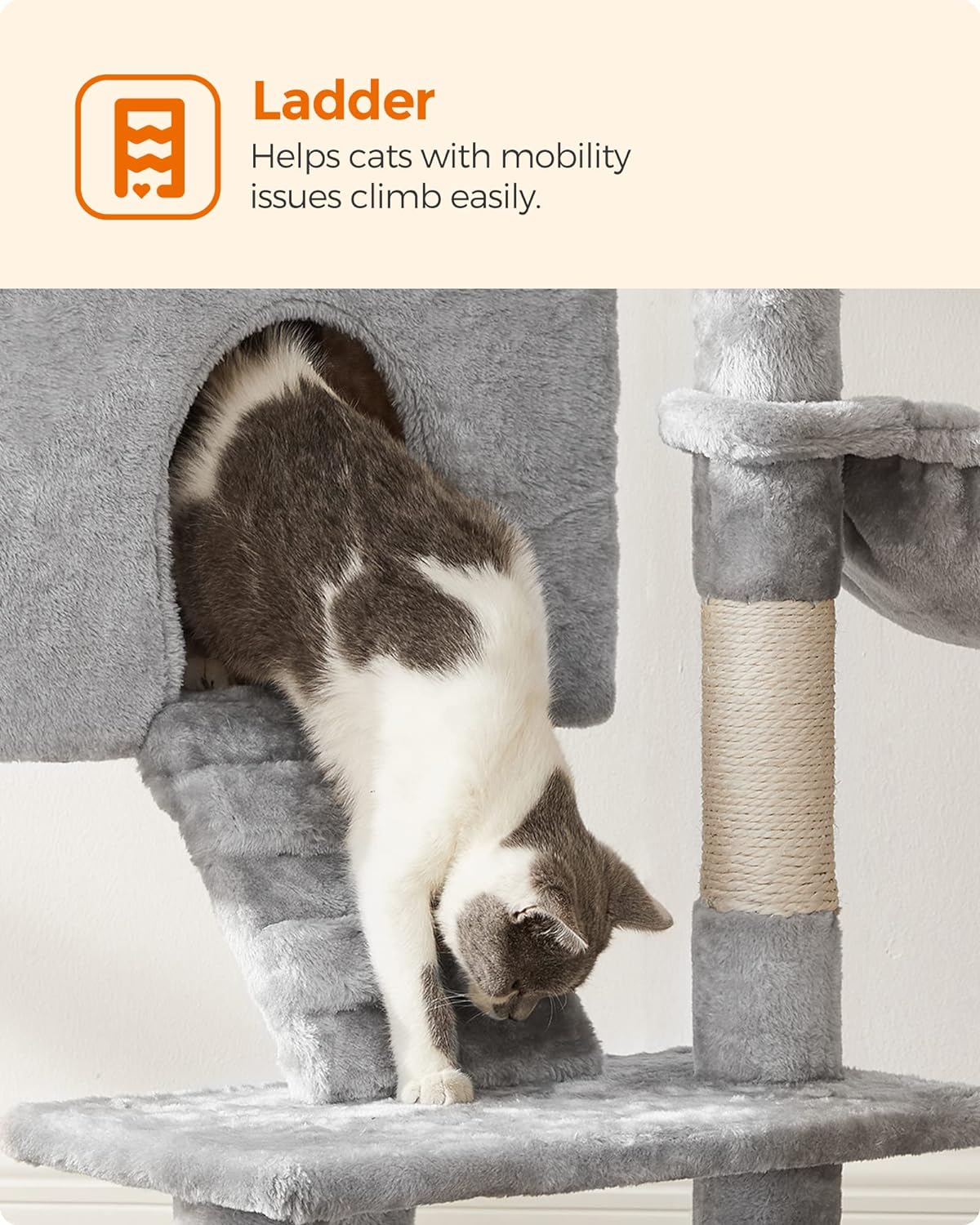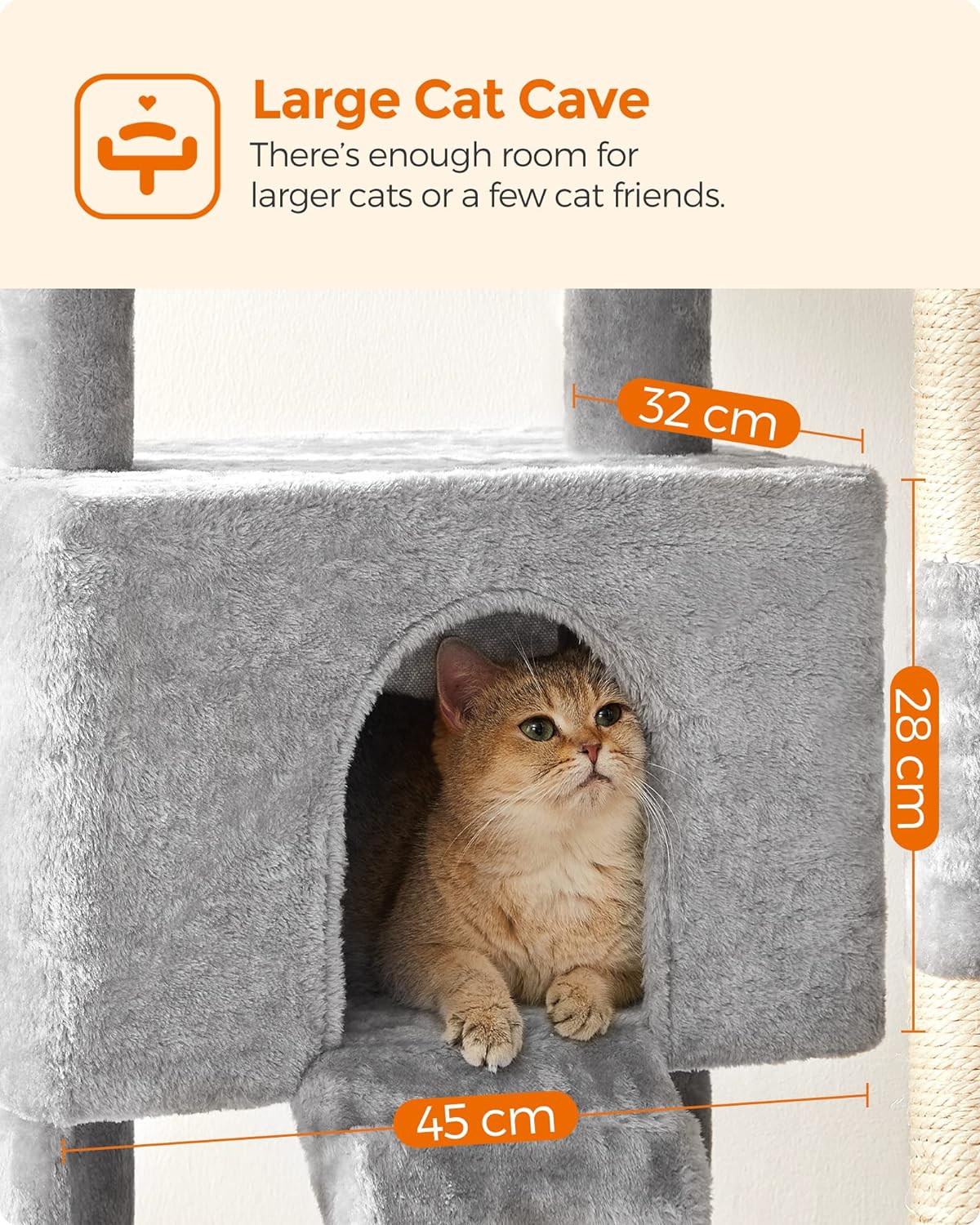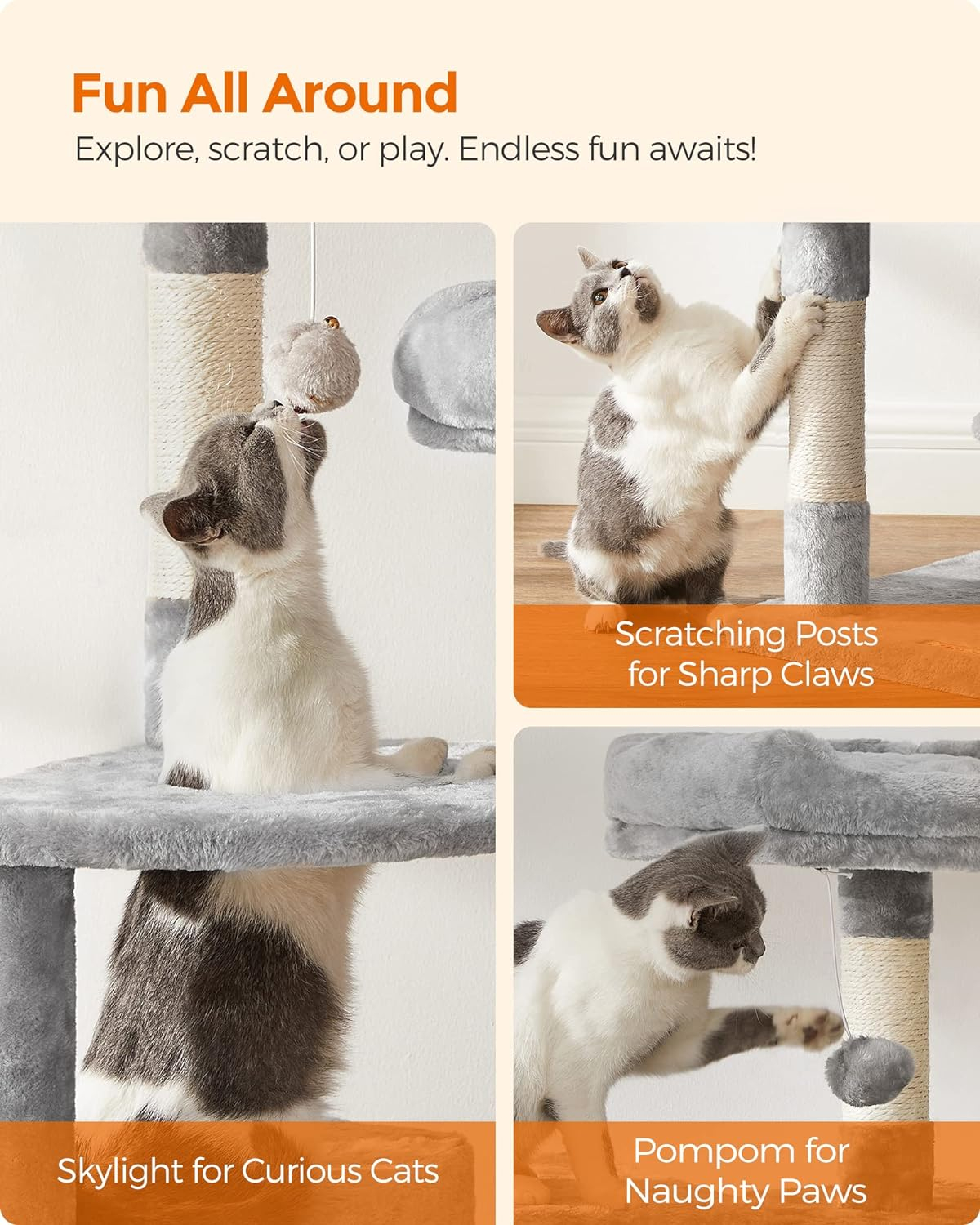 FEANDREA Ansamblu de joaca pentru pisici, tip copac, cu 3 culcusuri si ascunzatoare, 50x45x142cm, gri deschis