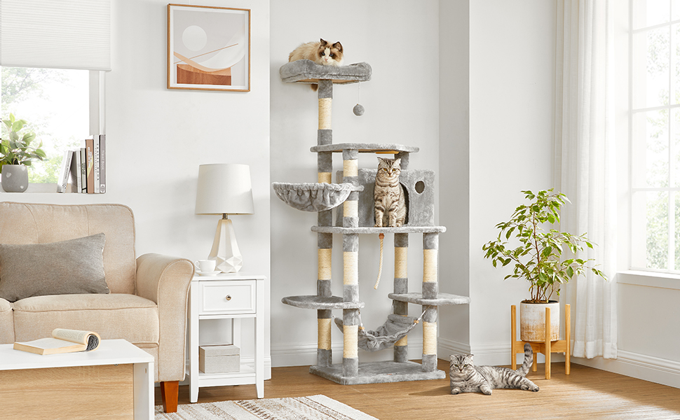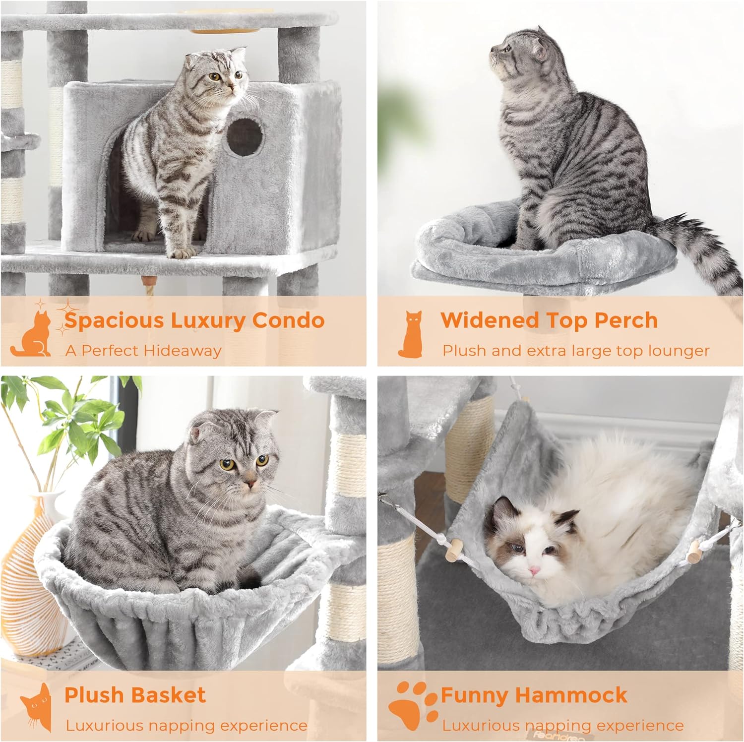 Specificatii: Culoare: Gri deschis Material: PAL, Plush, Sisal Dimensiunea produsului: 55 x 50 x 164 cm Greutate produs: 18,5 kg Despre acest articol Pisicilor mandre cu blana nu le place cand colegul lor de camera le fura mancarea. De aceea exista un castron exclusiv pentru hrana sus, pe acest copac de zgariere.Pentru pisici mici si pisici pufoase si dolofane: daca aveti o familie intreaga de pisici acasa sau daca tigrul dvs. de casa a devenit un pic dolofan, hamacul foarte mare, pestera de dormit, cosul dragalas si numeroasele platforme ofera mult spatiu.Acum, mai stabil: indiferent daca o pisica Ragdoll musculoasa sau o pisica Savannah mare se plimba prin casa ta, acest copac pentru catarare ofera o stabilitate suplimentara datorita dispozitivelor anti-rasturnare, unei baze intarite cu benzi de lemn si stalpi robusti din sisal.Pisica ta se poate retrage pe platforma de vizionare tapitata dragalas, daca agitatia din casa ta devine prea mare pentru ea sau daca vrea sa se odihneasca dupa o vanatoare de soareci salbatici.