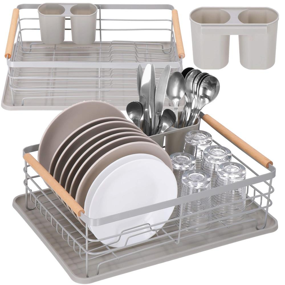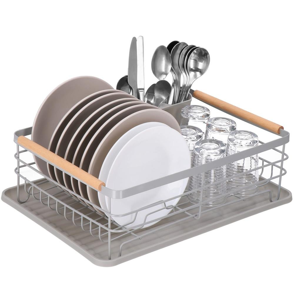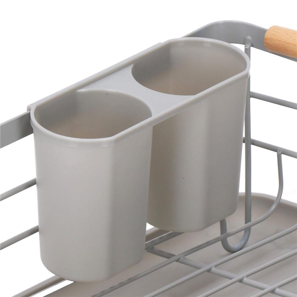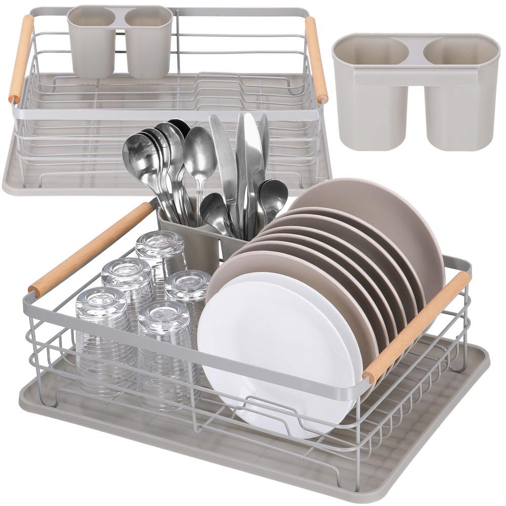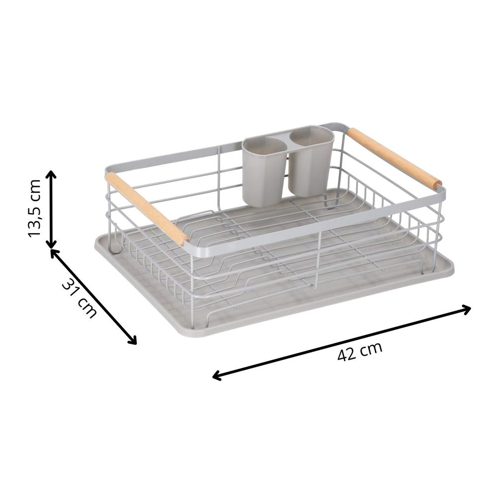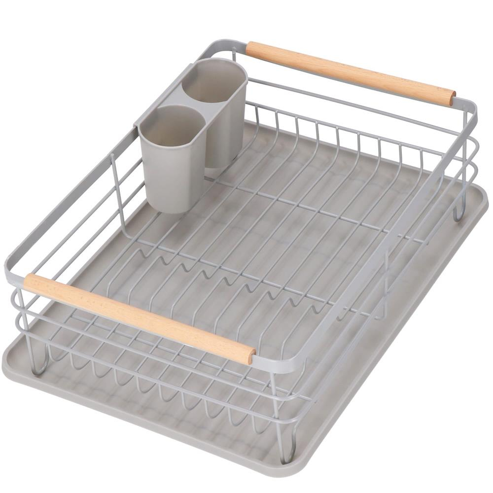 Uscator de vase cu suport tacamuri, din otel, cu tava de scurgere, manere lemn, 42x32x15cm, gri