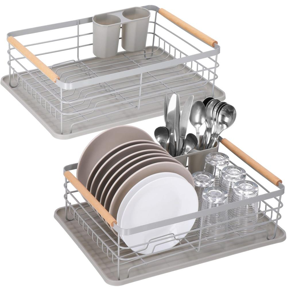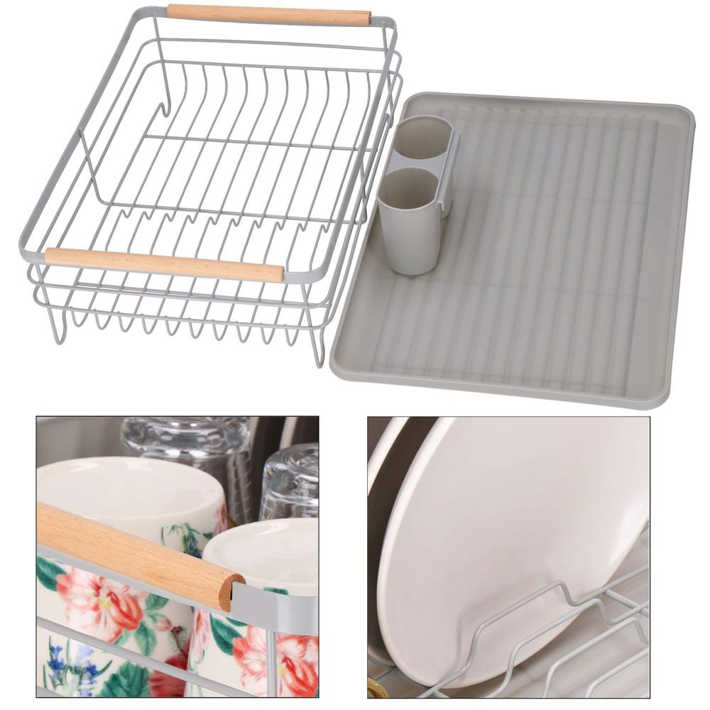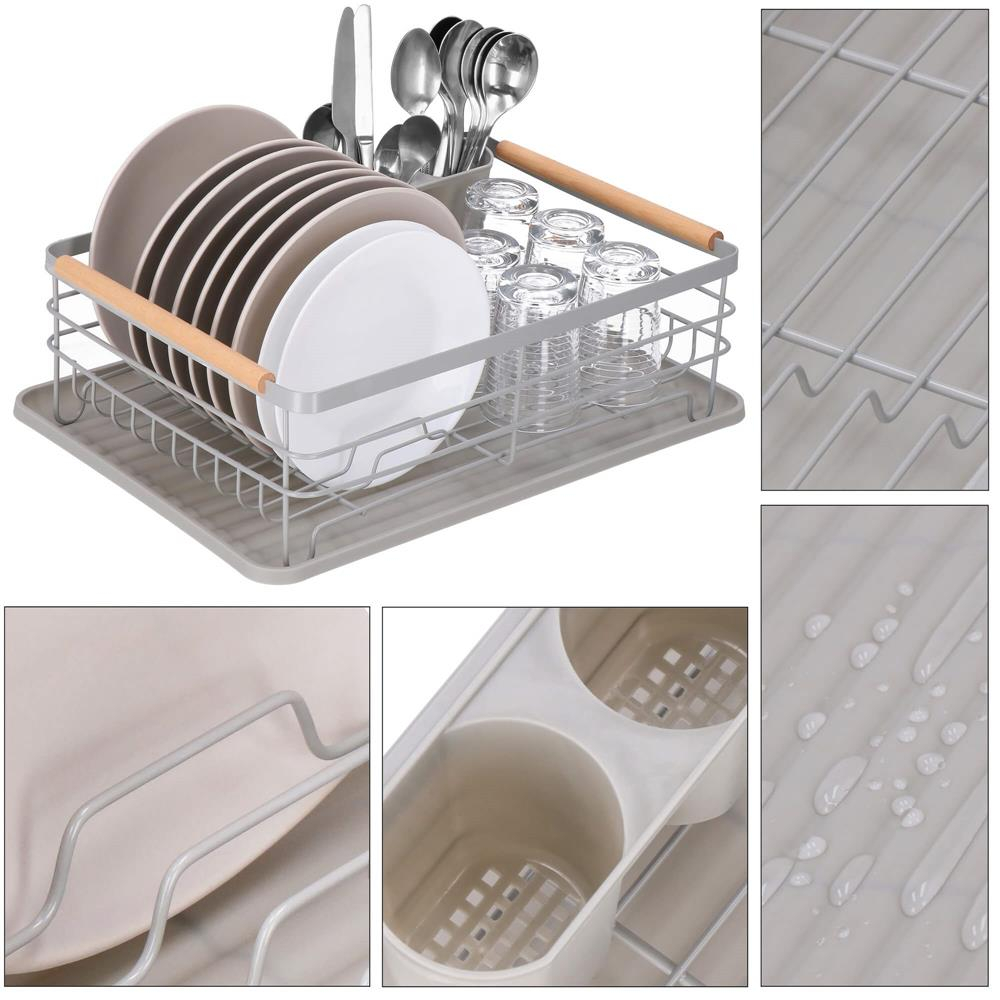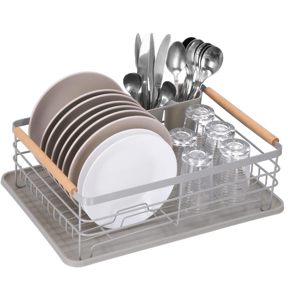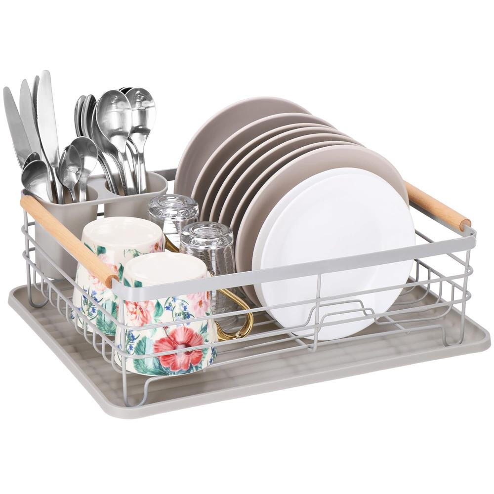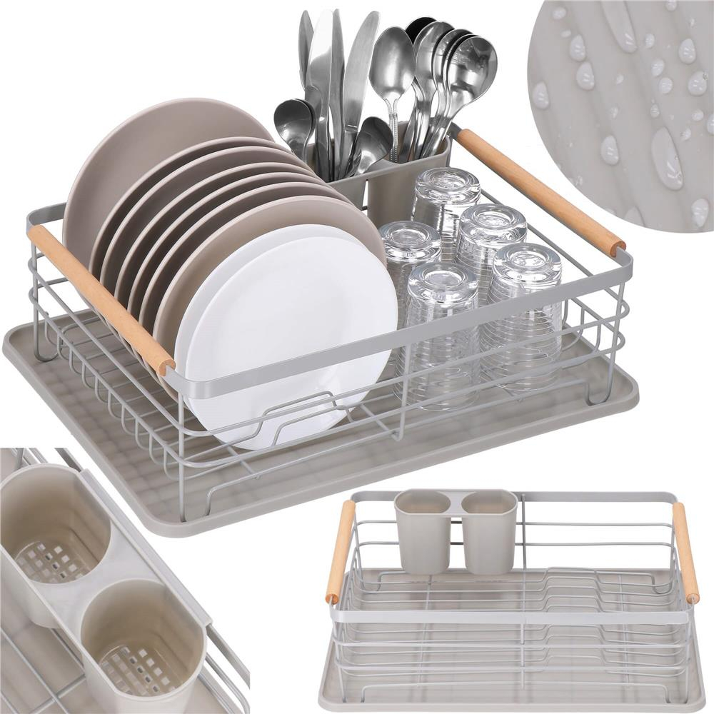 Uscator de vase cu suport tacamuri, din otel, cu tava de scurgere, manere lemn, 42x32x15cm, gri
