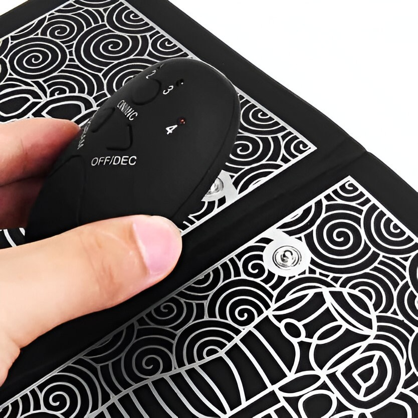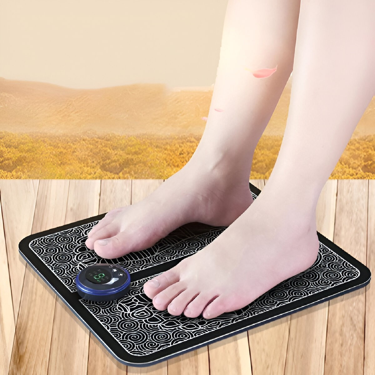 Așezați-vă picioarele goale pe pernuța de silicon a stimulatorului. Aparatul de masaj începe să emită impulsuri electrice de joasă frecvență care stimulează mușchii picioarelor, îi relaxează și le oferă un masaj plăcut.