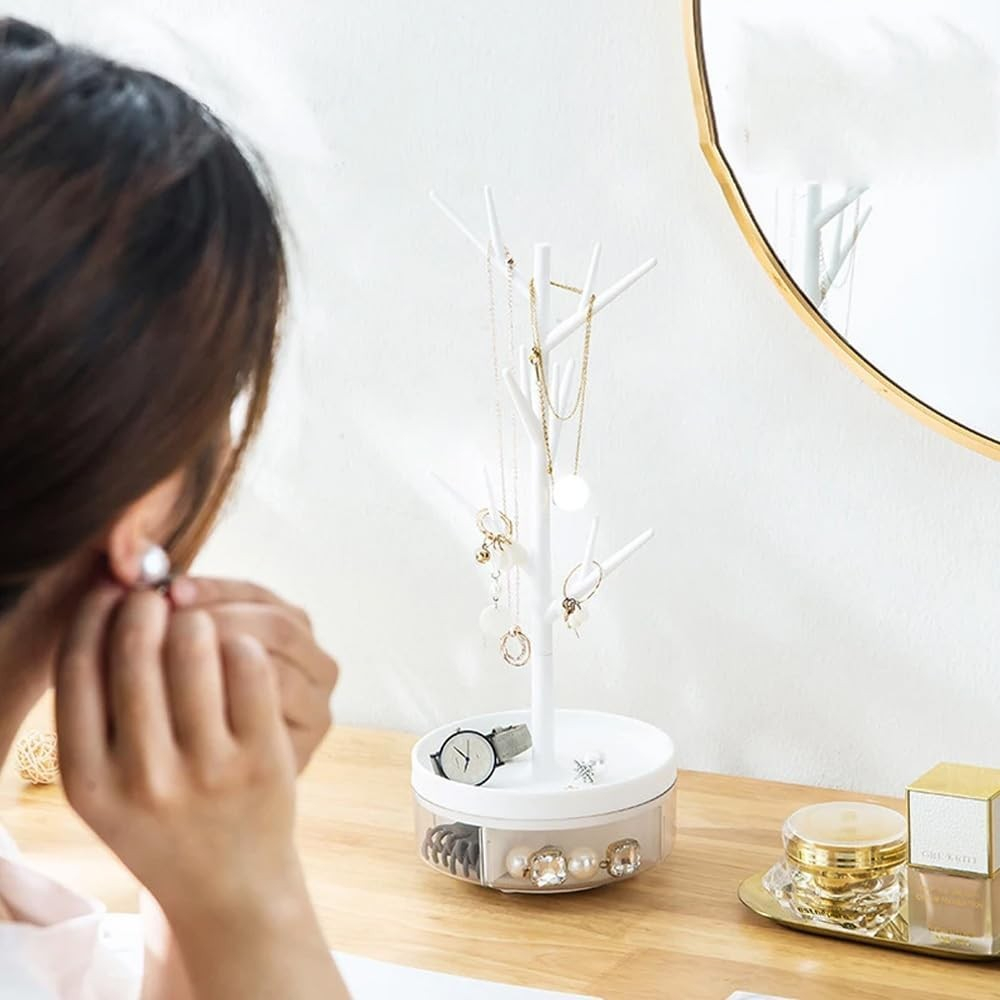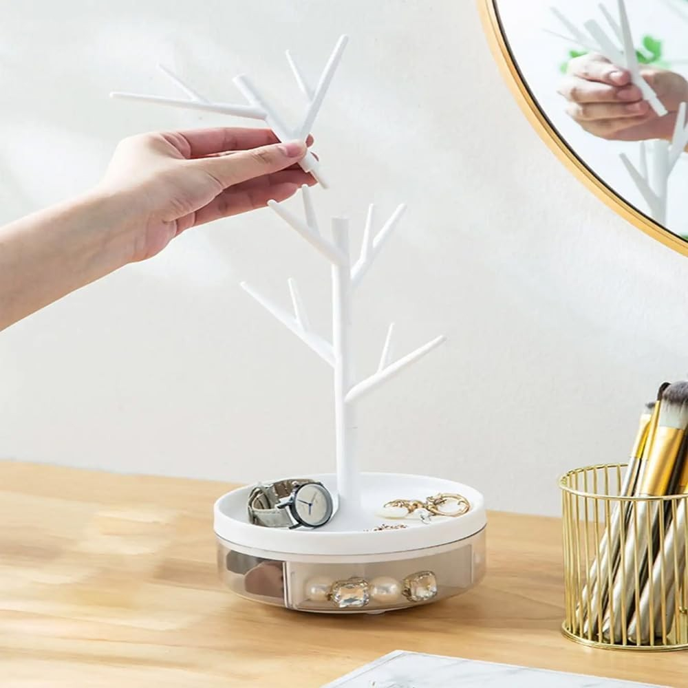 Această cutie de bijuterii are un design rotativ, elegant și funcțional, proiectată în formă de copac, cu ramuri care permit agățarea colierelor, brățărilor, inelelor și altor accesorii. Partea inferioară este echipată cu o tavă de depozitare cu 4 compartimente separate, ceea ce oferă spațiu suplimentar pentru organizare.